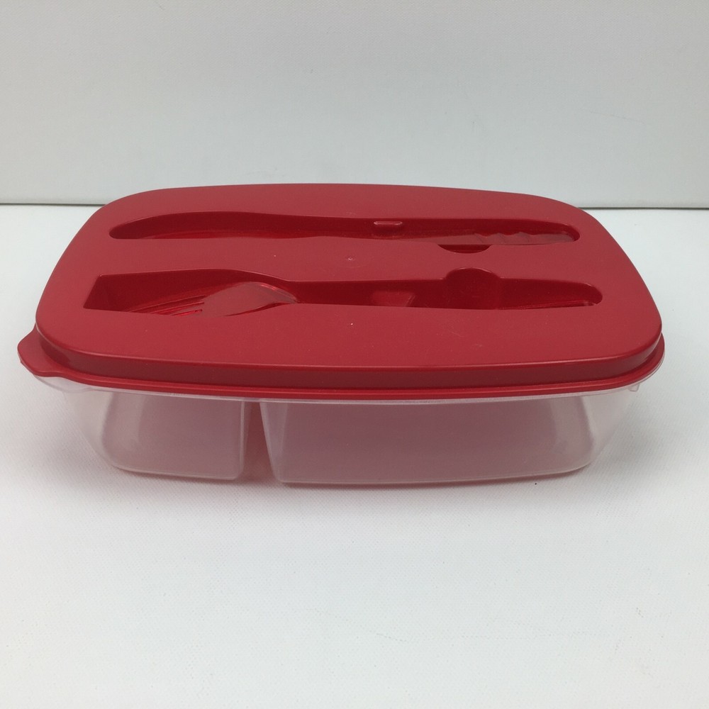 Red Divided Lunch Box Food Container Fork & Knife BPA Free 2" tall 6" wide...