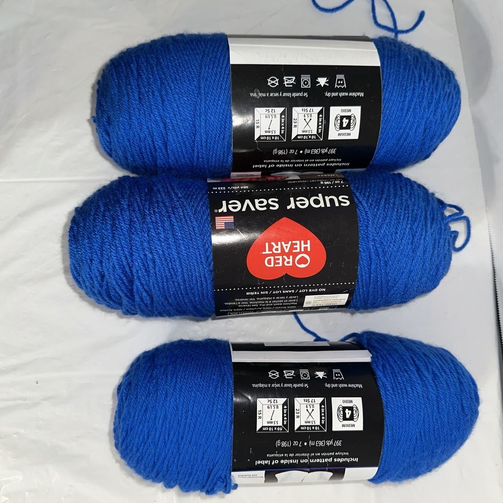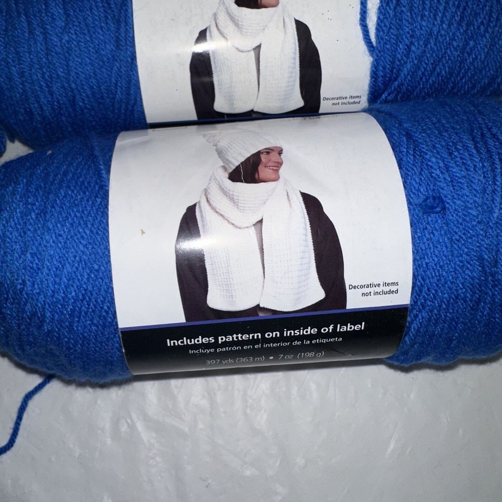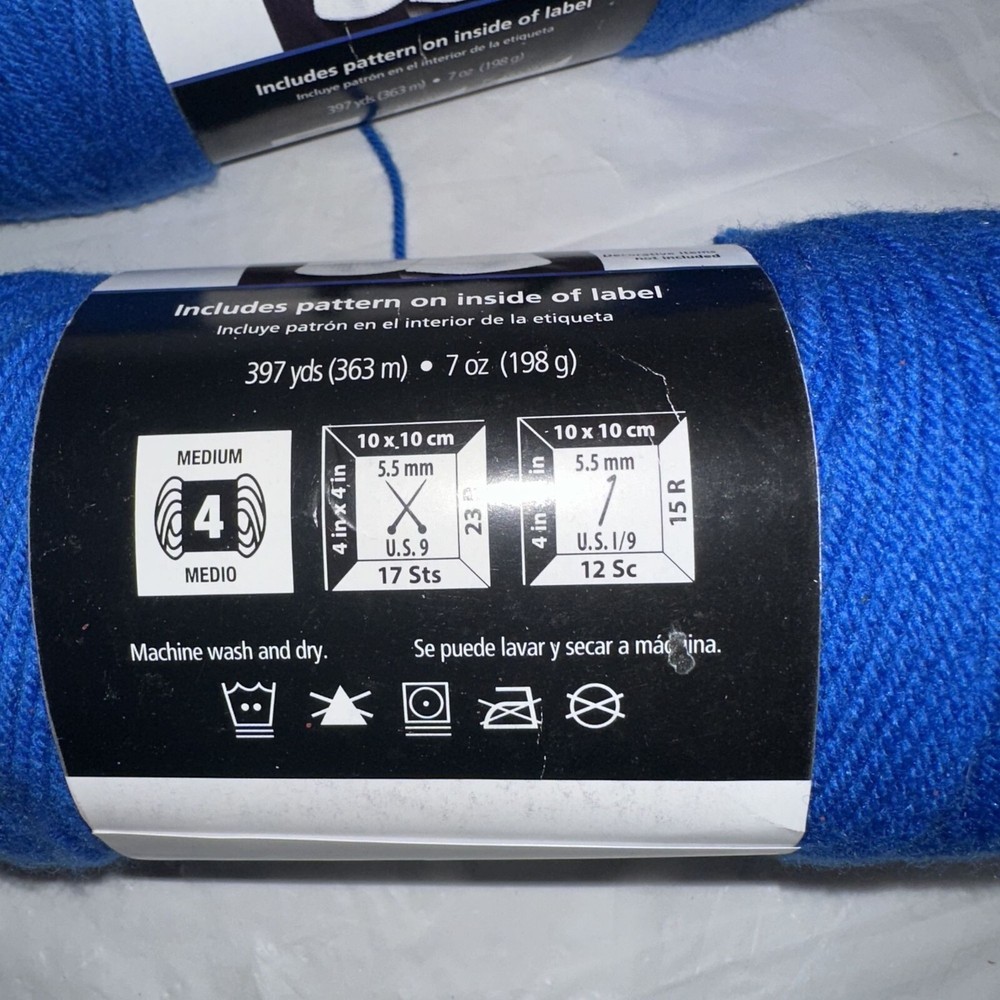 This yarn set includes three skeins of medium-weight yarn in royal blue, ideal for knitting or crochet projects. Each skein provides ample material for crafting and includes a pattern on the label. • Three skeins, 7oz each • Medium 4 weight yarn • Machine washable & dryable • 364-397 yards per skein No flaws noted. Measurements: Each skein - 7oz, 364-397 yards.