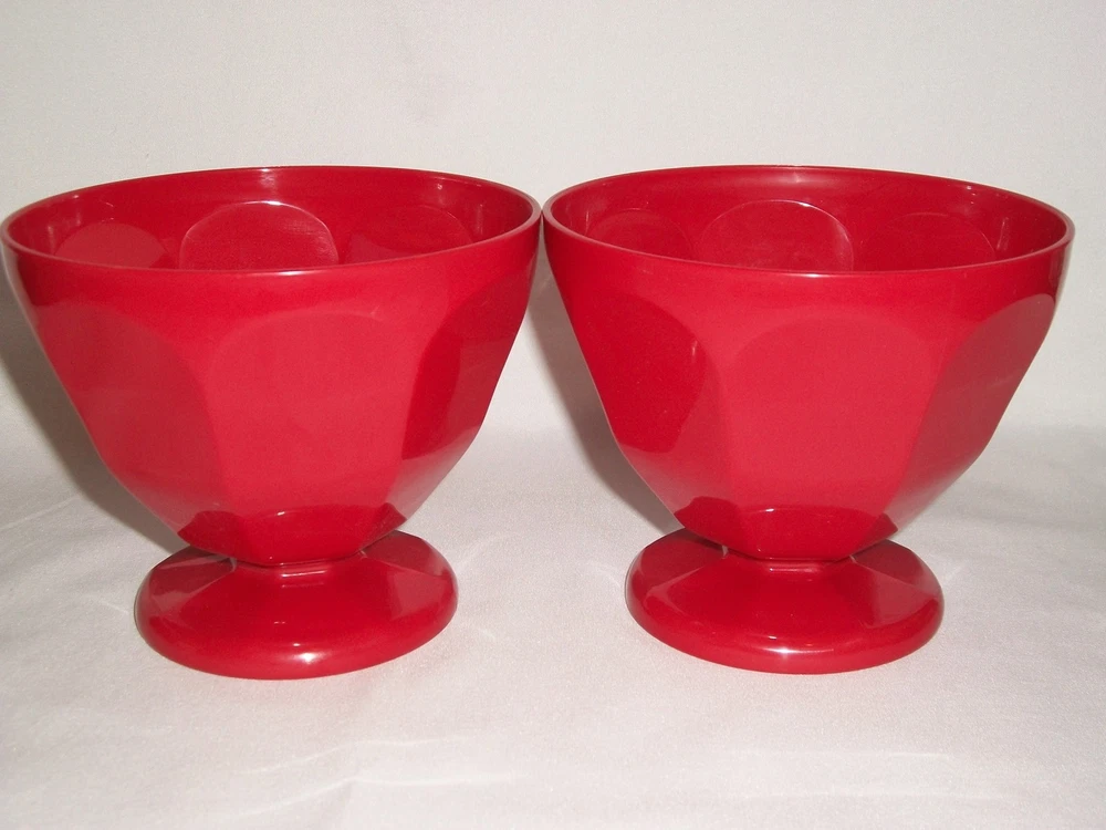 Red Kitchen Set of 6 Plastic 17oz Ice Cream Sundae Bowls Dessert Picnic Pool BBQ This is a great set of six plastic ice cream bowls in a fabulous cheerful red color. 4" tall 4.75" diameter Will hold up to 17 ounces Great for those outdoor pool parties or picnics BPA Free Top shelf dishwasher safe Not microwave safe