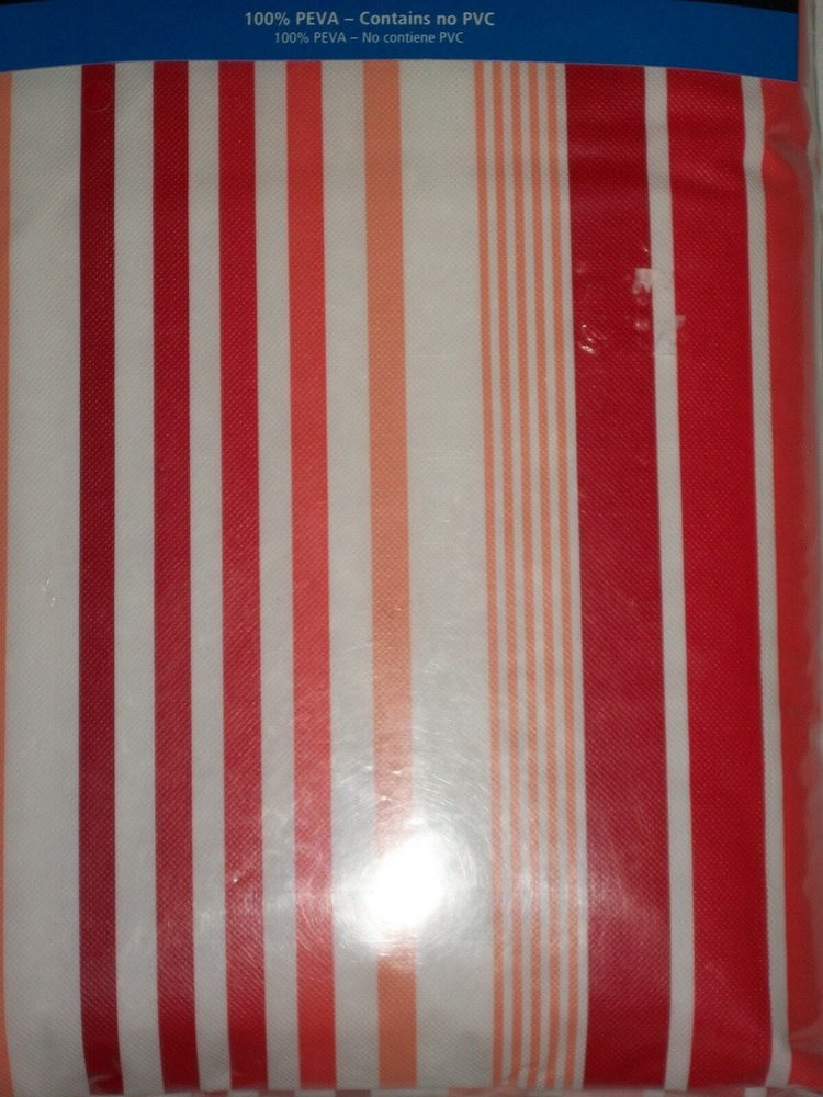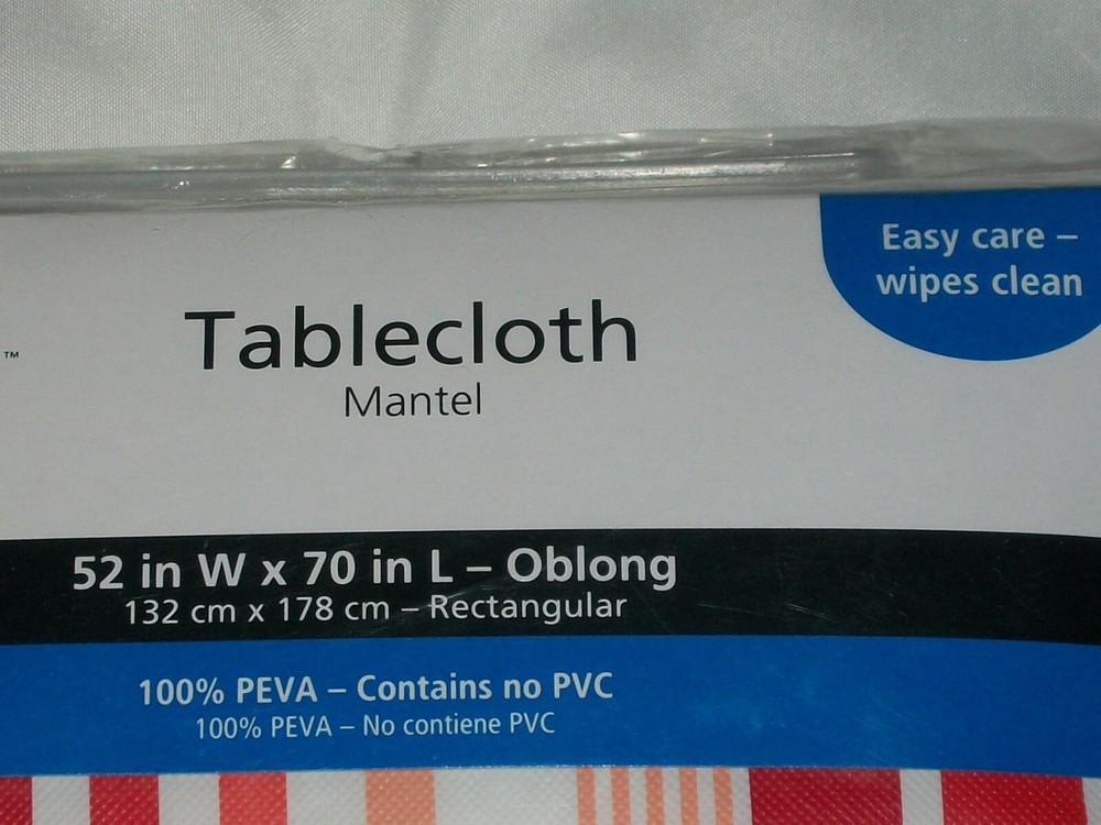 Red Orange White Stripe Vinyl Oblong 52 X 70 Tablecloth Outdoor Picnic Summer This tabelcloth is a nice way to brighten up your summer table. Measures 52"x70" Fits Table Size 28in X 46in - 40in X 54in, seating 4-6 100% Peva front, 100% polyester back Easy care, PVC free