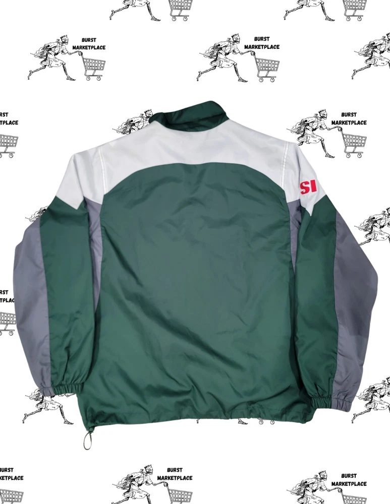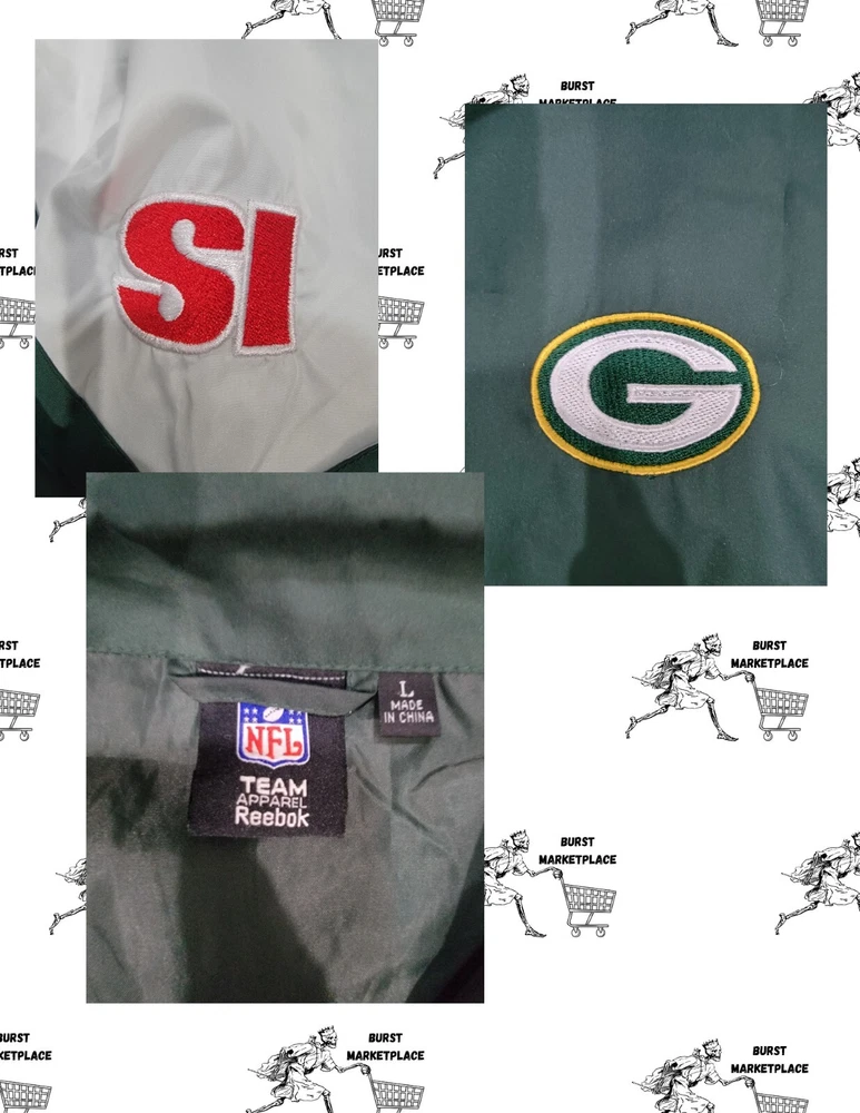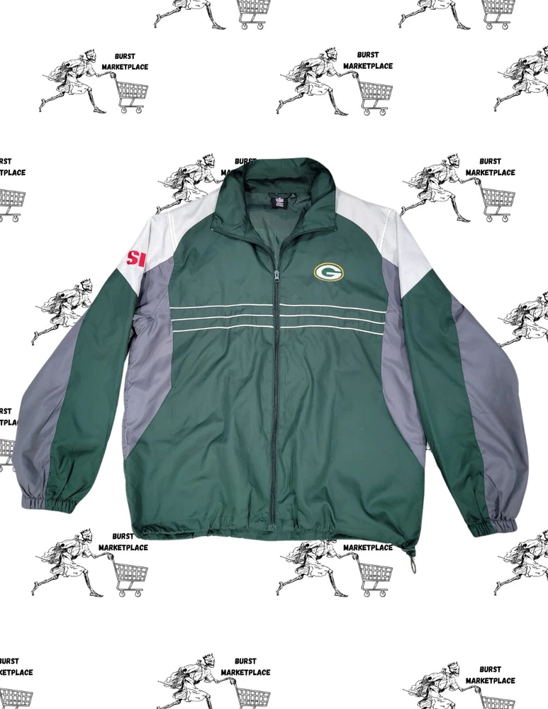 Sport your team spirit with the Reebok Vintage 90s Green Bay Packers Sports Illustrated Track/wind Jacket. A must-have for any die-hard NFL fan, this jacket celebrates your favorite team with its striking green color and bold team logo. The unisex design makes it a versatile addition to any fan's wardrobe, perfect for game days or casual outings. Crafted for both comfort and style, this size large jacket is an officially licensed NFL product, ensuring authenticity and quality. Whether you're cheering from the stands or representing your team on the streets, this jacket is an excellent way to show your Green Bay Packers pride.