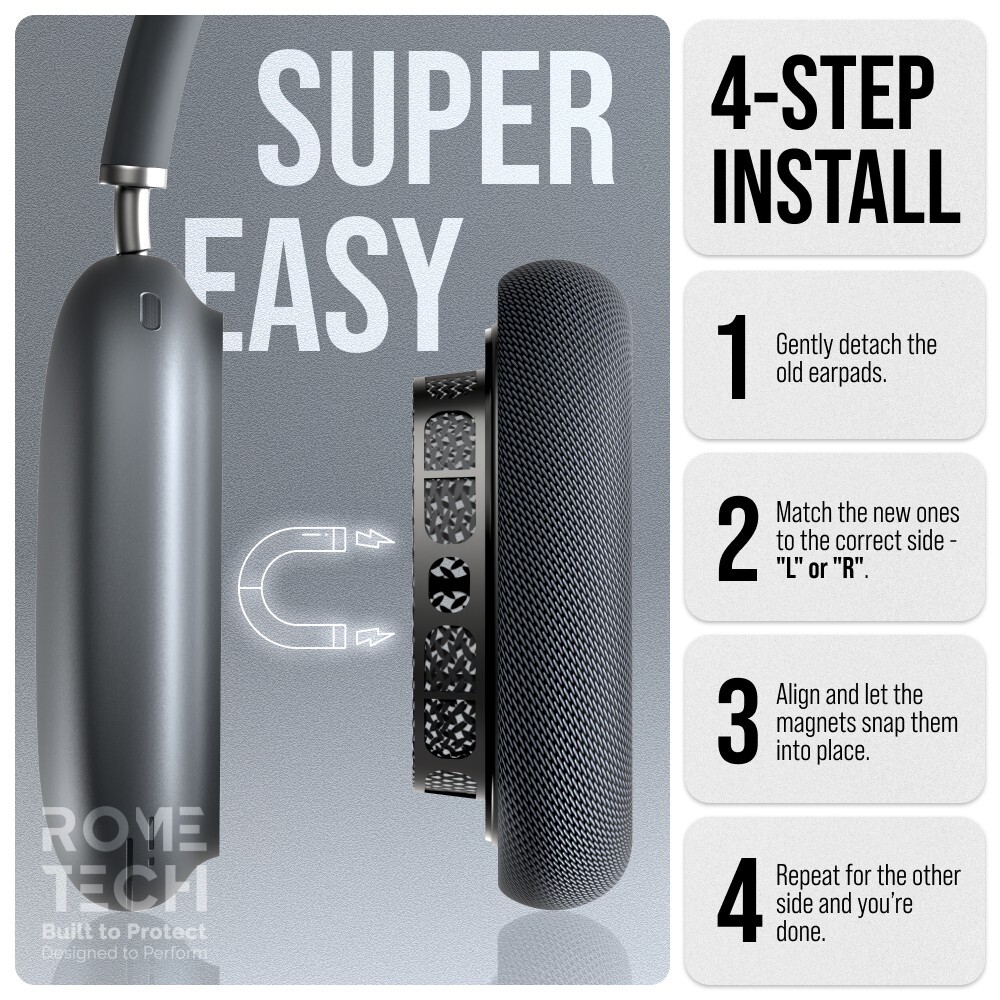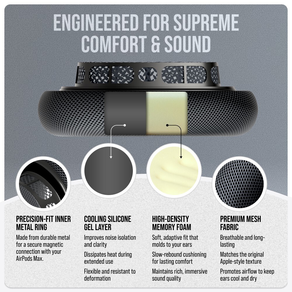 Precision Fit : Designed using original AirPods Max, these replacement ear cushions guarantee an exact and secure fit with your headphones . High-End Construction : Crafted from durable mesh fabric and premium foam, with an integrated silicone layer to support the original noise cancellation functionality. Audio Integrity Restored : Aging cushions can compromise sound quality. Our replacements are engineered to preserve and revitalize the rich, detailed audio your AirPods Max are known for. Quick and Simple Installation : Replace your ear cushions in under 30 seconds —no tools or special skills required. Commitment to Quality : We continuously refine our products to ensure comfort and performance. If you experience any issues, we offer prompt replacements or full refunds.