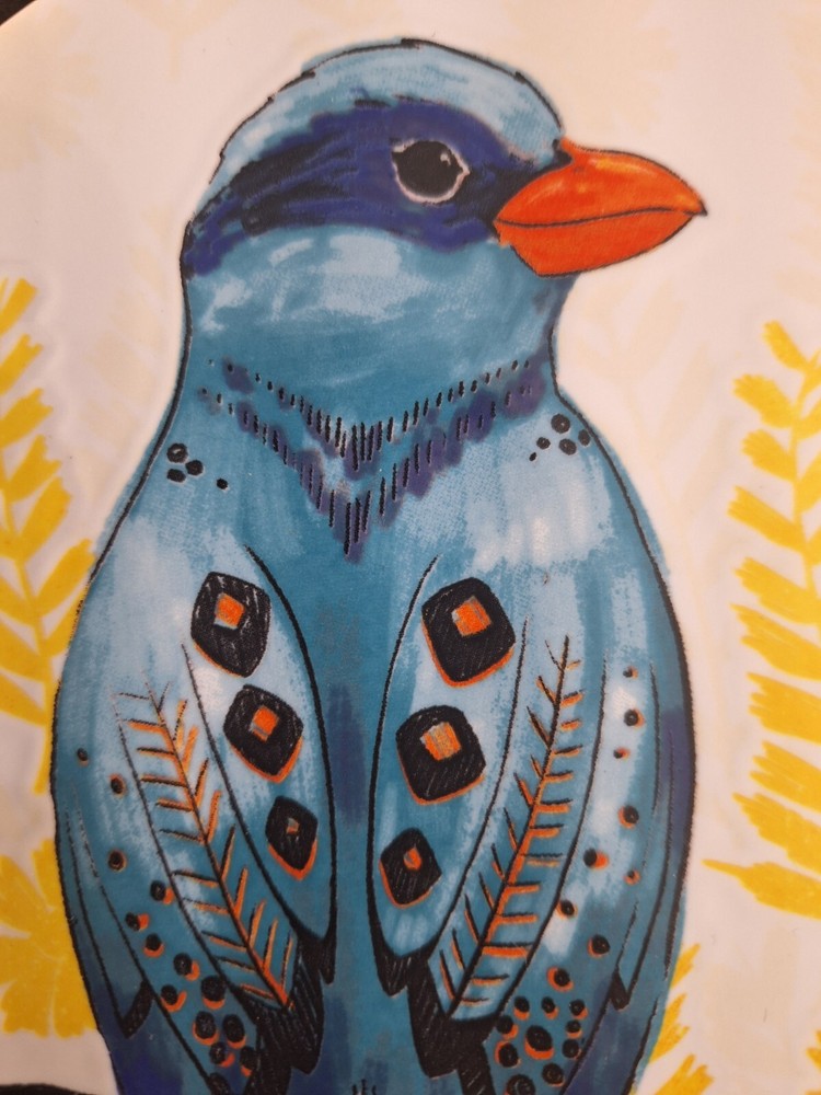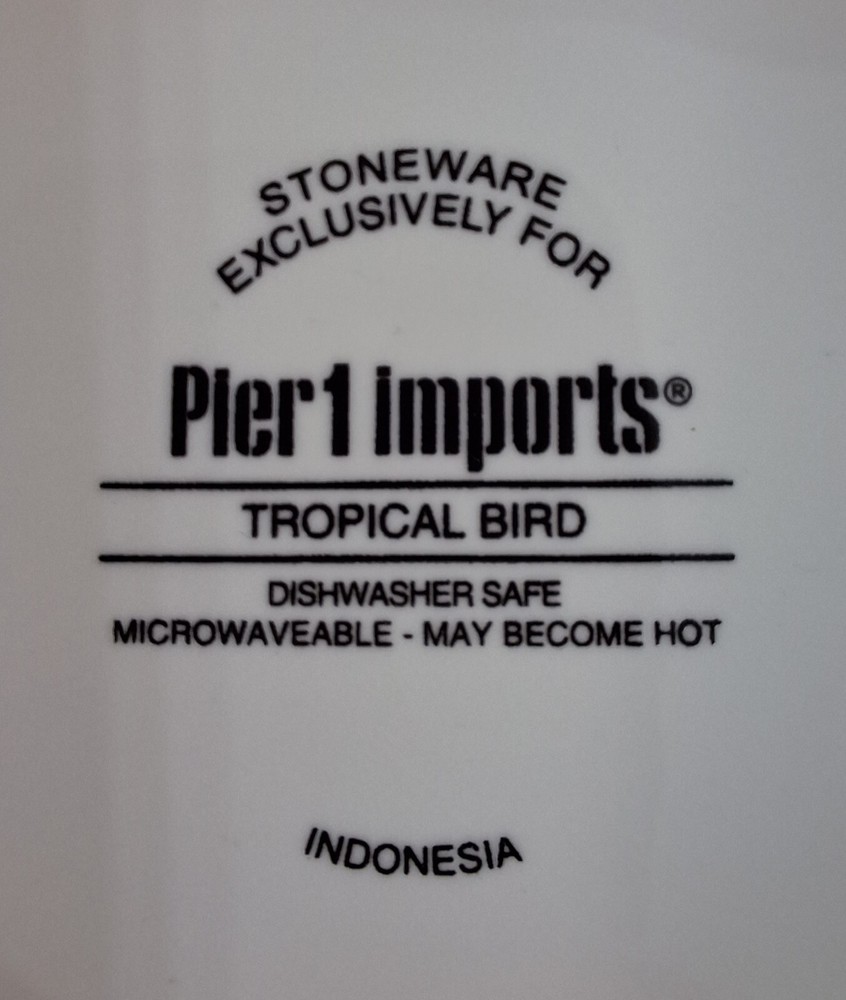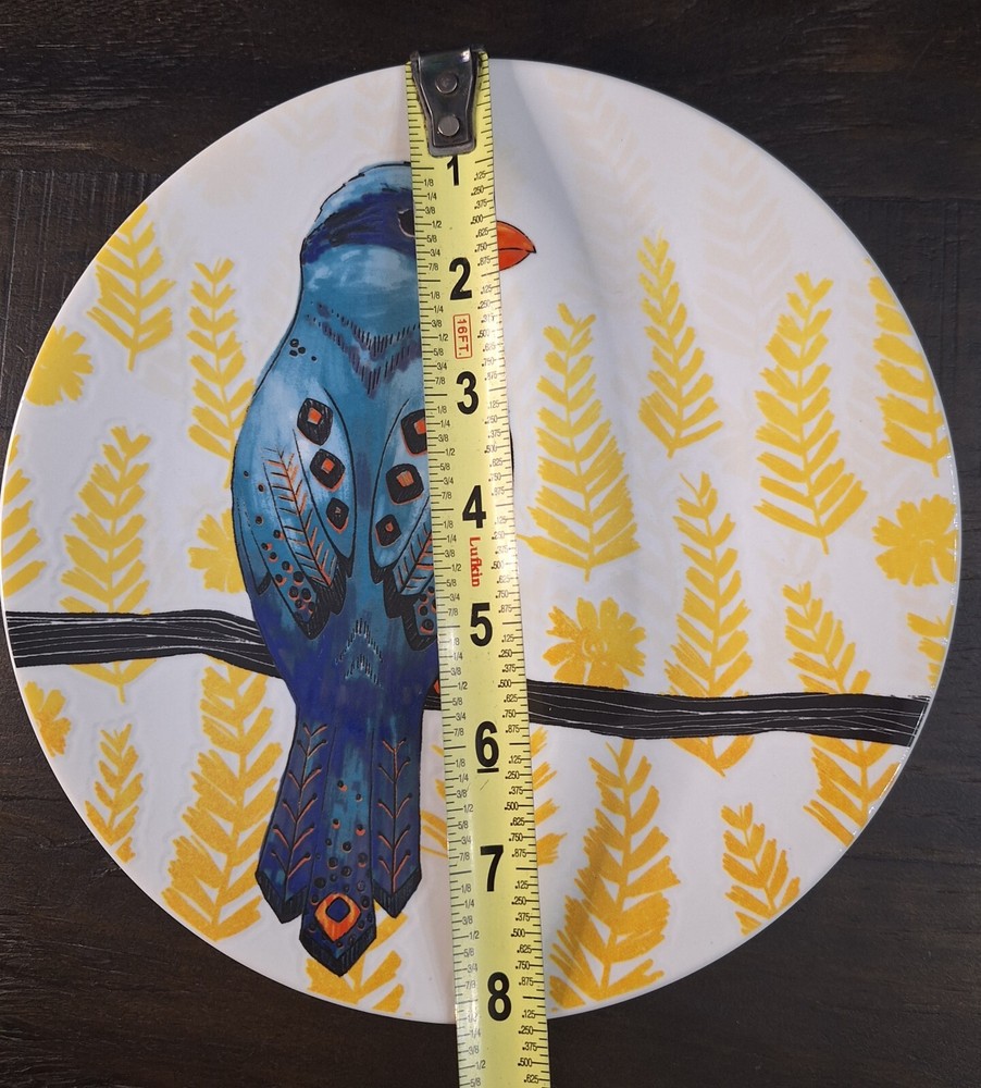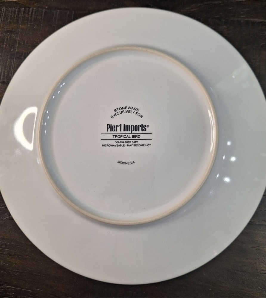 Add a touch of tropical elegance to your table setting with this stunning Pier 1 Blue Tropical Bird Decorative Plate. The round plate features a vibrant multi-colored bird pattern against a colorful leaf background, perfect for all occasions. Crafted from high-quality stoneware, this 8" salad plate is an original piece from Indonesia and is both microwave and dishwasher safe. The plate also includes a printed backstamp and decorative features, making it an ideal addition to your decorative cookware, dinnerware, and serveware collection. Whether you're hosting a dinner party or enjoying a casual meal, this plate is sure to impress your guests and elevate your dining experience. The plate has never been used. It does not come with the original box. Please examine photos carefully as they are part of the description. Props and / or accessories are not included with purchase. Thank you for visiting Kate Evelyn Treasures. We will be adding new items daily. Please visit us again soon.