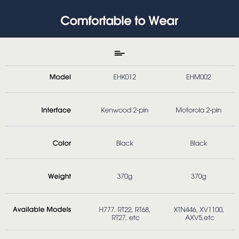 Retevis EHK012 Over-the-Head Noise Reduction Headset for Kenwood 2Pin walkie talkie s Two-Way Radios Retevis EHK012 is an over-ear noise reduction walkie talkie headset. It is available for using in a noisy environment, such as church and sport events. Equipped with a volume knob, it is convenient to adjust the volume based on the actual needs. Rotatable mic rod and inline PTT design bring convenience for using the headset during busy work. Noise Reduction 24dB noise reduction makes it easy to hear clear information by reducing background noise when you are in a noisy environment. Adjustable Volume Coming with a volume knob, the headset is convenient to adjust the proper volume based on different occasions, such as low volume in the home and high volume in a noisy park or church. 260° Rotatable Microphone 260° rotatable mic rod is used in both left and right ear, enabling you to communicate with partners freely even when you are in a car competition. Adjustable Headset Noise reduction headset with adjustable design is convenient for different aged and different head sizes people to wear by adjusting to the suitable size. Convenient to Wear Using soft sponge material, the headset has better comfort and is comfortable to wear for a long time, supporting a-whole-day use. Easy to Carry The headset uses a foldable design, which enables you to fold it and place it in your bag to carry around while going to work. Strong Compatibility The Kenwood 2-pin earpiece is compatible with Kenwod 2-pin walkie talkies, such as H777, RT22, RT68, RT27, etc. Inline PTT Design The Inline PTT of the headset allows you to communicate without holding the walkie talkies. Various Applications Specifications Package Includes Features: NRR:24dB; Over-the-head double muff adjustable design for increased comfort ; Heavy-duty 260°adjustable goose neck boom microphone suit for right or left; Convenient volume control knob on ear cup; Heavy duty cabling with coiled part for superior strength and flexibility; Inline soft tactility push-to-talk button with clip; Foldable design for easy storage; Kenwood 2PIN connector; Color: Black; Weight: 370g; Cable length: stretched 280CM, unstretched 116CM; Microphone specifications: Type: condenser microphone unidirectional microphone Sensitivity: -45 Frequency response: 100Hz-8000Hz Impedance: 200-2KΩ Speaker specifications: Type: Dynamic speaker Material: NdFeB Impedance: 32Ω Sensitivity: 95dB Frequency response: 300-4000Hz Package Includes: 1x EHK012 Headset About us