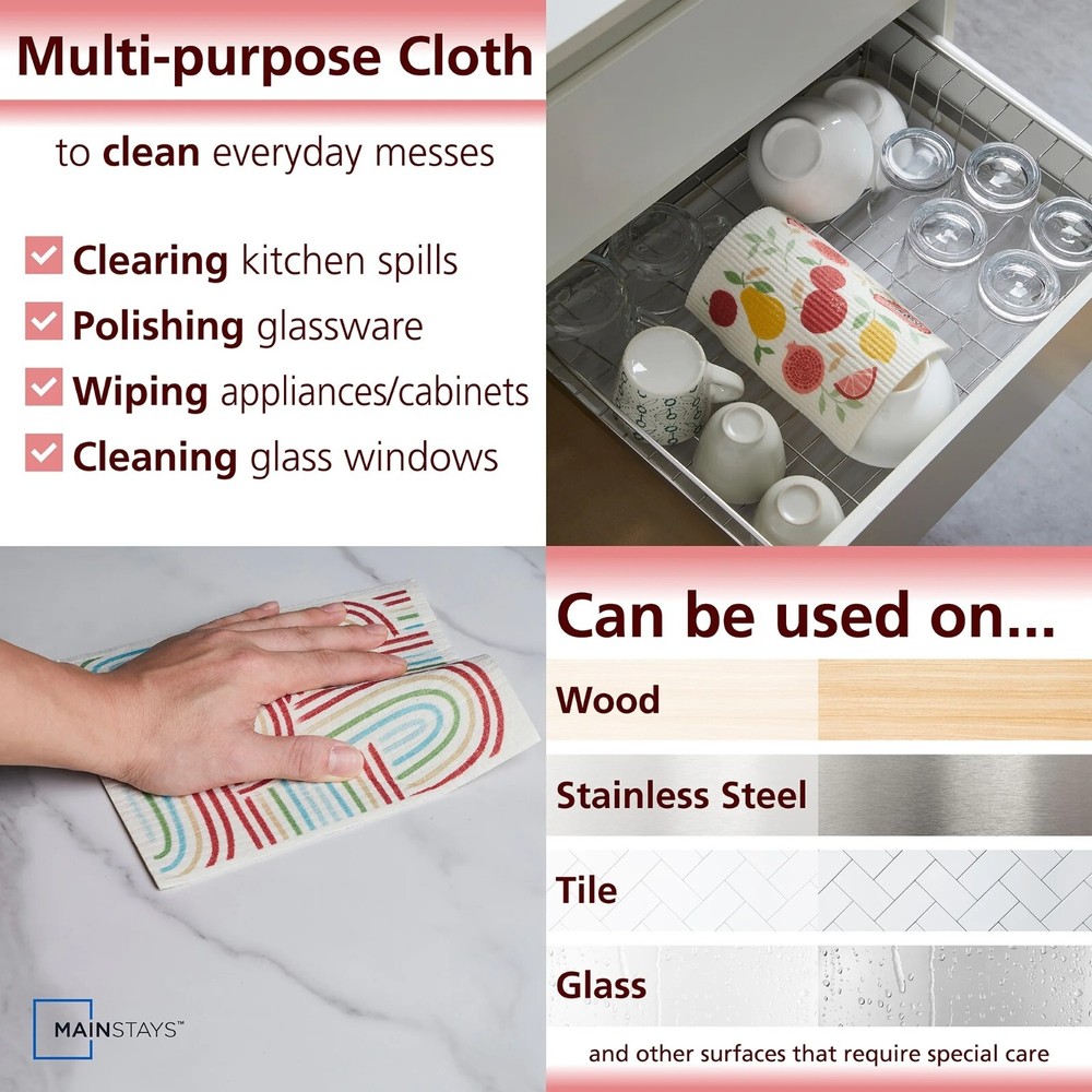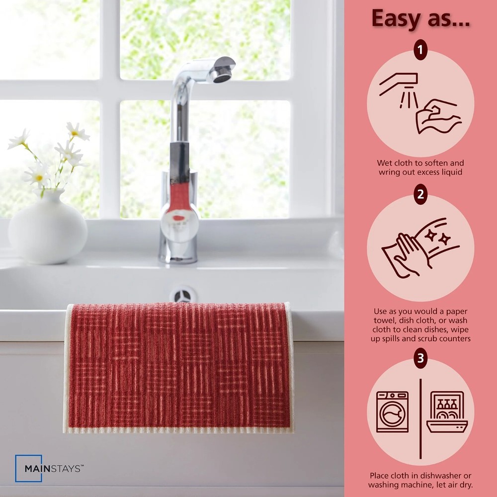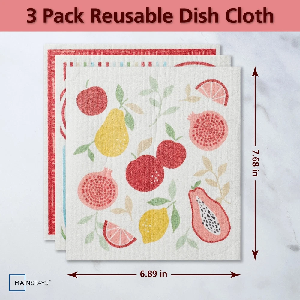 Product details Elevate your kitchen cleaning experience with the Mainstays 3 pack swedish dishcloths—a versatile tool designed for efficiency and sustainability. Soft and naturally highly absorbent, these 6.9in x 7.7in reusable dish towels are made from 70% cellulose, 30% cotton and come in handy for cleaning countertops, clearing spills or messes, polishing glassware and more. From scrubbing dishes to wiping down surfaces, its flexibility ensures a gentle touch on all kitchen essentials. These dual-sided reusable paper towels are streak and lint-free for a hassle-free clean. Simply wash and reuse so you can cut back on excess laundering and paper towel expenses. These paper towels are top-rack dishwasher safe so you can throw them in with the dishes for a nice clean. To sanitize, wet and place in the microwave for up to 60 seconds. For easy care, machine wash cold. This pack includes three rectangular paper towels, featuring colorful, bold prints in red hues on both sides to add natural style to your kitchen decor. Eco-Friendly Cleaning: Made from sustainable materials, our 70% cellulose and 30% cotton swedish dish cloths provide an eco-friendly alternative to traditional disposable cleaning options. Ultra Absorption: These 6.9 in x 7.7 in reusable dishcloths boast exceptional absorbency, efficiently tackling spills, cleaning surfaces, and ensuring a thorough and effective cleaning experience. Reusable and Durable: Designed for long-lasting use, Mainstays sponge cloths are reusable and durable, standing up to the demands of daily cleaning tasks without losing effectiveness. Cloths feature a machine washable, dishwasher-safe design and are streak/lint free. Hygienic: Unlike traditional sponges, our reusable paper towels resist bacteria buildup, providing a hygienic cleaning solution that contributes to a healthier and cleaner environment in your home or workspace. Microwave safe for up to 60 seconds to sanitize. Cost-Effective Solution: Due to their reusable nature and long-lasting durability, our reusable kitchen cloths present a cost-effective cleaning solution, saving you money in the long run by minimizing the need to invest in as many paper towels.