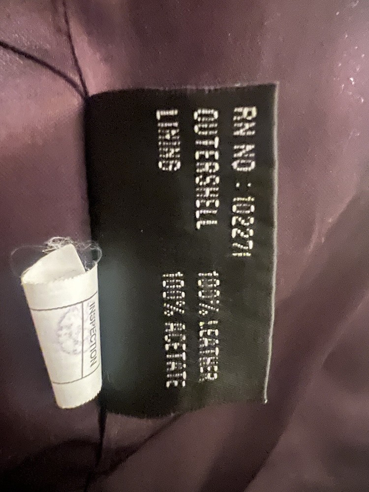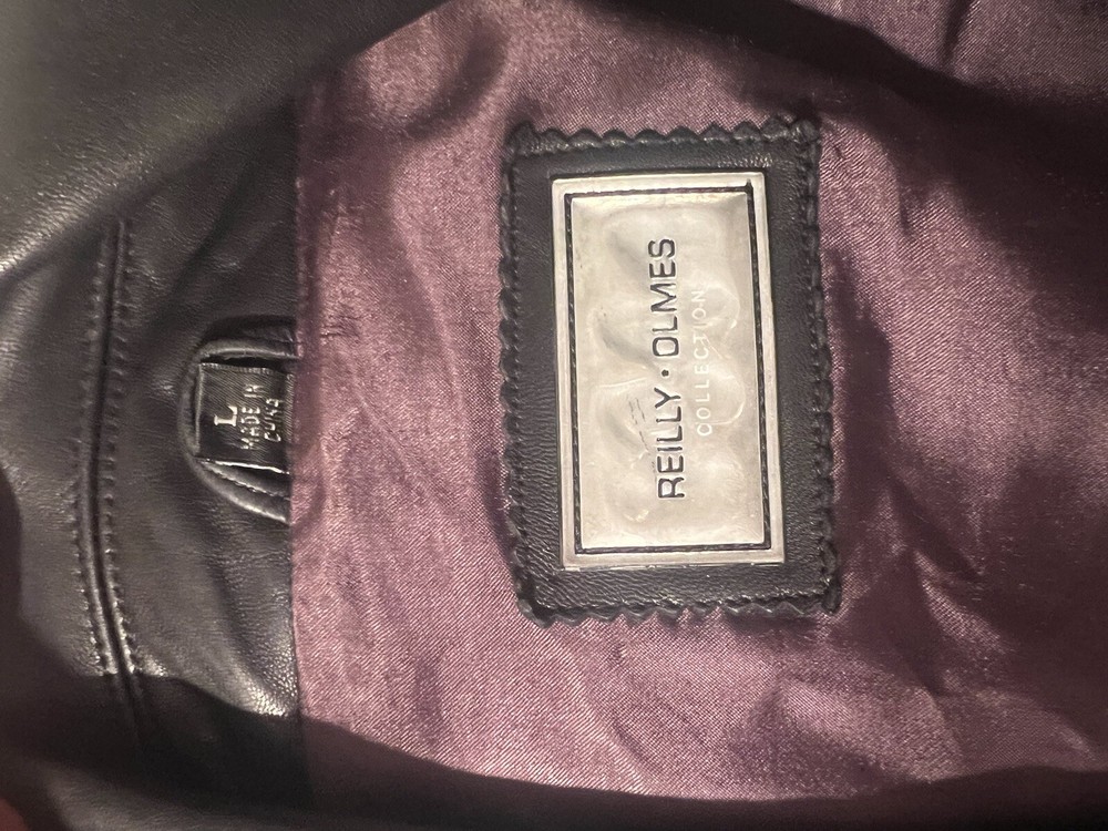 This vintage Riley Olmes Collection leather jacket is a perfect addition to any wardrobe. The mid-length coat features a full zipper closure, collared neckline, and wind-resistant design that keeps you warm and cozy during chilly winter, fall, and spring seasons. The black color and solid pattern make it a versatile piece that can be worn for casual, business, or travel occasions. The jacket is lined with acetate and features pockets for added functionality. The Easy Rider model jacket is perfect for motorcycle enthusiasts and its design themes, including nature, space, rock, and cowboy, make it a unique piece that stands out. With a regular fit and size L, this jacket is suitable for men of all sizes and shapes. Despite being pre-owned, this jacket is in excellent condition and is a must-have for anyone looking for a vintage leather jacket.