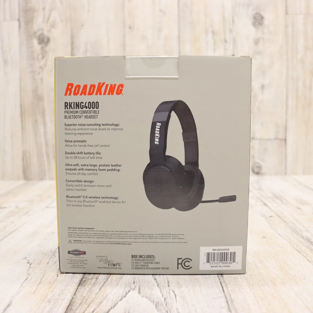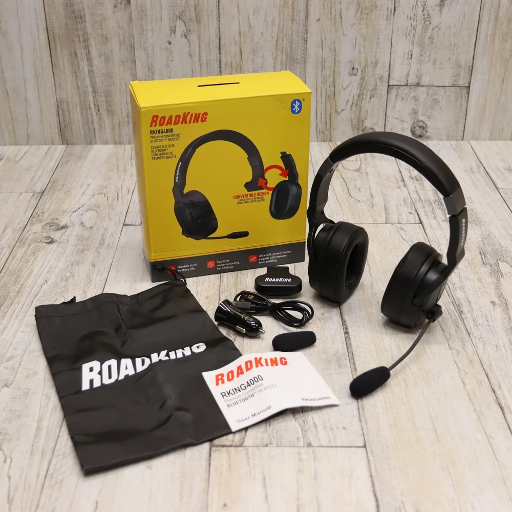 RoadKing RKING4000 Premium Mono/Stereo Convertible Bluetooth 5.0 Headset New Condition, Open Box. May Have Minor Blemishes From Handling Features Bluetooth® 5.0 wireless technology Up to 28 hours of talk time 33-foot wireless operating range Superior noise-canceling technology Ultra-soft, large, protein leather earpad with memory foam Convertible design easily switches between mono and stereo This premium Bluetooth® headset has superior noise-canceling technology for the best listening experience. Choose between mono and stereo headset with the convertible 2-in-1 design. Take advantage of the 28 hours of talk time while operating wirelessly up to 33 feet. The ultra-soft, leather padding makes this headset one you will not want to take off!