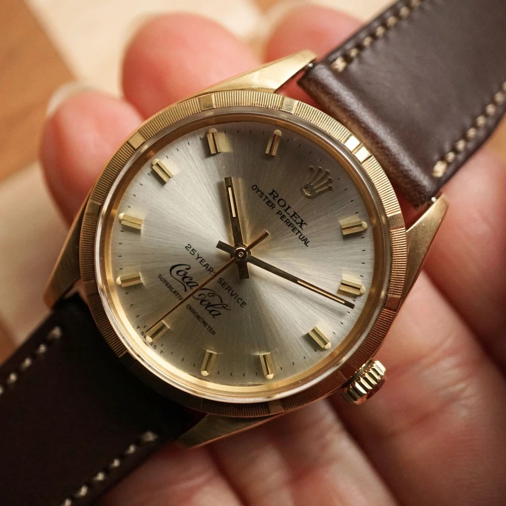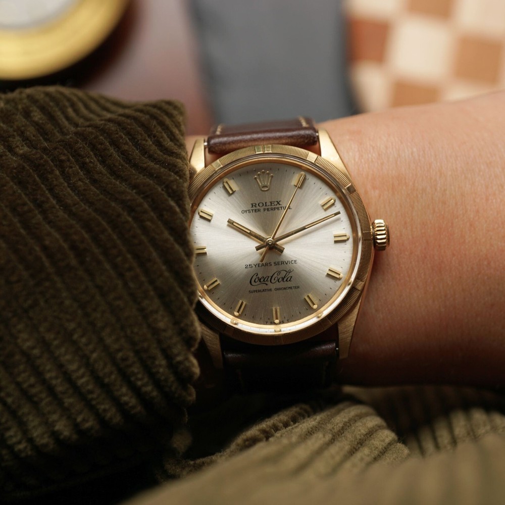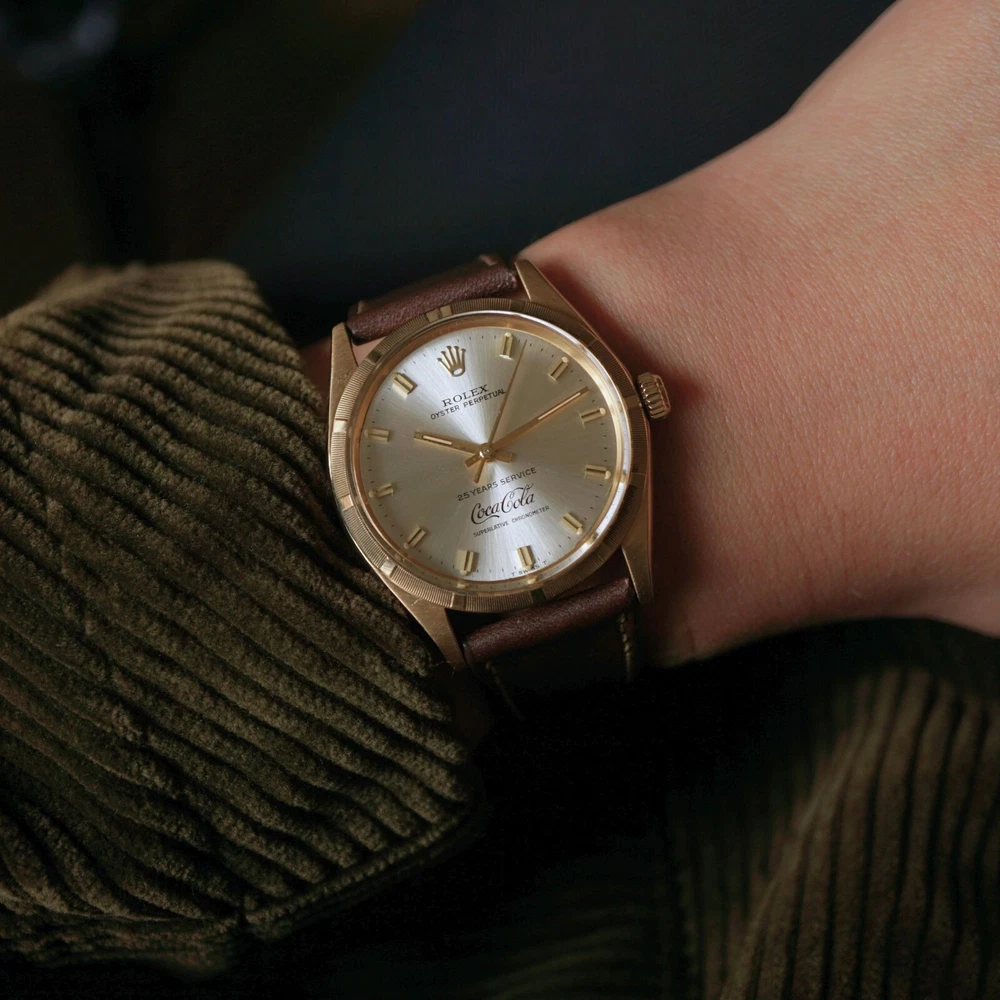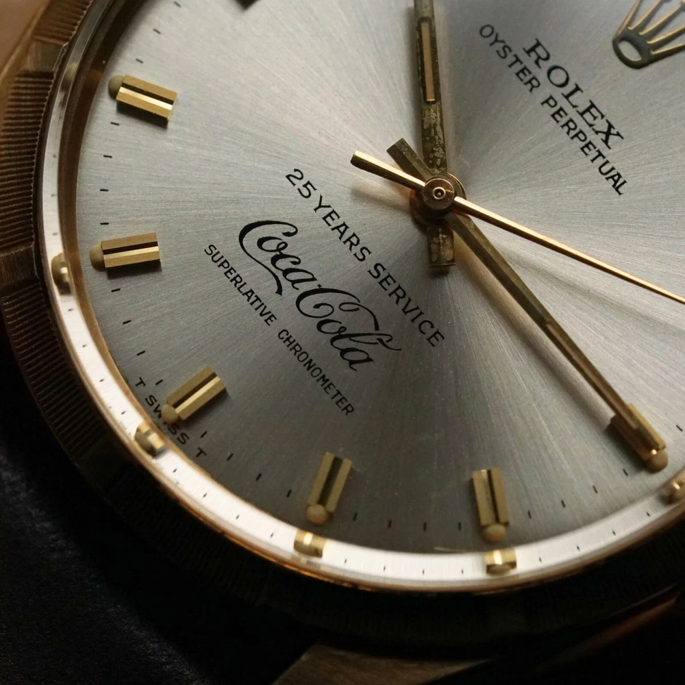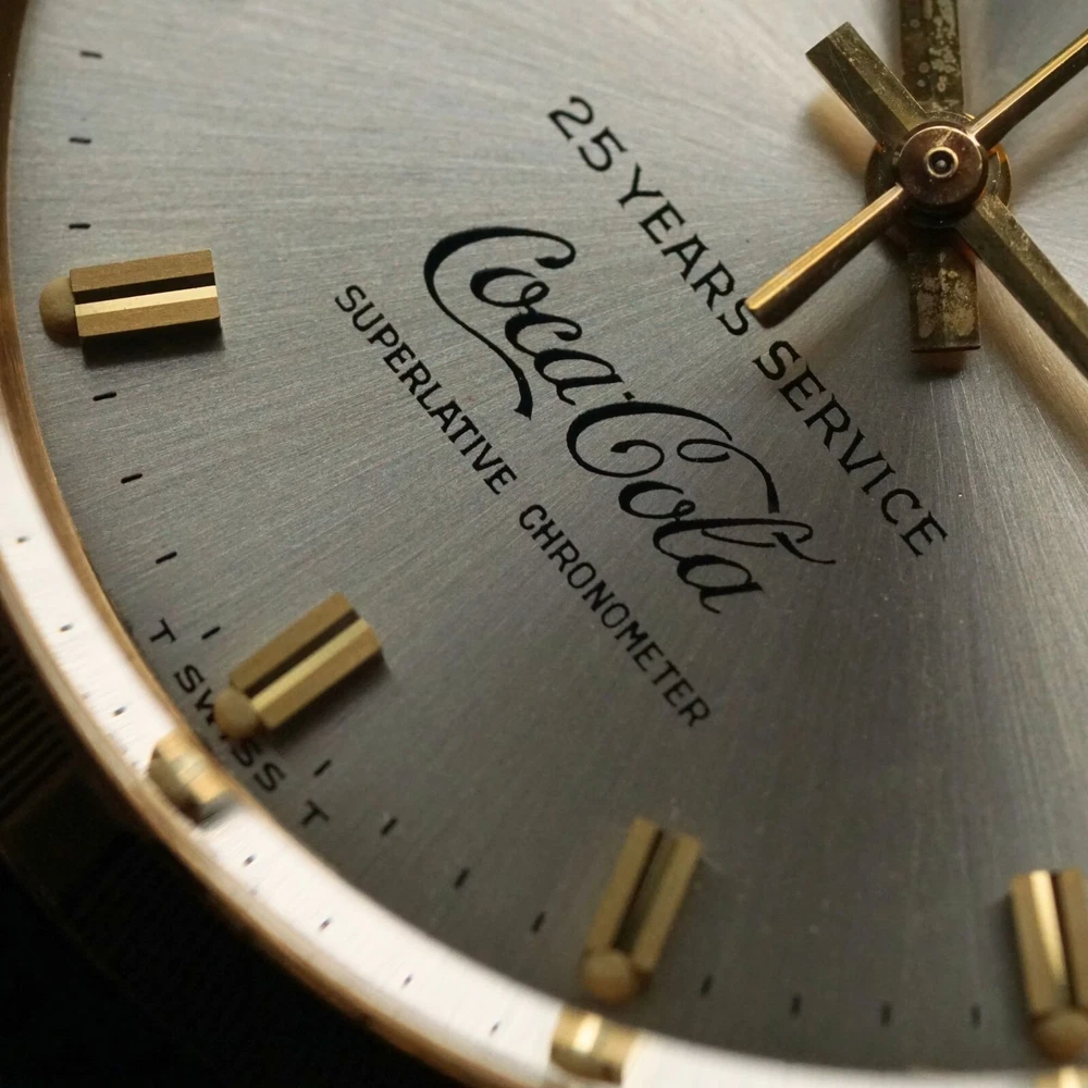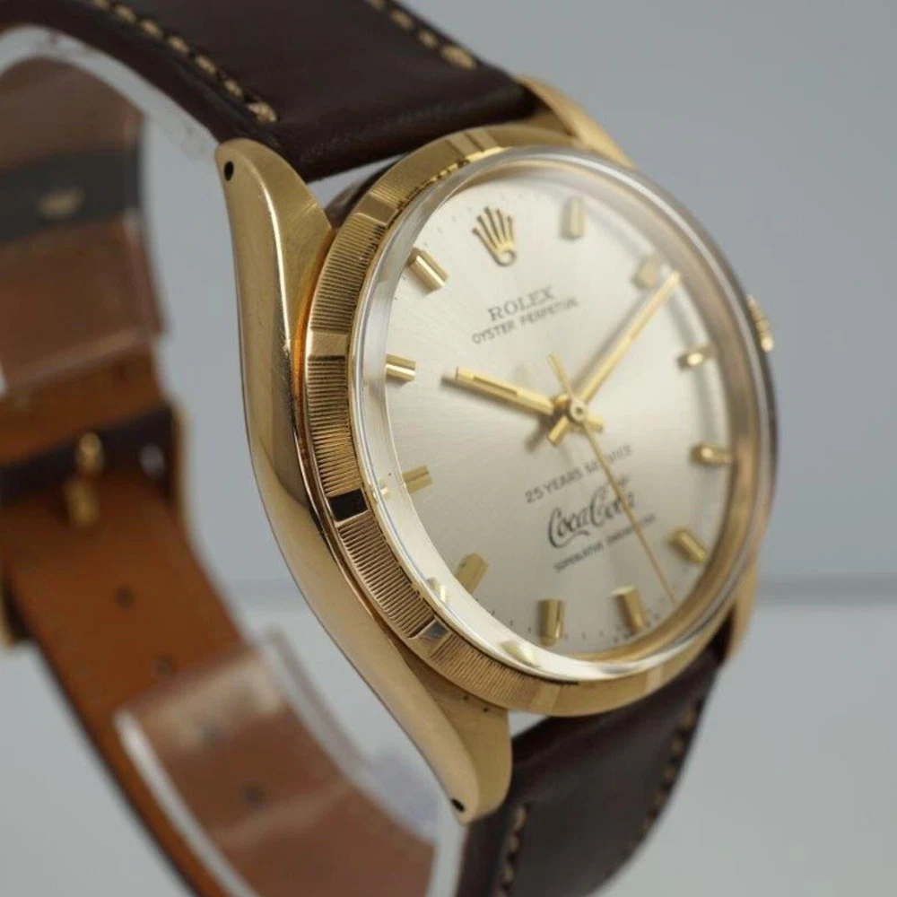 This vintage Rolex Oyster Perpetual Ref. 1005 is a stunning piece of history, crafted in 18k gold and awarded for 25 years of service at Coca-Cola. The 34mm case shines with its original finish, engine-turned bezel, and crisp hallmarks. The gorgeous double-signed dial features a silvered soleil finish with raised gold baton markers, adding timeless elegance. Powered by an automatic movement, it's a rare collector's dream with a unique story behind it. The condition is impeccable—truly a treasure for any watch enthusiast.