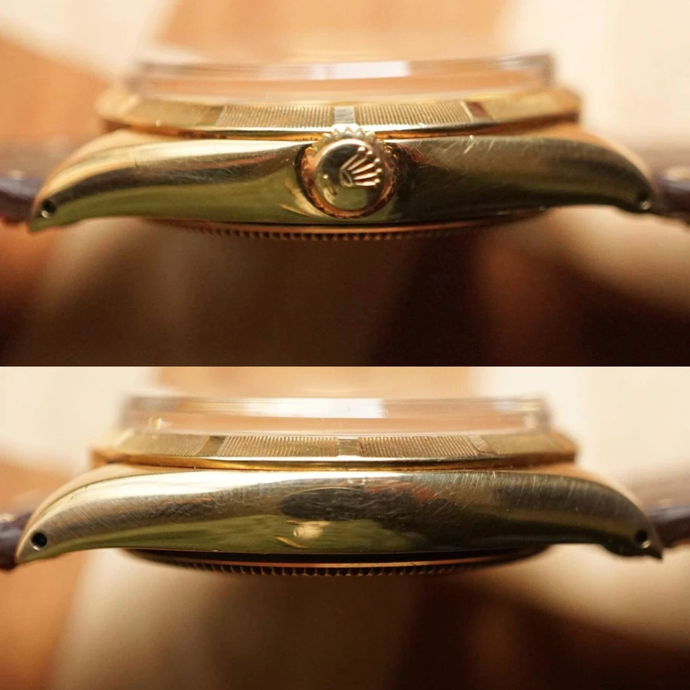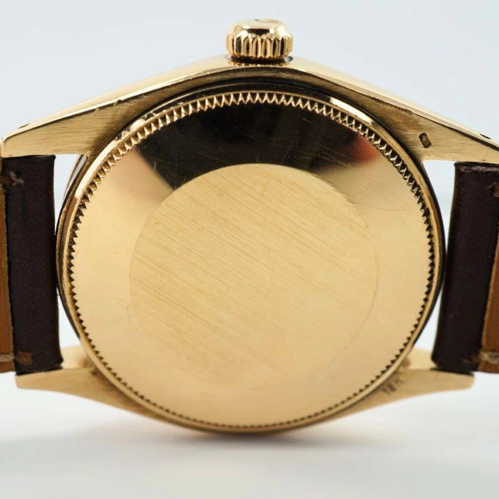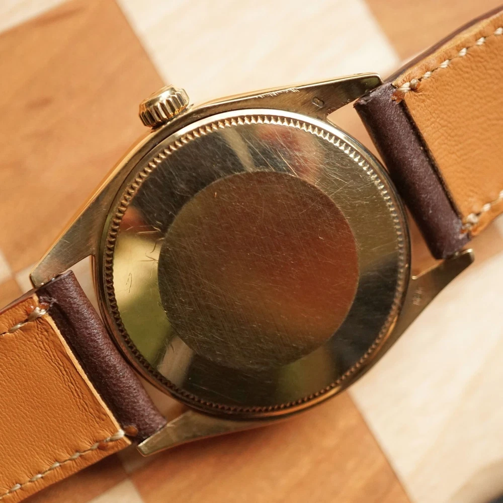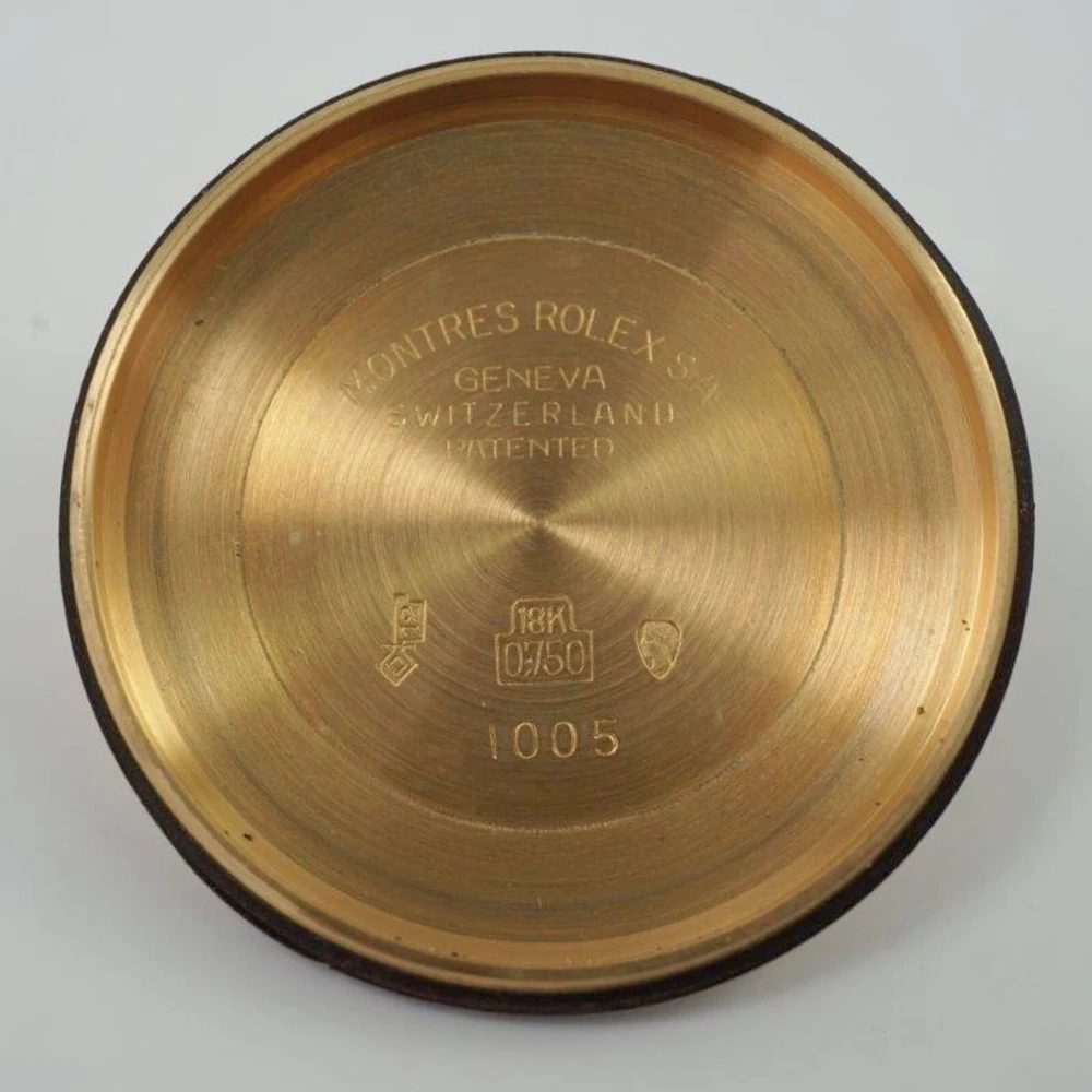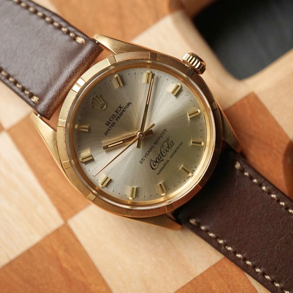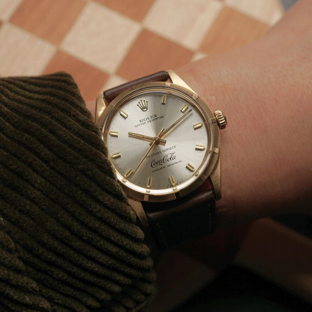 This vintage Rolex Oyster Perpetual Ref. 1005 is a stunning piece of history, crafted in 18k gold and awarded for 25 years of service at Coca-Cola. The 34mm case shines with its original finish, engine-turned bezel, and crisp hallmarks. The gorgeous double-signed dial features a silvered soleil finish with raised gold baton markers, adding timeless elegance. Powered by an automatic movement, it's a rare collector's dream with a unique story behind it. The condition is impeccable—truly a treasure for any watch enthusiast.