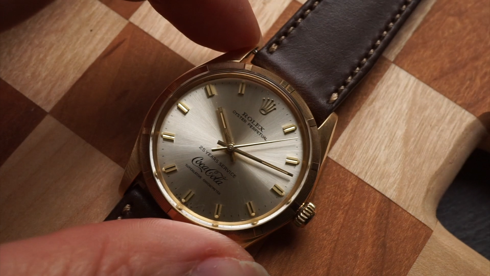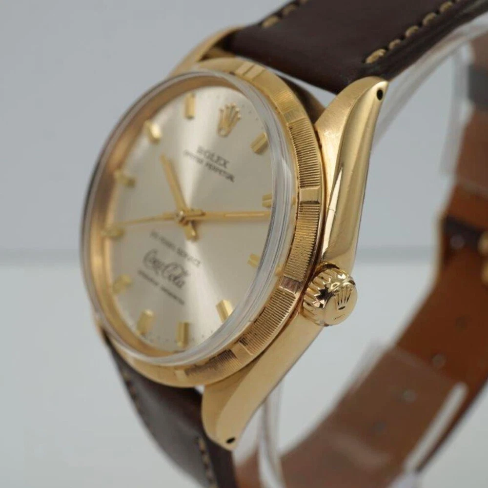 Rolex Oyster Perpetual Ref. 1005 Vintage Coca Cola Award 18k Gold 34 mm Automatic 1969-70 A vintage Rolex Oyster Perpetual reference 1005 in 18k yellow gold. A dedication watch awarded for 25 years of service at Coca Cola, the iconic Cola drink! The 34 mm case retains its original finish, the engine-turned bezel preserved, and crisp hallmarks and Rolex crown logo. Features an original double signed silvered soleil dial marked 25 years service Coca Cola. Gorgeous raised gold baton hour markers flanked by plump and intact lume plots, gold baton hands with center lume. Case back is devoid of engraving. Fitted with a brown leather strap and Rolex plated buckle, this handsome vintage Rolex looks great on the wrist. Original 25 year Coca Cola dial, hands and crown. Case measures 34 x 39, 12 mm thick case. Rolex caliber 1570, 26 jewels automatic winding. Acrylic crystal. Serial 2686xxx New brown leather strap. 19 mm lug width. Modeled on 6 inch wrist. This Rolex Oyster Perpetual watch has undergone a timing and oiling by our watchmaker, it runs and is ready to be worn and enjoyed. Guaranteed original, please ask all questions before you buy. *Please view all of our photos as they are part of our description. Please ask for more information if interested. See our high end watch auctions. By bidding on our item you agree to our listed terms, thank you. Please join our eBay Newsletter for weekly updates as more items are continually uploaded to our site. Payments : Payments are due in 2 days. Direct eBay Payments only. eBay does collect sales tax. Buyers pay insured shipping. International buyers: We cannot ship to China, Spain or Russia at this time, we apologize for any inconvenience. We ship insured international -No gifts, Low values, etc... All customs & duties are your responsibility. Import duties, taxes and charges are not included in the item’s shipping costs. Please check with your country’s custom regulations to determine additional charges prior to buying or bidding, these charges are normally collected by the delivery freight (shipping) company or when you collect the item. Please do not confuse them for additional shipping charges from us.
