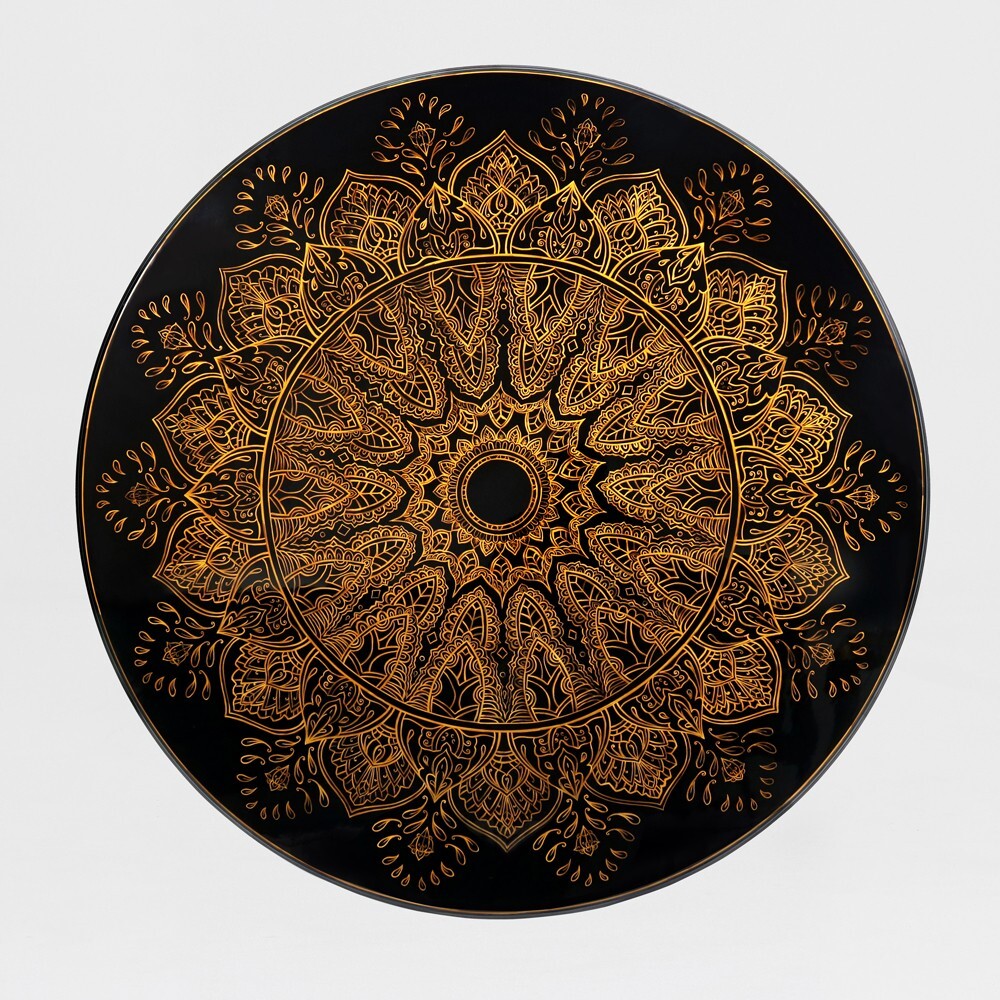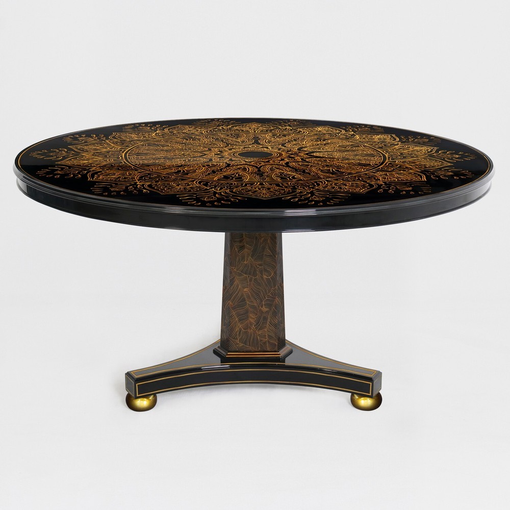 Elegant round black table with a stunning gold leaf design. Dimensions: 60W x 31H