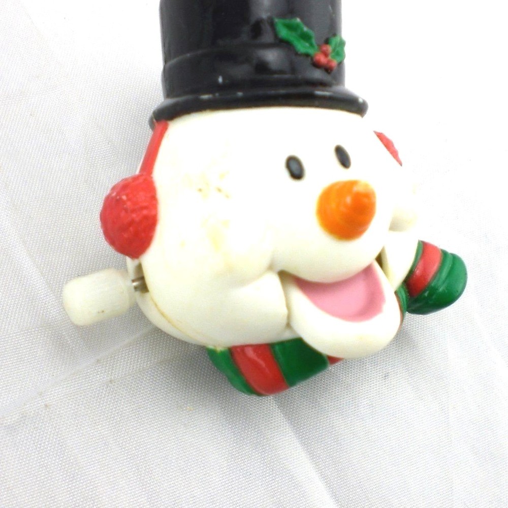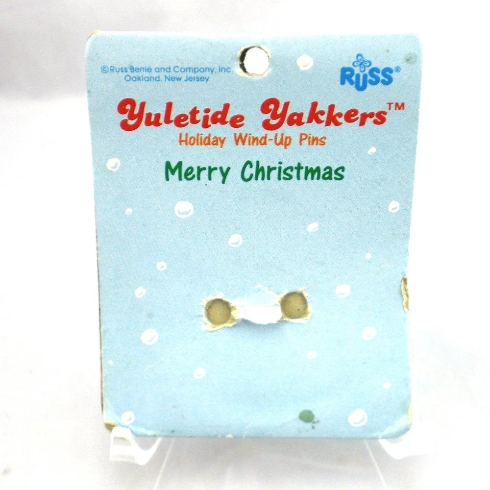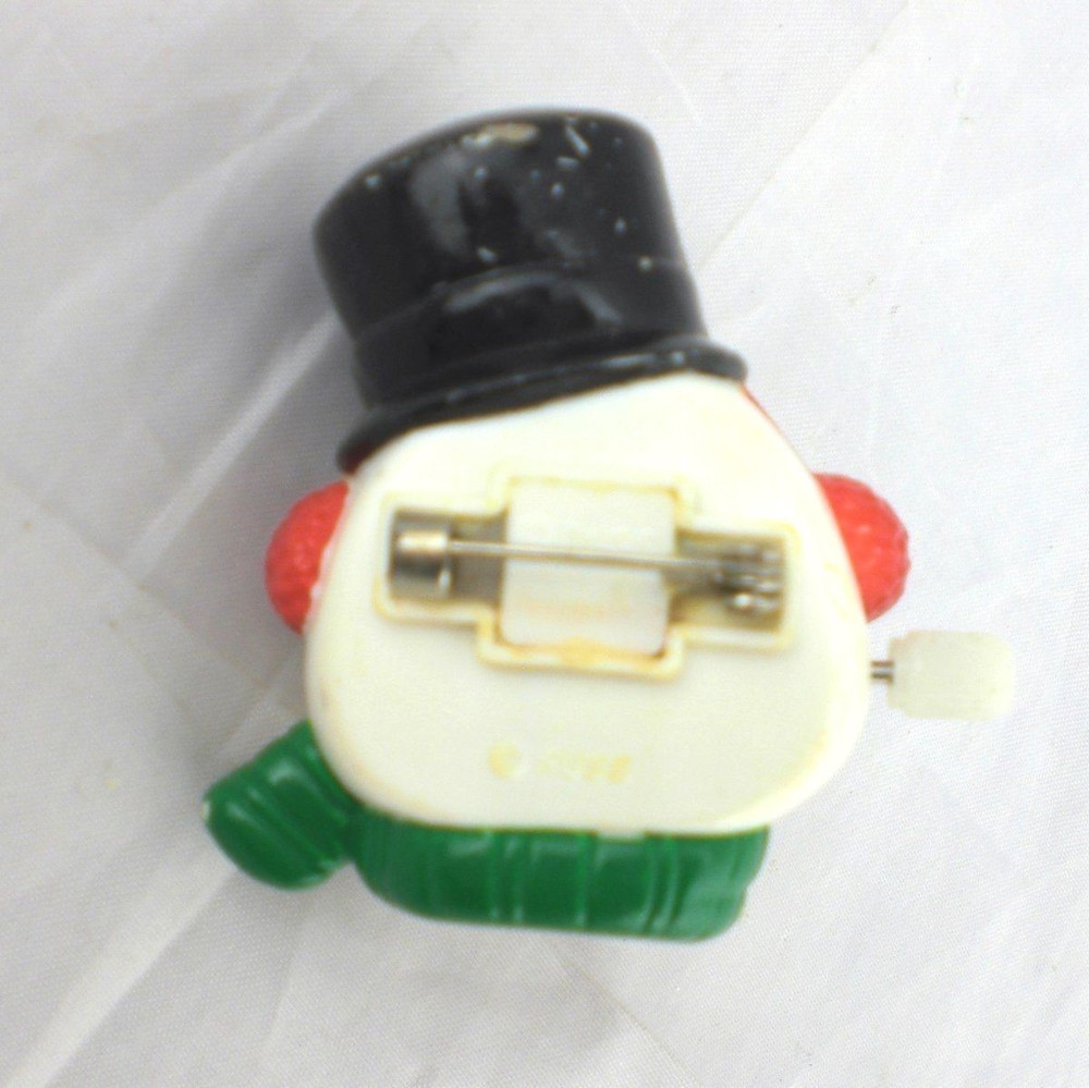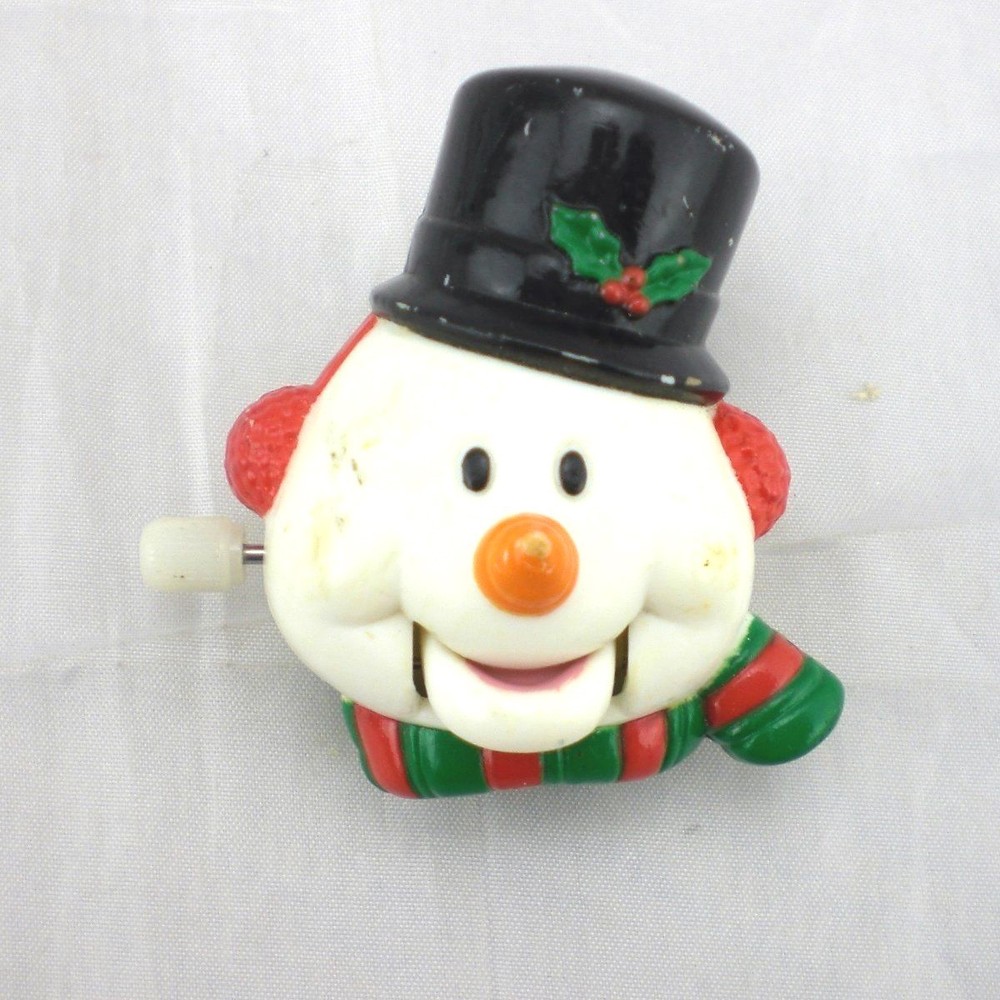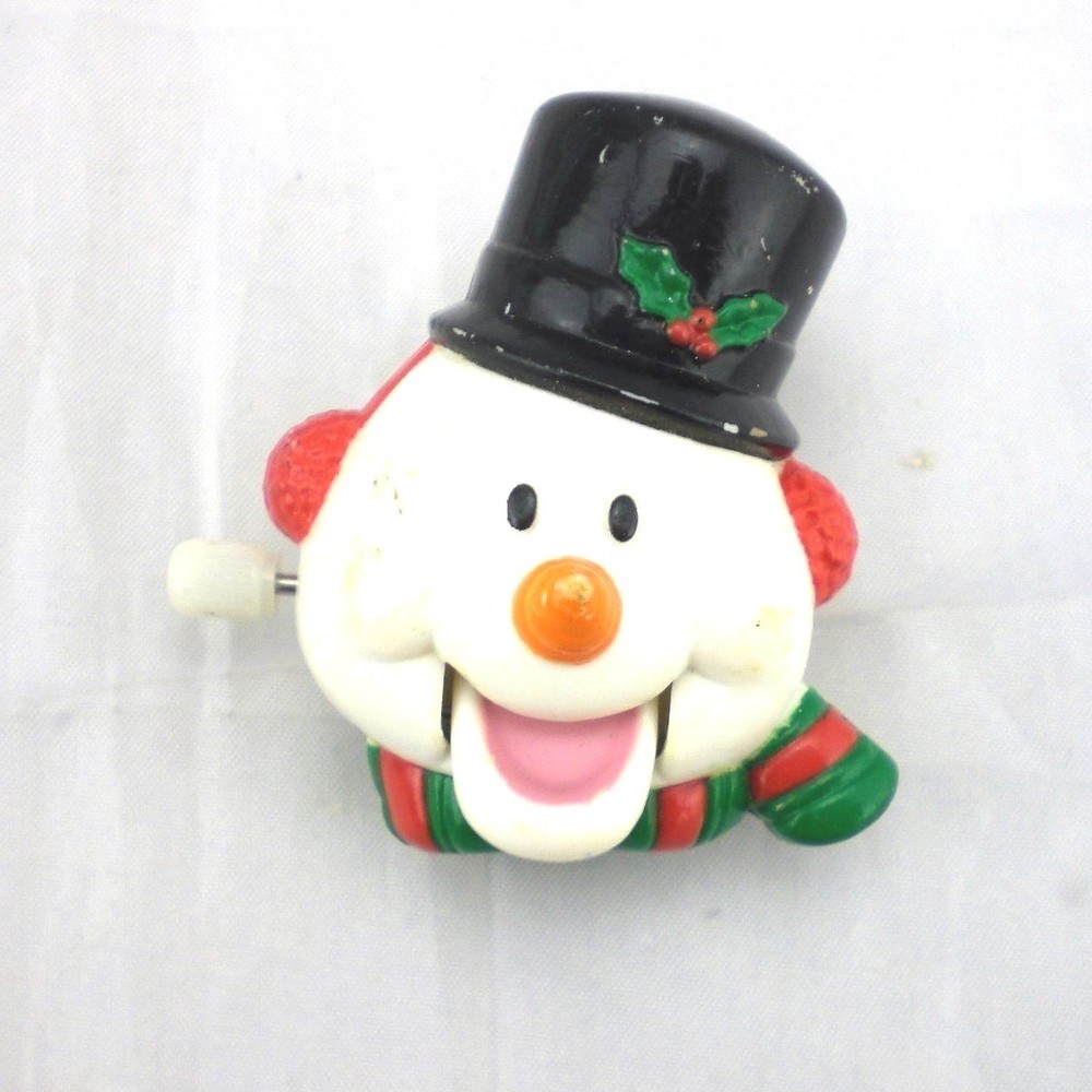 Vintage Russ Berrie Yuletide Yakkers Wind Up Snowman Holiday Pin Xmas Vintage Russ Berrie Yuletide Yakkers Wind-Up Snowman Face Pin/Brooch. A fun holiday brooch of a snowman's head whose mouth opens and closes when wound up. He is wearing a black top hat with a holly & berry accent and a green and red striped scarf. Winder is on the side of his head and is functional. Includes the original cardboard tag which was made in Hong Kong, pin made in China 2" Height x 1-3/4" Diameter Wear to the paint on the face, nose and hat. Some discolored marks on one side of his face. Cardboard tag is tearing and bending on the edges and in the middle where the pin used to attach From a smoke-free, pet-free environment