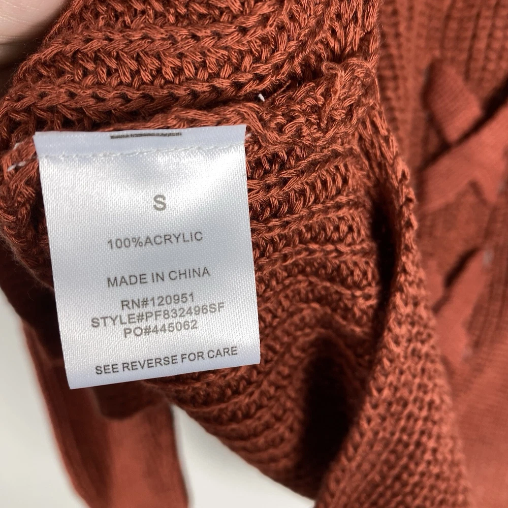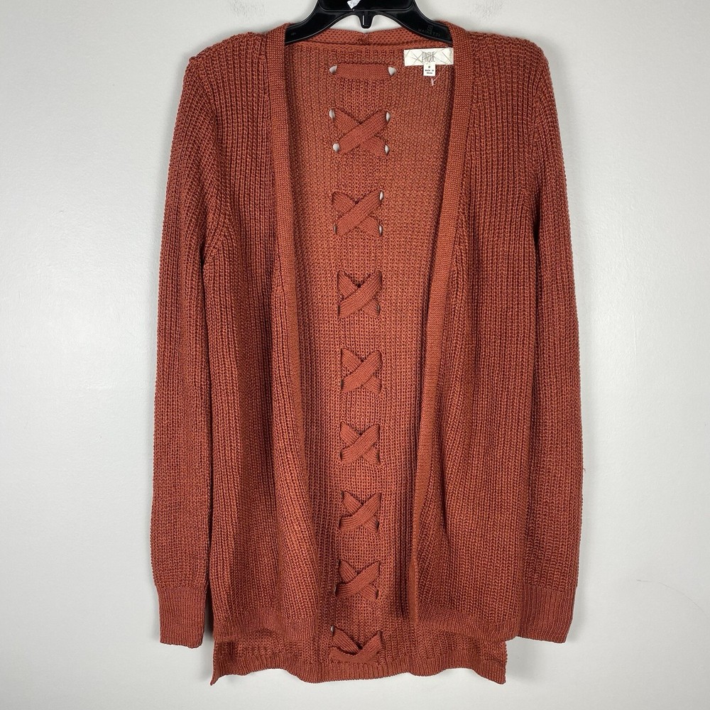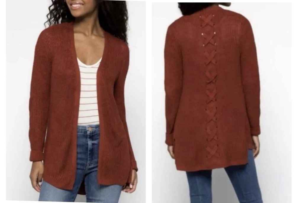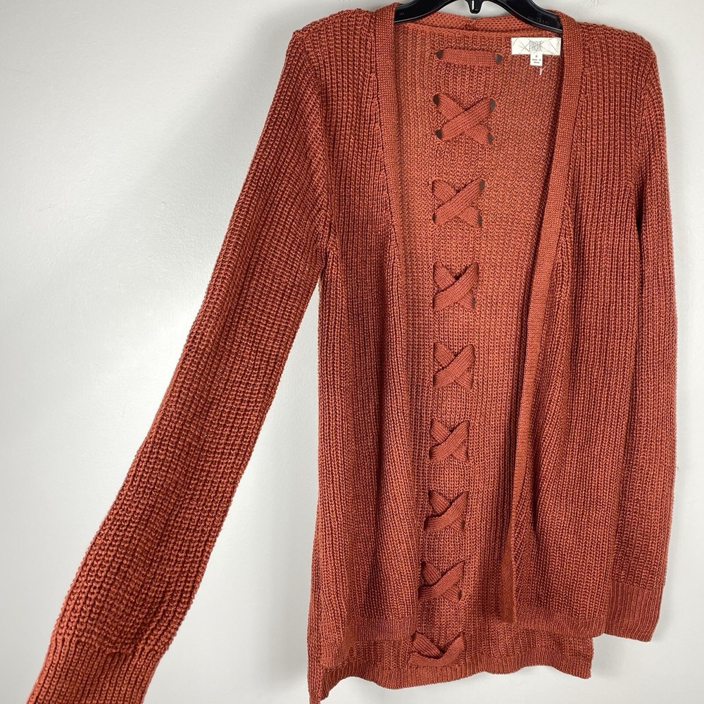 Womens Small Long Cardigan Cozy Comfort Sweater Rust Orange Back Detail Pinque boutique New No Tag Bust Width Laid Flat 19 Length 29 front / back 31.5