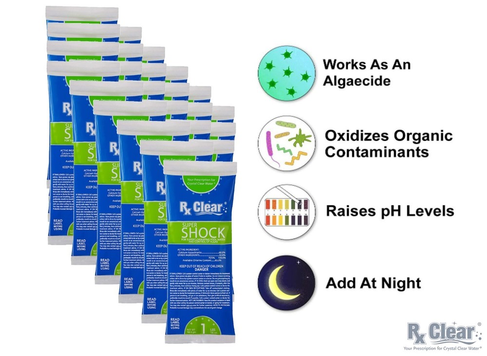 Rx Clear® Swimming Pool 68% Calcium Hypochlorite Super Chlorine Shock 24 x 1 lb Bags Item Number: 20406124 *Note* - Due to state regulations, this item cannot be shipped to California. Pool Shock 68% Calcium Hypochlorite - is similar to Sock-It, but can be broadcast evenly over the pool's surface without bleaching vinyl liners. Apply at night at the rate of 1 bag per 10,000 gallons. For green water add 3 bags per 10,000 gallons. 68% Calcium Hypochlorite The auction is for 24 - 1 lb Bags Dosages: Clear Water: 1 lb. Super Shock per 10,000 gallons of pool water at night Green Water: 3 lb. Super Shock per 10,000 gallons of pool water Features: POOL SHOCK TREATMENT - Our super shock contains 68% calcium hypochlorite, yielding 65% available chlorine making this similar to Mega Shock, but slightly less concentrated. This shock will raise your free chlorine levels, water hardness, and pH levels giving you crystal-clear water for a more enjoyable swimming experience. Due to its high percentage of chlorine, Super Shock is very effective and efficient for a quick chlorine boost. MIX BEFORE YOU FIX - It is best to dilute Super Shock in a bucket of water before dispensing it around the pool which can prevent liner staining and cloudy water. Add this powder to a bucket of water before you add it to your pool. Add a 1 lb bag per 10,000 gallons of pool water. POOL SHOCK WITH ALGAECIDE - Kill the algae in your swimming pool by adding 3 bags of shock per 10,000 gallons of pool water. We strive to provide quality products for a safer, cleaner, and more enjoyable swimming experience. WORKS BEST AT NIGHT - For the best results use Super Shock at night in order to prevent the sun from eating up the shock since it is not stabilized; it’s best to shock when the sun isn’t out for maximum performance. Do not swim for 8 to 10 hours after application.
