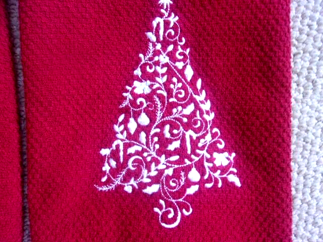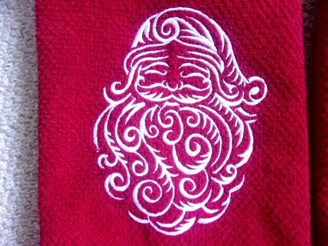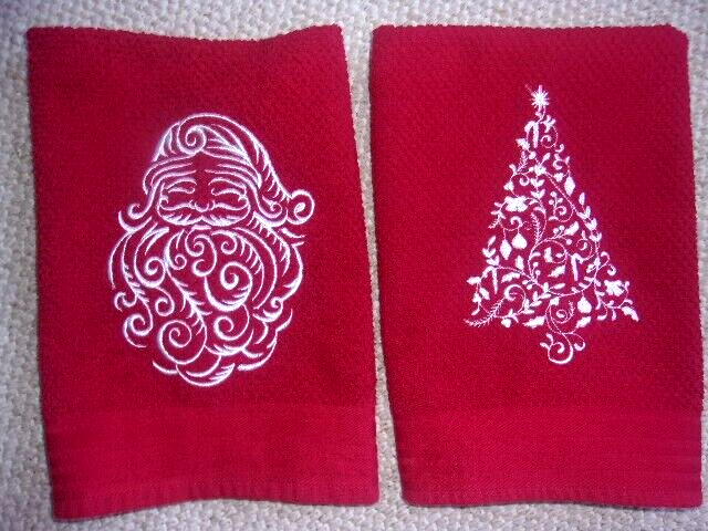 Santa Claus and Christmas tree Set of 2 Etched white embroidered Red hand towels These are top quality Measures 16" x 29" Machine wash and dry Comes from a smoke and pet free home Thank you for looking