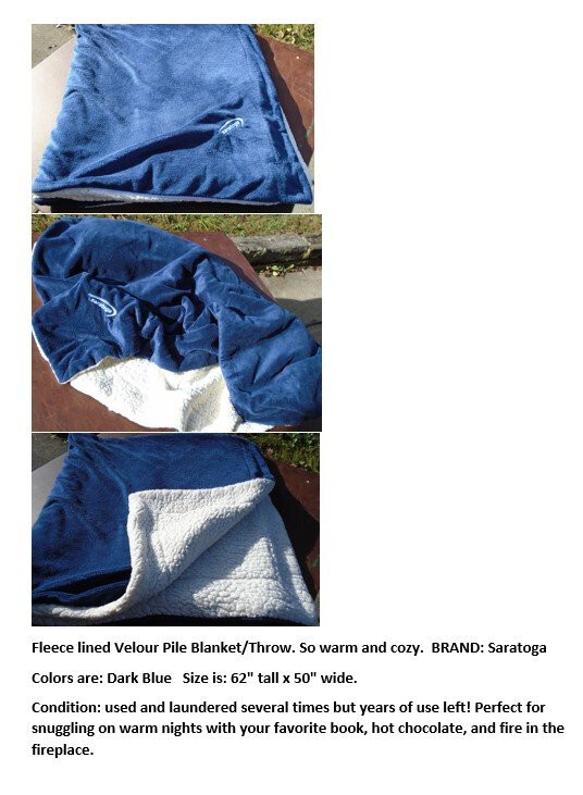 Wonderful for snuggling on warm nights with your favorite book, hot chocolate, and fire in the fireplace . Remember the old song, "Baby it's cold outside"!! BRAND: SARATOGA Measures: 62" tall x 50" wide. Condition: Good condition. Gently used. No stains, no tears, no damage. Has been laundered and dried before. Warm, cozy, comfy. Comes from smoke free home. Item Loc. 6A KI - Item # 3857