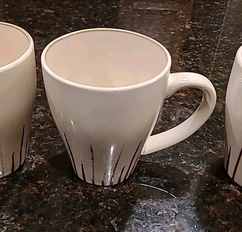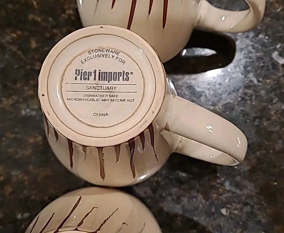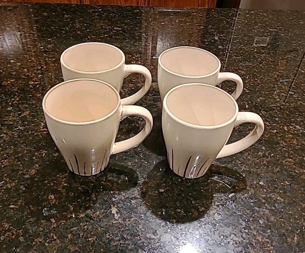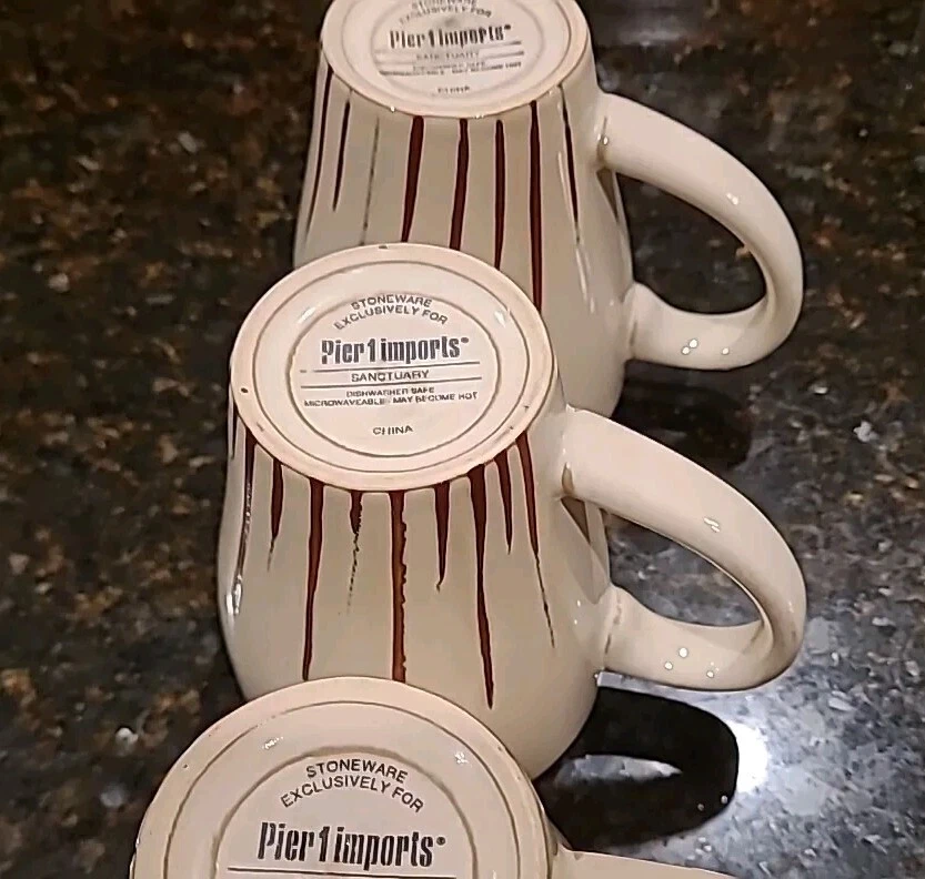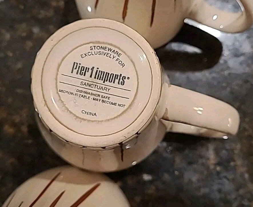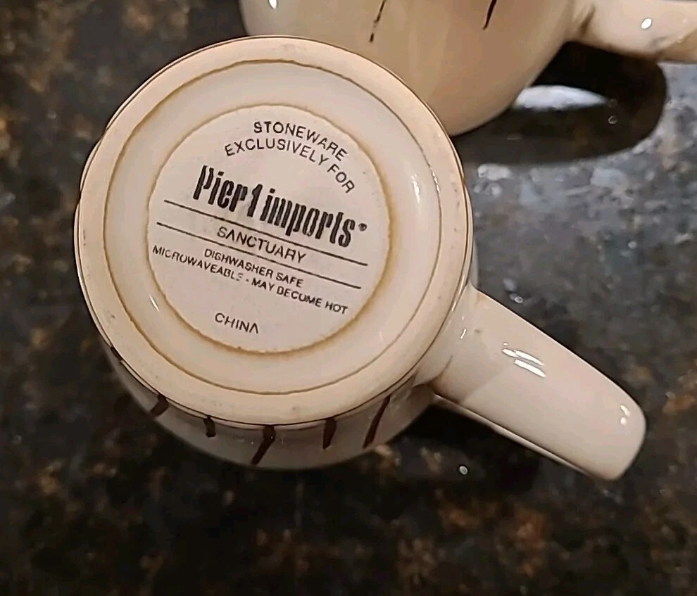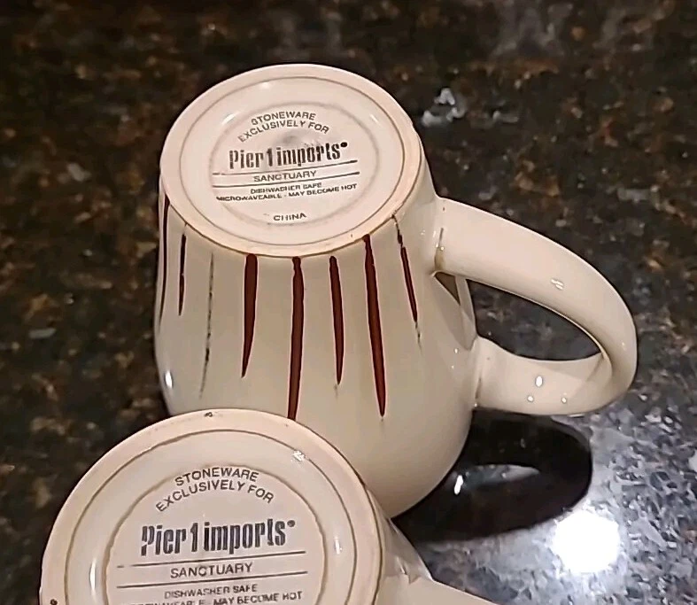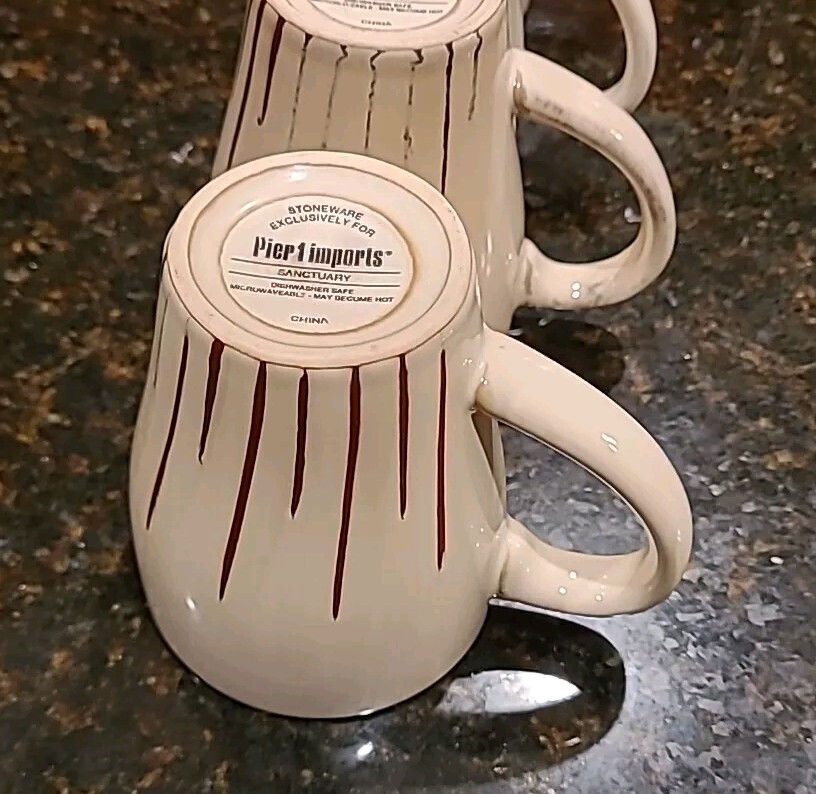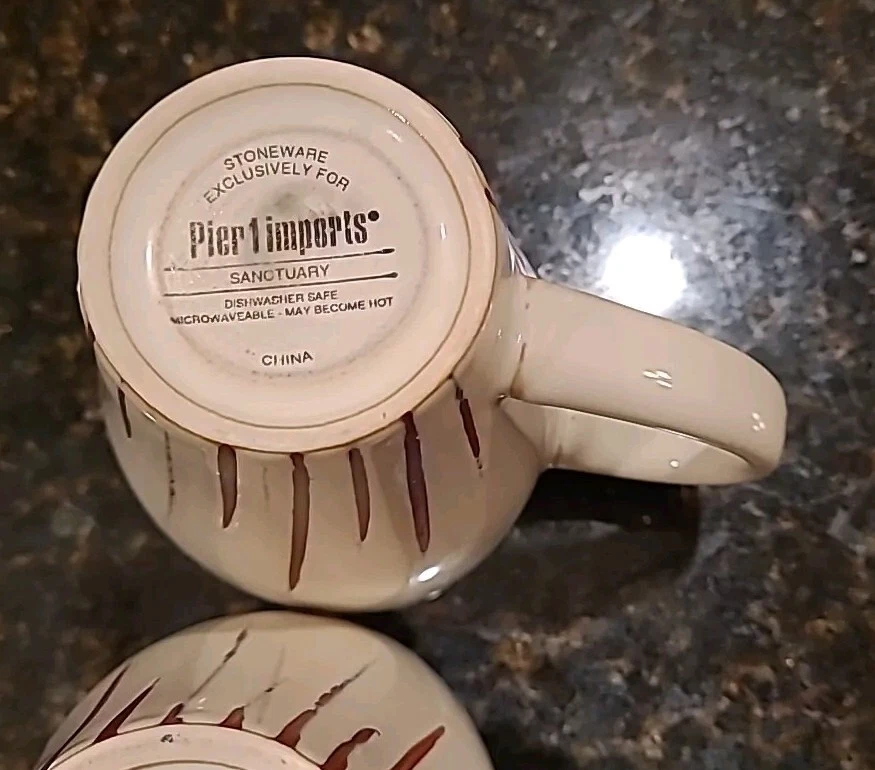 This set includes four round, 13 oz capacity coffee mugs from Pier 1 Imports in the Sanctuary pattern. Made of heavy stoneware, each mug has a neutral color design and is microwave and dishwasher safe. With a glossy finish, these mugs are suitable for hot beverages and have a printed backstamp. Perfect for all occasions, these Pier 1 coffee mugs are a stylish addition to any kitchen or dining set. Mugs are used, but in great condition. No cracks, crazing or chips. No stains. Some clear scratches from use. See images. Shipping cost is for USPS Ground Advantage. Package may be upgraded to UPS Ground, or a faster delivery method with USPS, depending on cost and availability. ________________ Please review all photos carefully and feel free to reach out with questions. It's our goal to provide an accurate description of items to meet or exceed your expectations. We ship quickly and pack thoroughly, taking extra time and using good/enough materials to ensure safe delivery of purchases.
