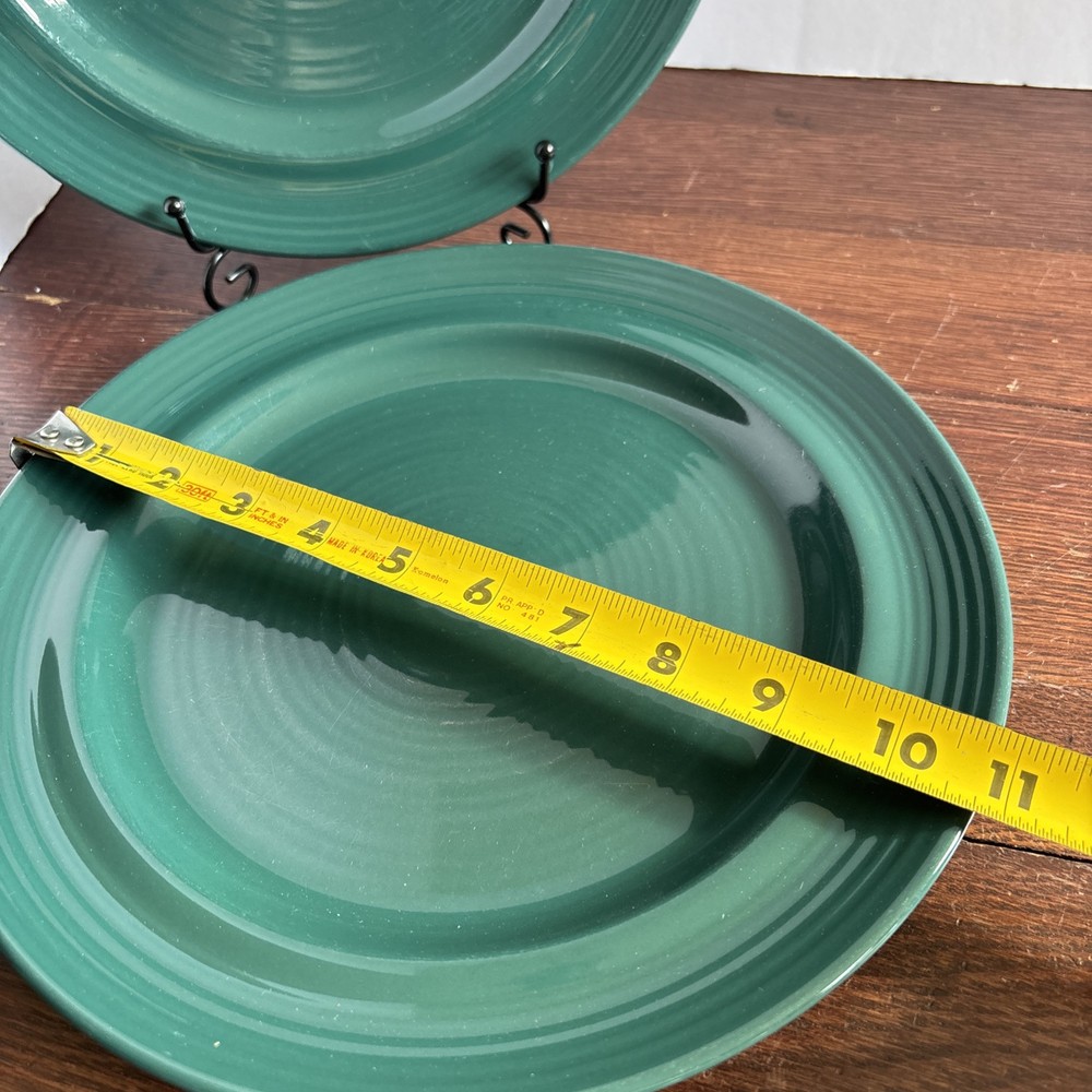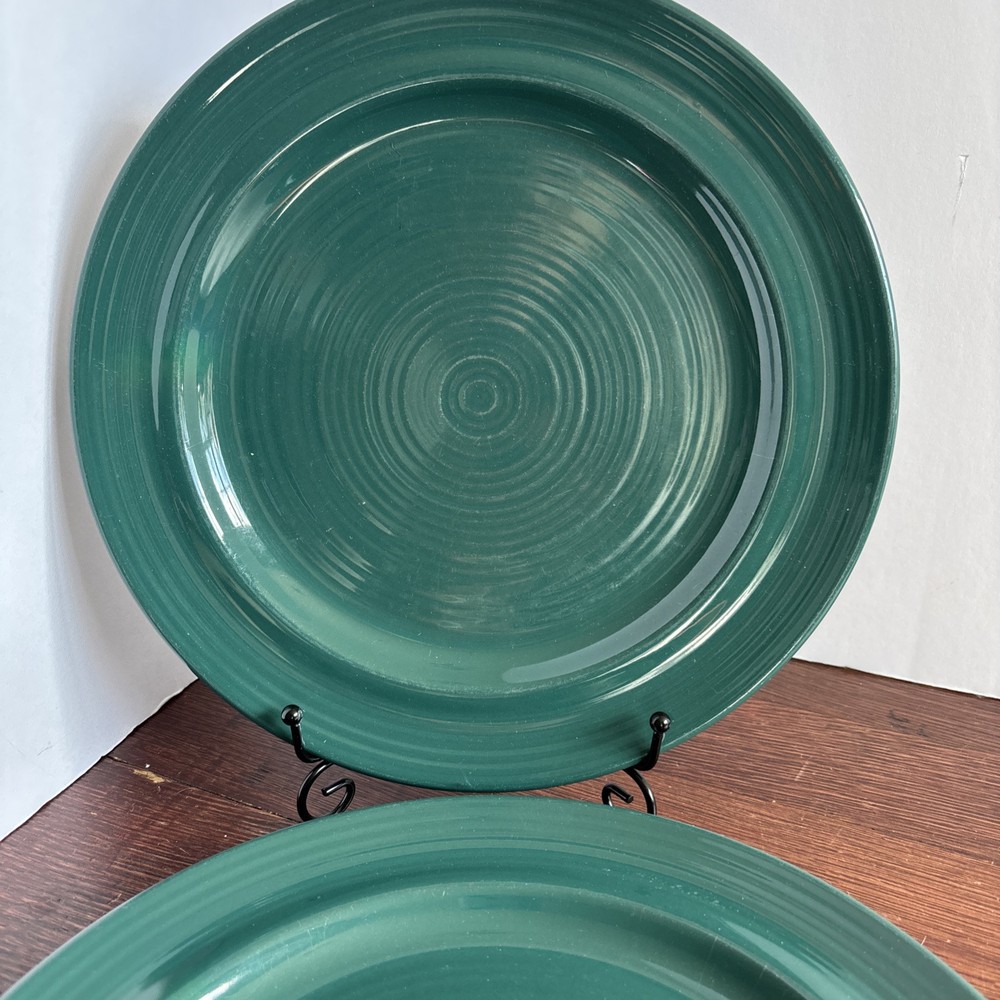Set of 2 Pier 1 Festival teal green dinner plates with a swirl pattern. Each plate has a diameter of 10 3/4". Made of stoneware in a contemporary style, these round plates are dishwasher safe. They are an original production from the 2000-2009 time period in Japan and feature a glossy finish. Ideal for all occasions, these plates are part of the Festival product line by Pier 1.