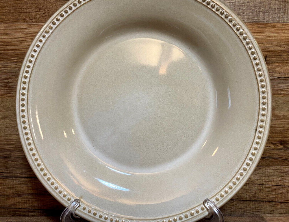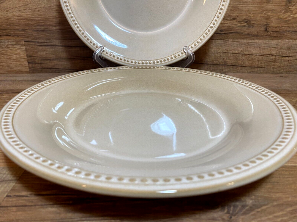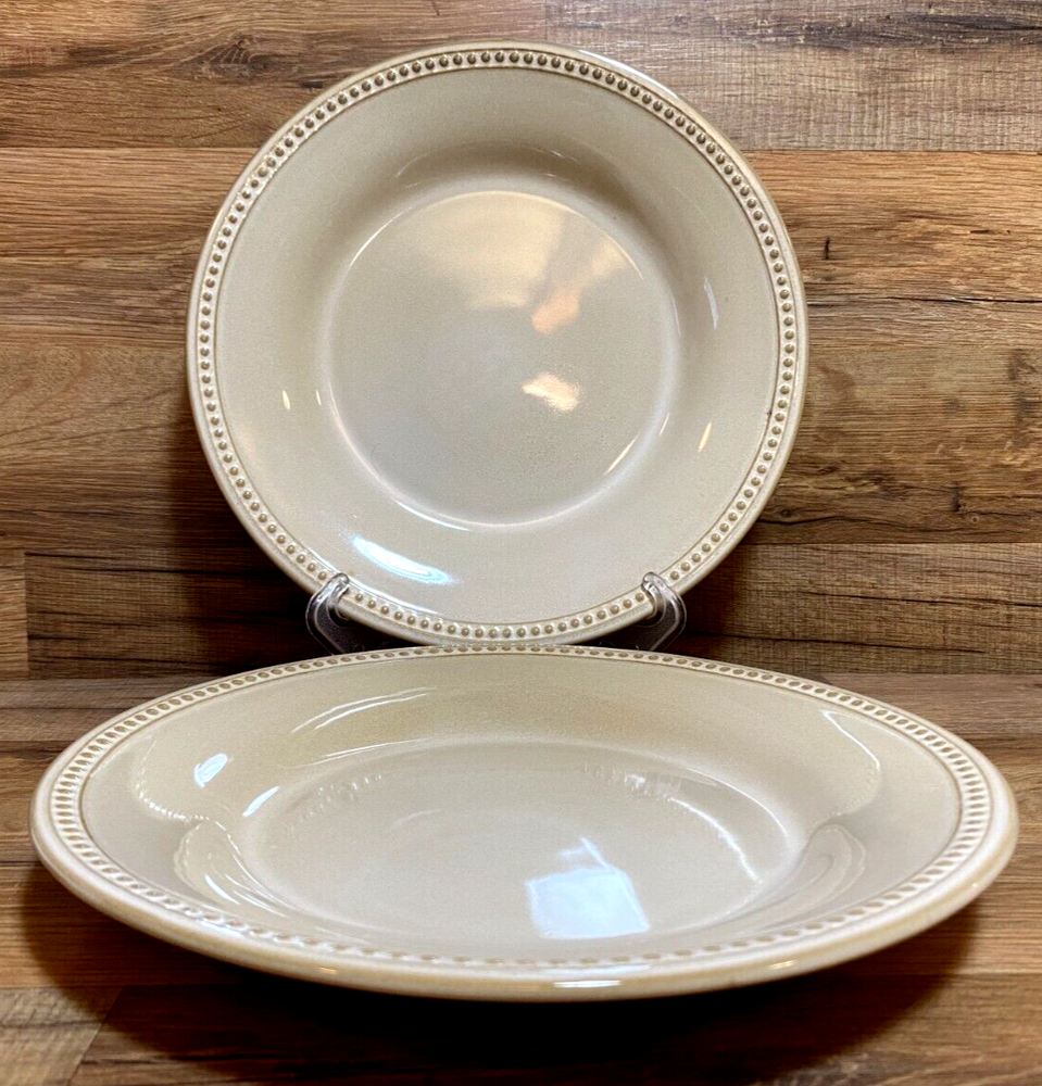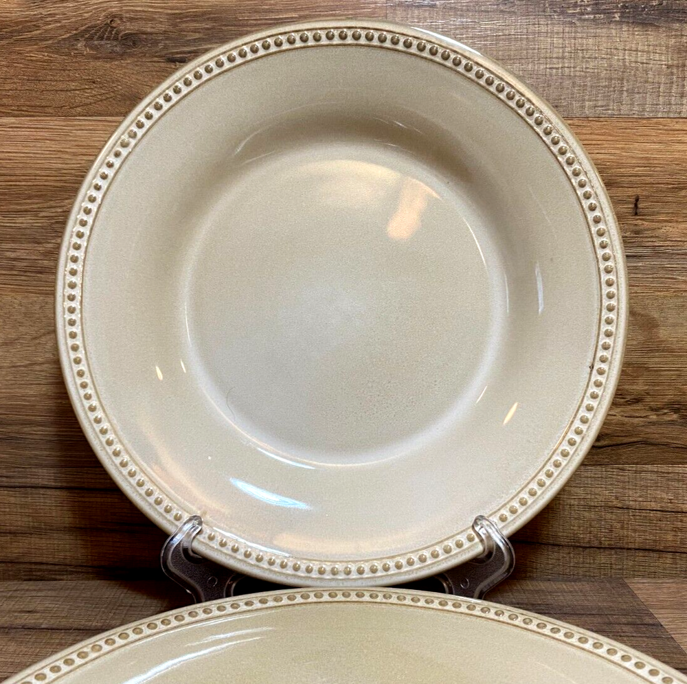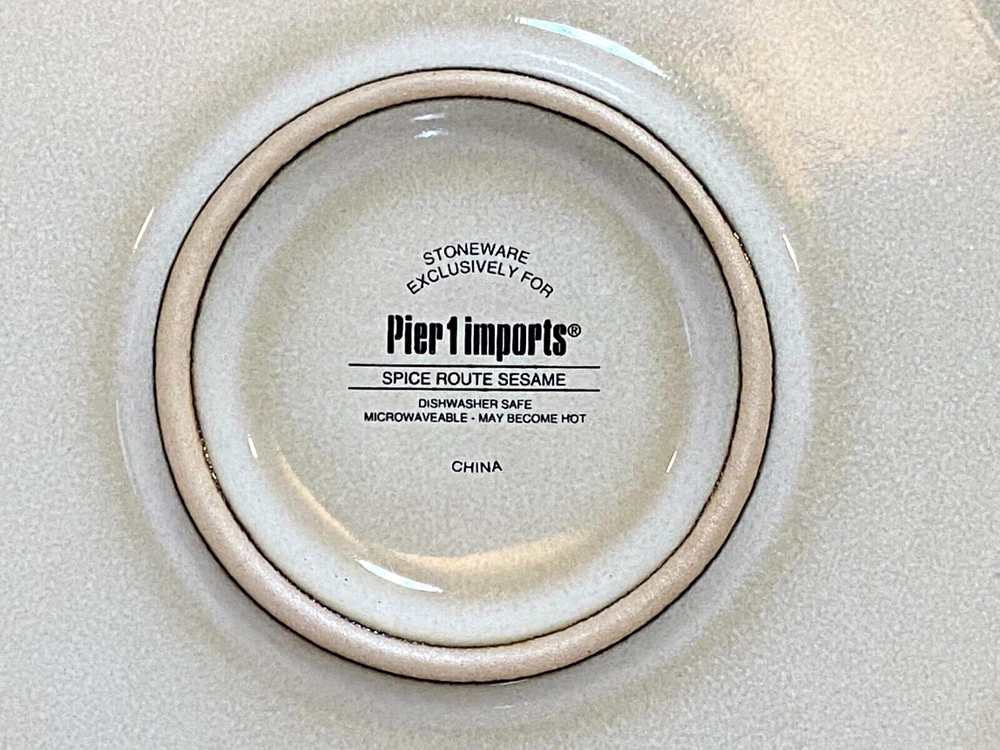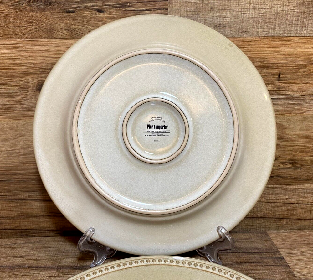 SET OF 2 - PIER 1 IMPORTS - SPICE ROUTE - SESAME - 10 3/4" ROUND DINNER PLATES ROUND PLATES WITH A BEADED PATTERN RIM CLEAN - NO CHIPS - MINIMAL SIGNS OF USE - EXCELLENT USED CONDITION SIZE - 10 3/4"" DIAMETER - WEIGHT - APX. 1.8 POUND - EACH SELLING A FEW SETS OF SESAME PLATES - AS SOME ARE LIGHTER & SOME DARKER THIS IS A LIGHTER COLOR SET - SEE CLOSE UP PICTURES SEE WHATS ON SALE - VISIT OUR STORE SEE OUR OTHER LISTING - SAVE $$$ ON COMBINED SHIPPING CORELLE - CORNING WARE - PYREX - PFALTZGRAFF - IKEA - SANGO - HOME TRENDS - TUPPERWARE