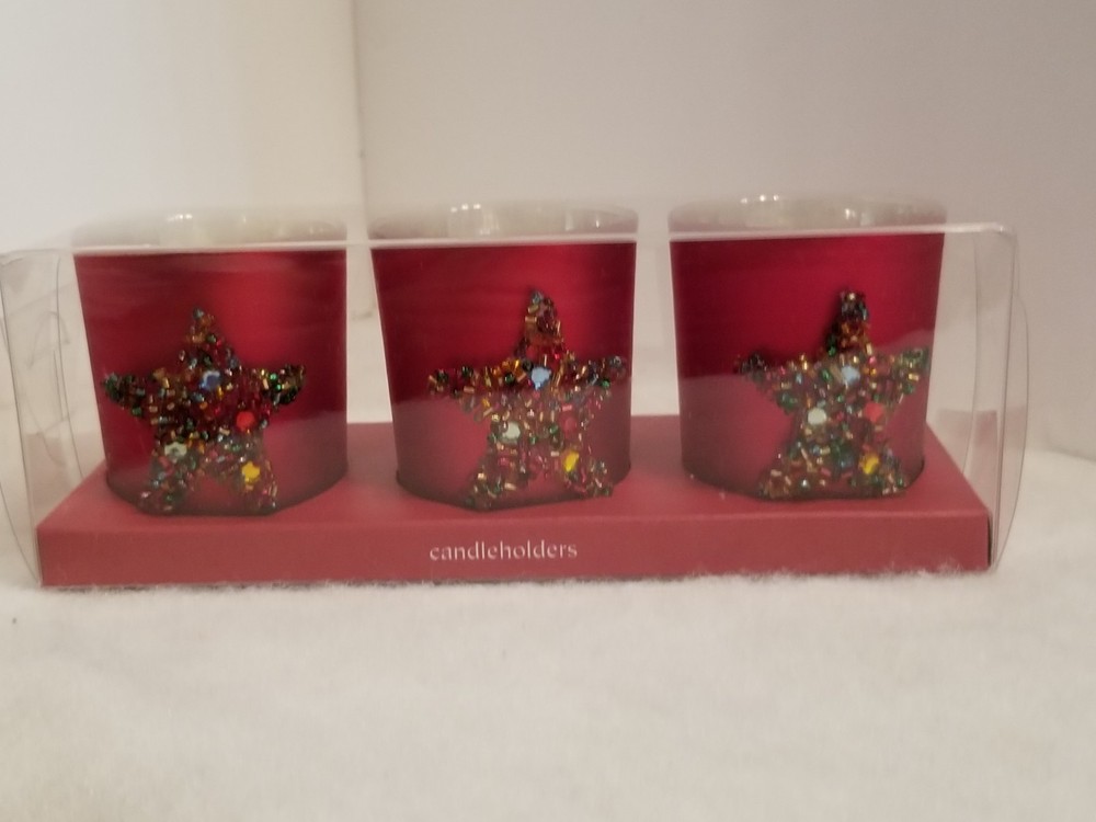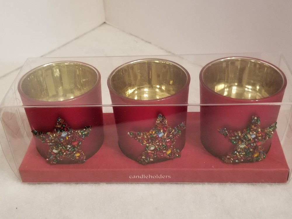 SET OF 3 PIER 1 IMPORTS GLASS FROSTED RED CANDLE HOLDERS BEAD STAR DESIGN 2 1/2" - ALL IN BEAUTIFUL CONDITION - USE WITH TEA LIGHT OR VOTIVE CANDLES ONLY #H
