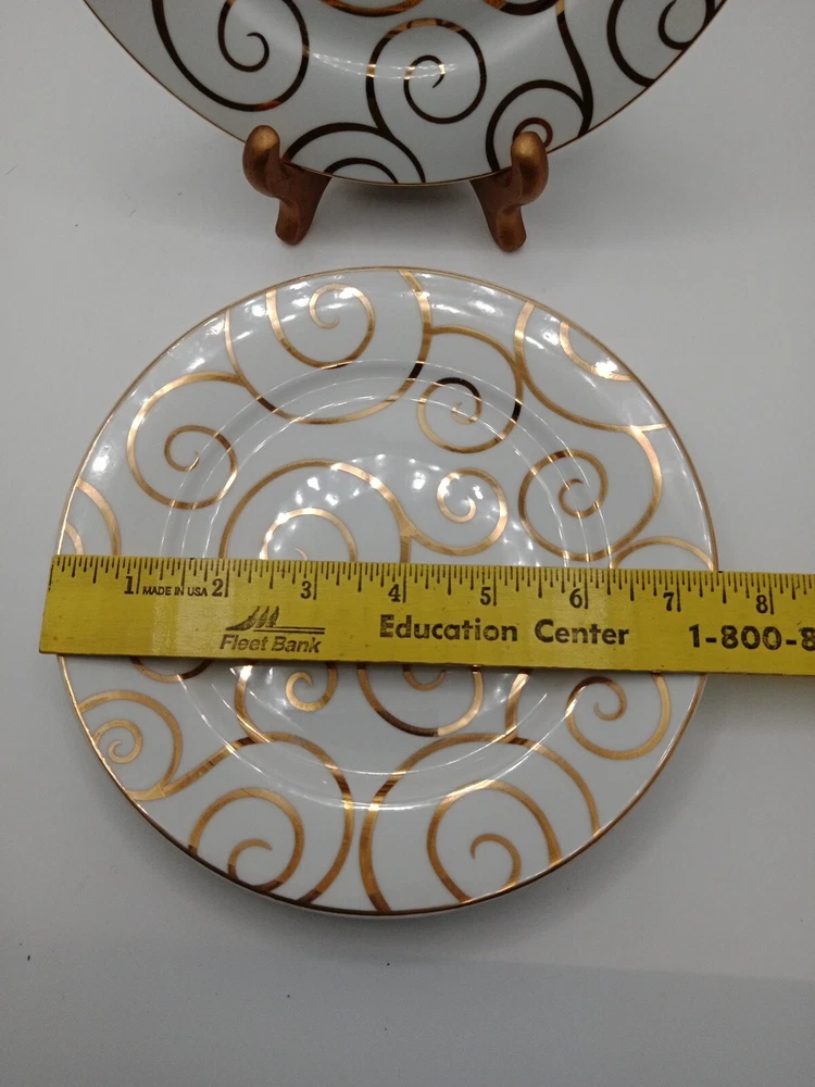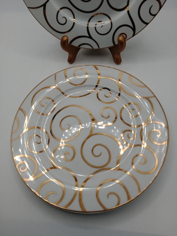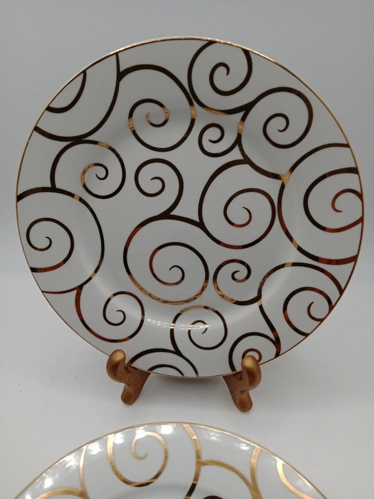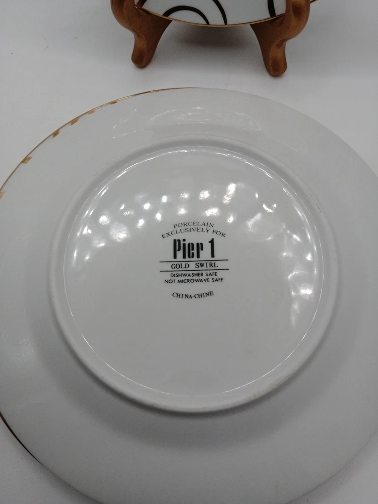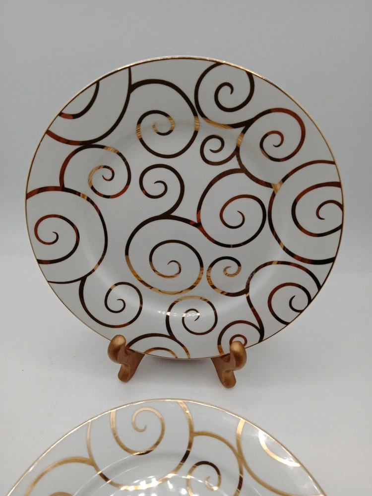 SET OF 3 PIER 1 GOLD SWIRL SALAD PLATES 7 5/8" NEW. No chips or cracks. In very good condition. No noticeable scratches. Clo9