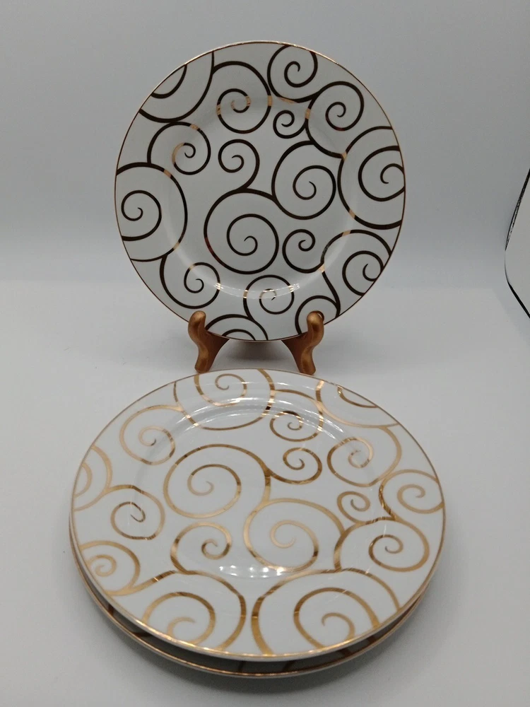 SET OF 3 PIER 1 GOLD SWIRL SALAD PLATES 7 5/8" NEW. No chips or cracks. In very good condition. No noticeable scratches. Clo9...