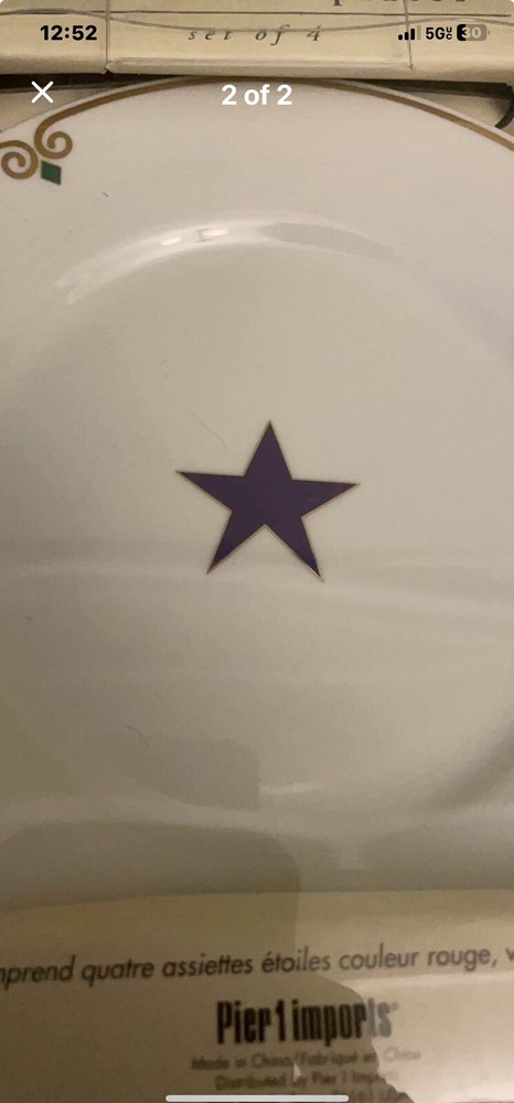 The set contains four star plates in red green purple and blue never used still in original box Width: 7 5/8 in Special Characteristics: BLUE STAR Crafted In China...