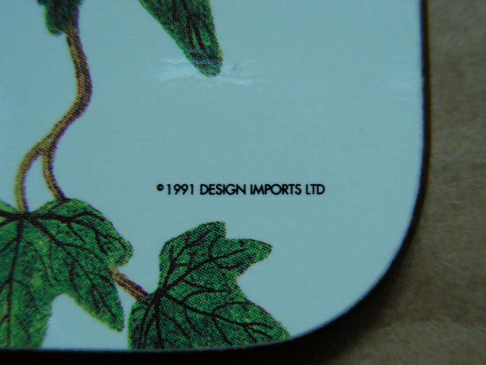 Up for sale is a (Set of 5) Design Imports Ltd 1991 Leaves and Berries Coasters with Cork Bases. Each measures 4 1/2" x 3 3/4". Please feel free to ask any questions and thanks for looking. I ship to the United States via USPS First Class Mail or USPS Priority Mail. I also ship Worldwide via USPS First Class Mail International or USPS Priority Mail International. I will be happy to combine any and all purchases into one package to save you a little money but you must wait for my invoice with the adjusted shipping cost before making your payment. LC