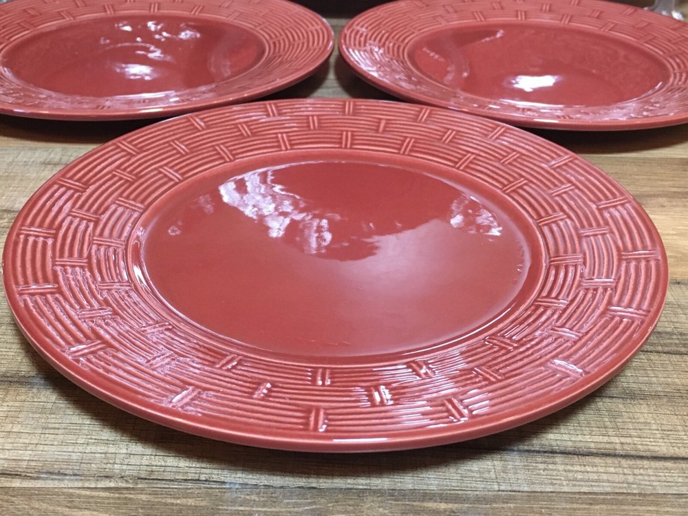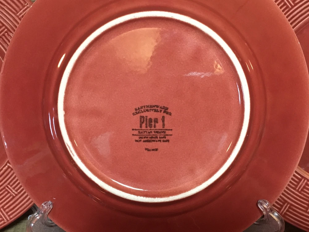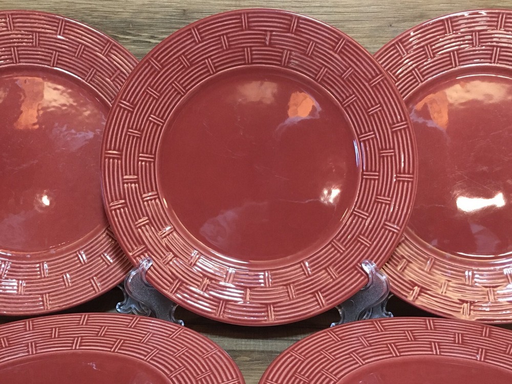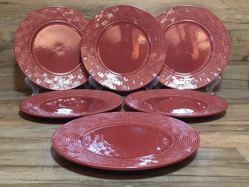SET OF 6 - PIER 1 - RATTAN BASKET WEAVE - BURGUNDY - 8 1/2" SALAD PLATES BURGUNDY COLOR SALAD PLATES WITH A BASKET WEAVE PATTERN ON THE RIM VERY CLEAN - GLOSSY - MINIMAL / NORMAL USE - SEE CLOSE UP PICTURES SEE PICTURES - ACTUAL ITEMS SEE WHATS ON SALE - VISIT OUR STORE SEE OUR OTHER LISTING - SAVE $$$ ON COMBINED SHIPPING CORELLE - CORNING WARE - PYREX - PFALTZGRAFF - IKEA - SANGO - HOME TRENDS - TUPPERWARE