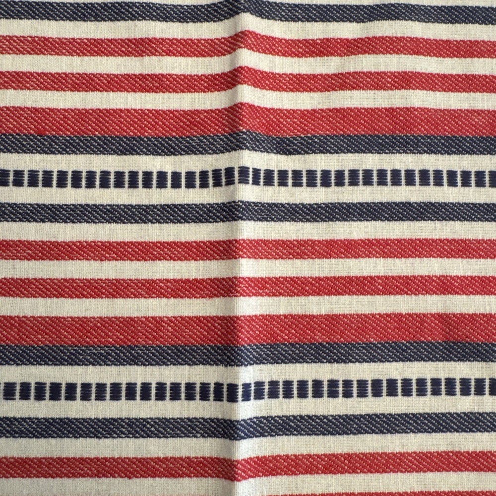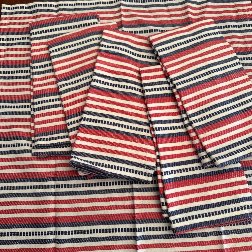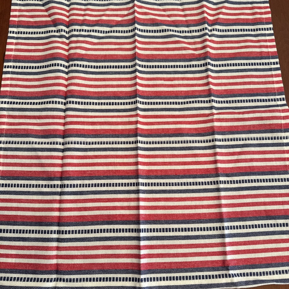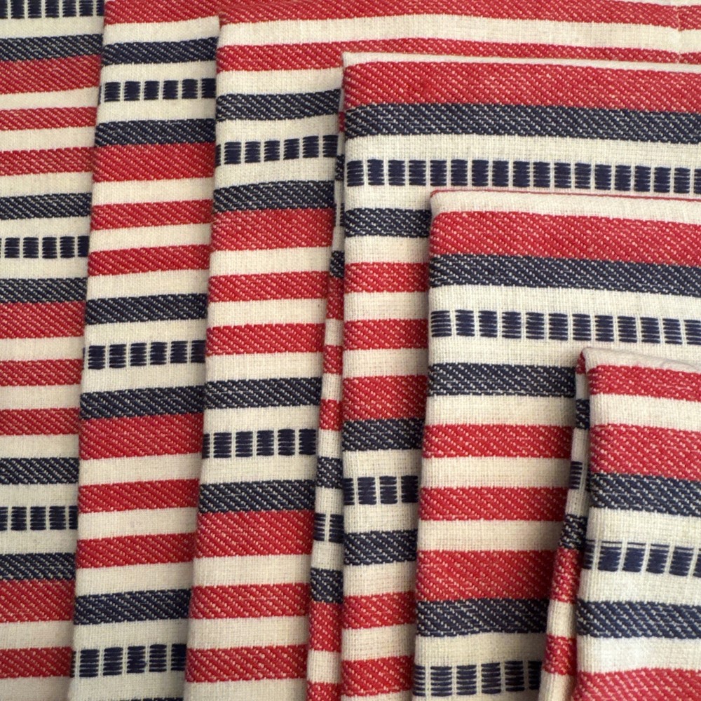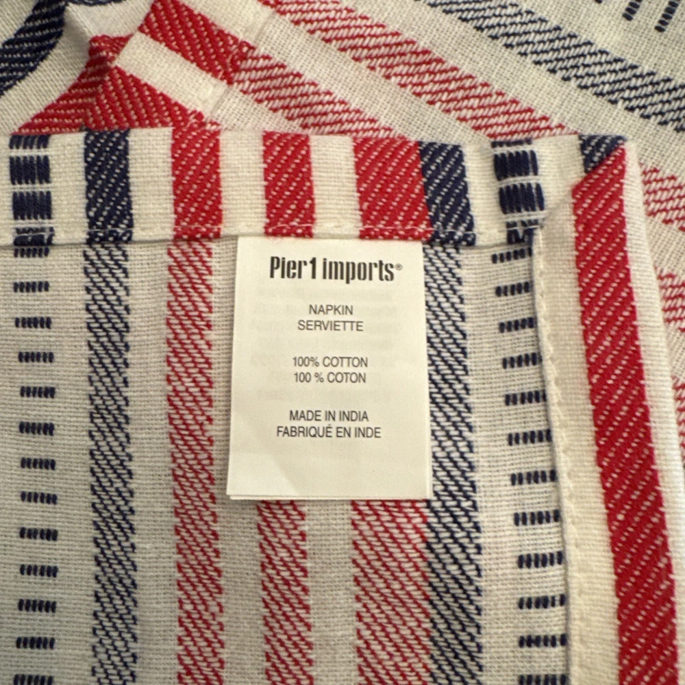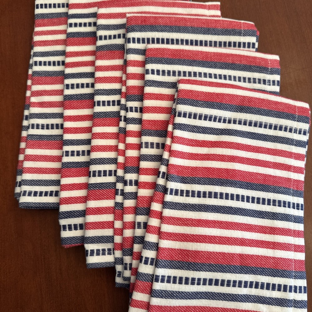 This set of 6 Pier 1 woven red, white, and blue striped patriotic napkins is perfect for adding a touch of Americana to your dining table. Made of 100% cotton, these square-shaped napkins feature a traditional striped pattern in red, white, and blue hues. Machine washable, these napkins are a nice large size and measure 21” square. They are in excellent condition and appear to be new and unused. They are ideal for various occasions and can be used to enhance the decor of your kitchen or dining area, perfect for the 4th of July!