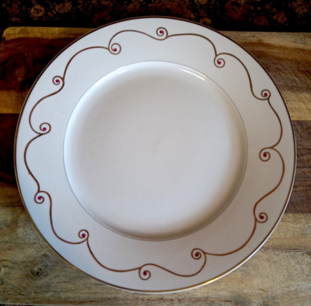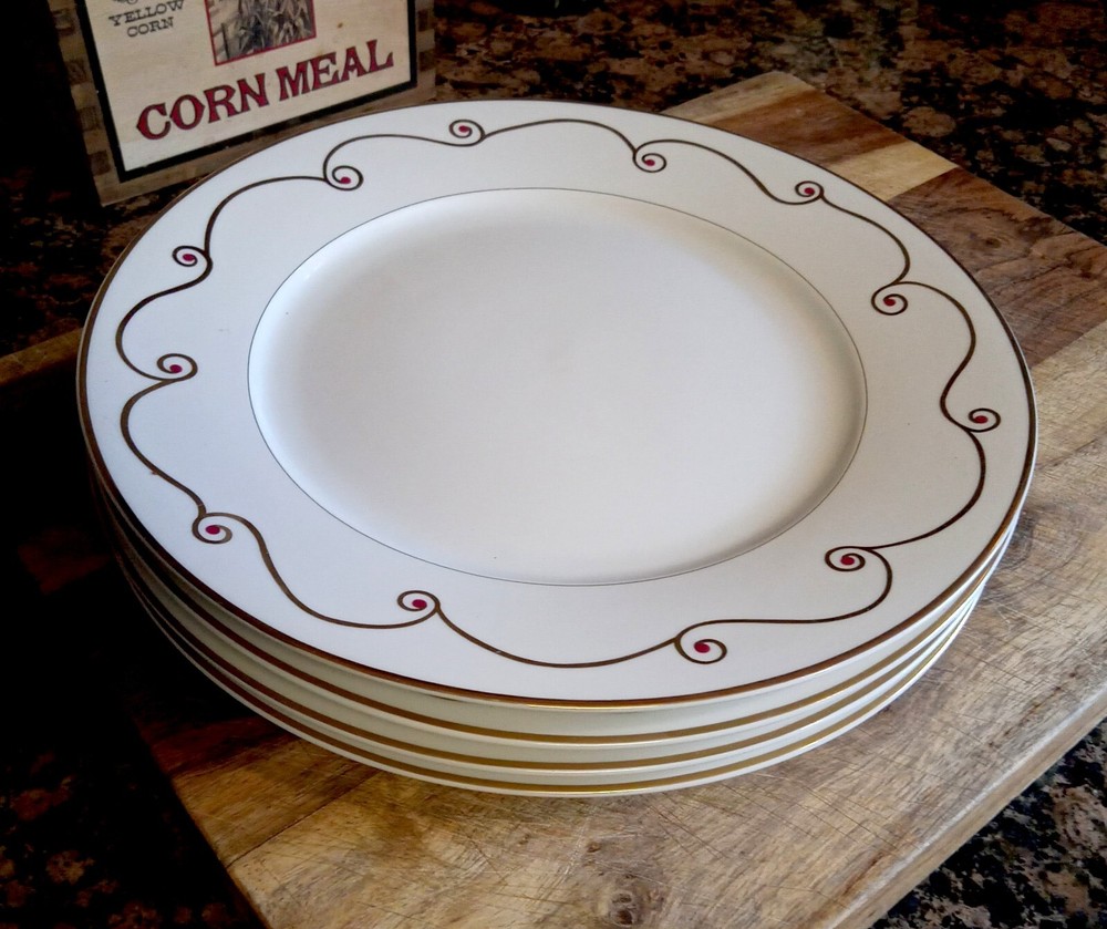 SET of (4) Pier 1 Imports HOLIDAY SCROLL Gold Rimmed 10.5” Dinner Plates Plates are like new with original price stickers still on backs Shipped securely...