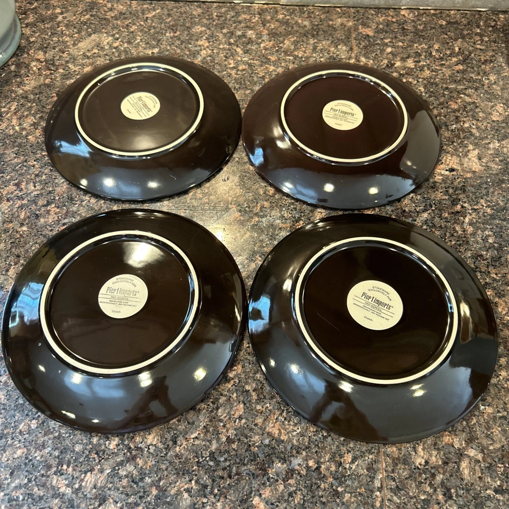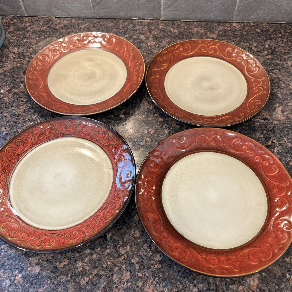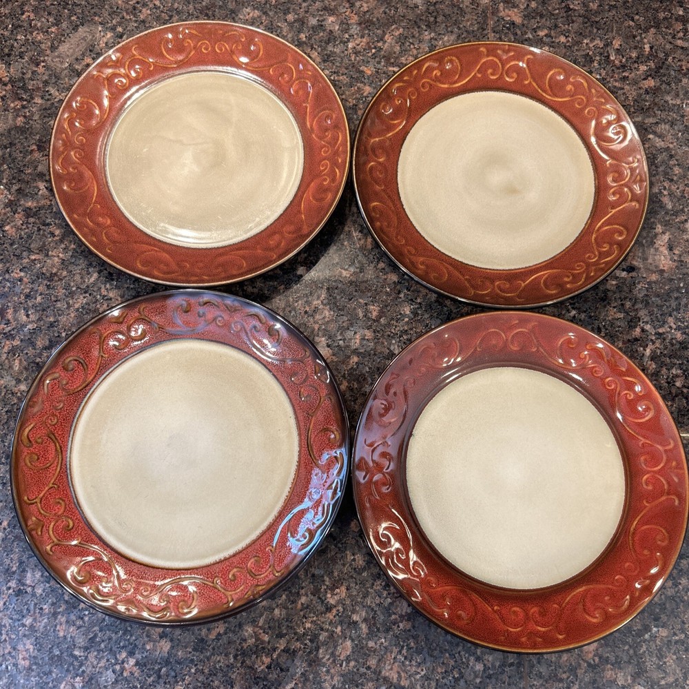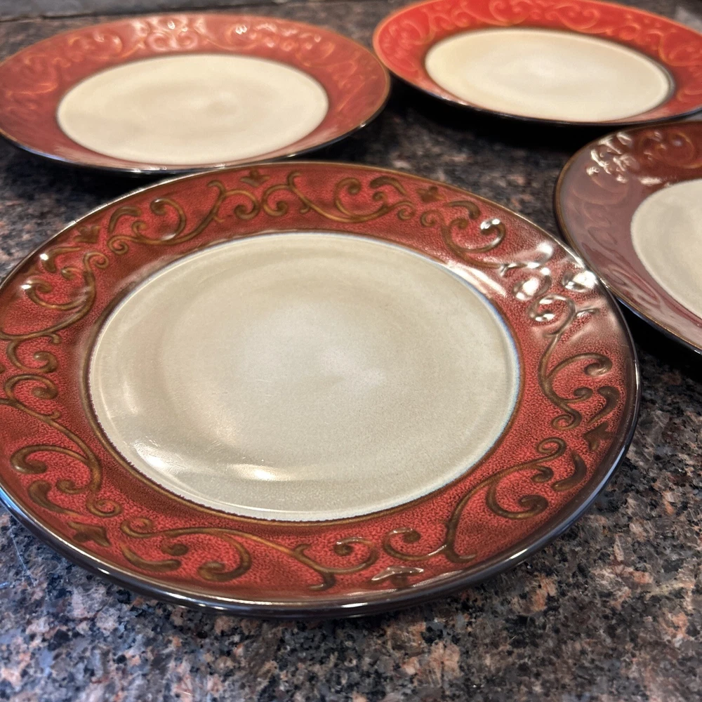 Enhance your dining experience with this elegant eight-piece set of Pier 1 Imports Red Scroll Salad Plates. Each 8.25" stoneware plate features a classic round shape adorned with a decorative red scroll design, bringing a touch of sophistication to any table setting. Ideal for all occasions, these plates are as versatile as they are stylish. Good, preloved condition! No chips or breaks! Colors naturally vary based on plate. Each plate is a slightly different shade. See photos for details
