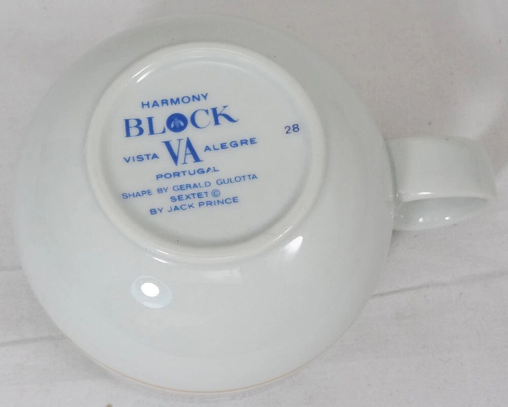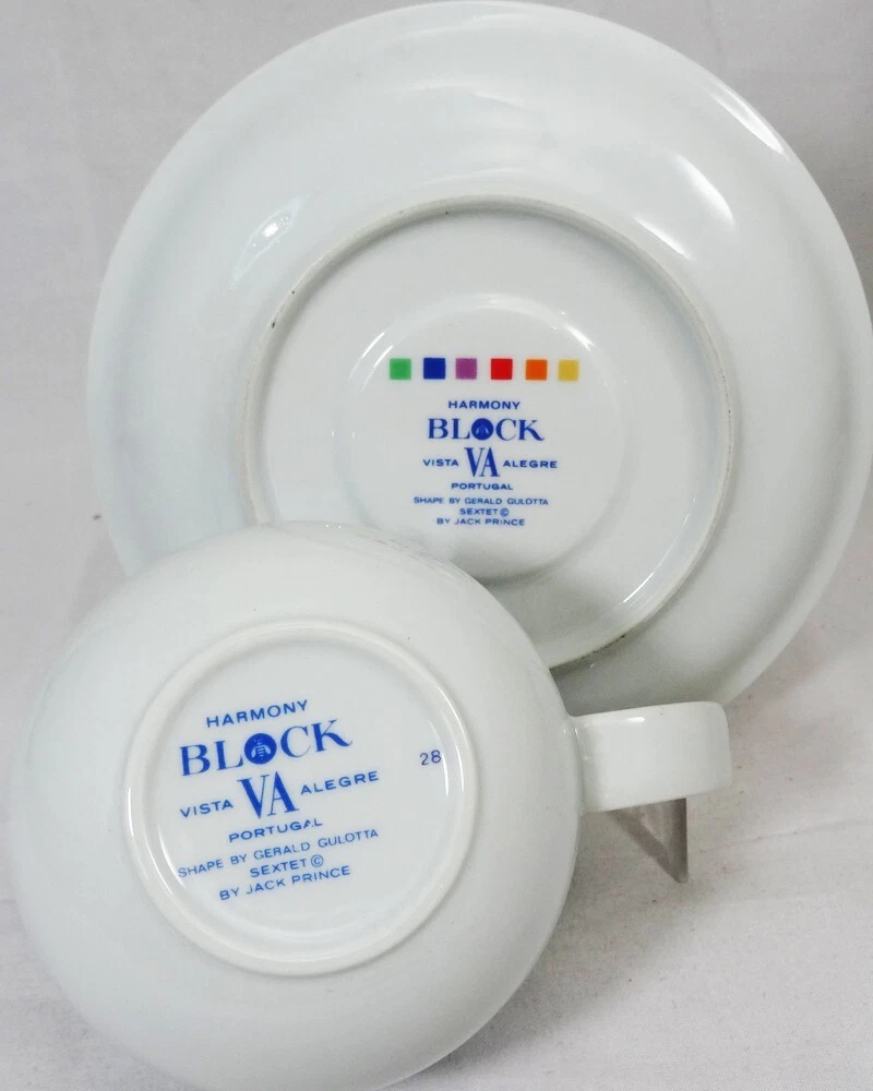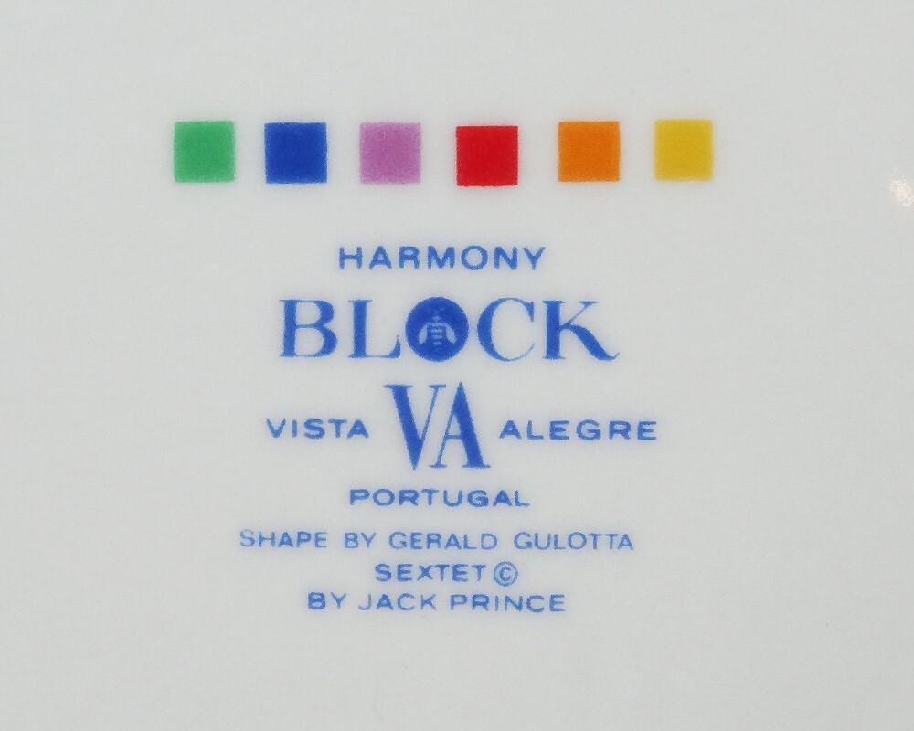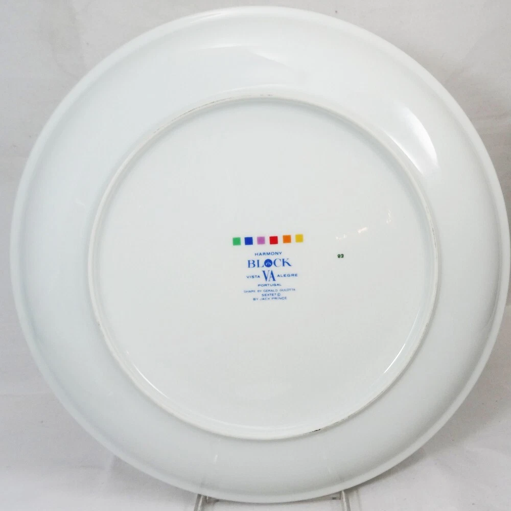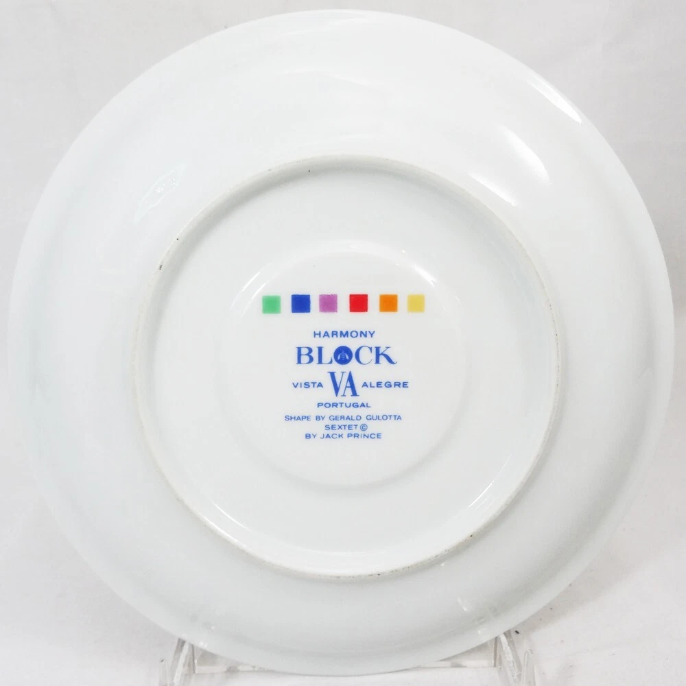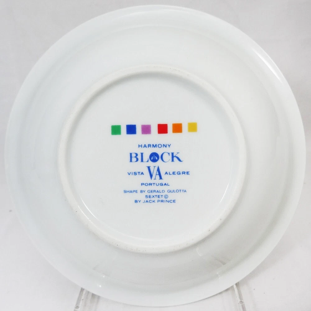 SEXTET by Block Vista Alegre Porcelain Dinnerware made in Portugal White Base & Primary Colours in form of Musical Notation Harmony Collection Pattern Designed by Jack Prince Shape Designed by Gerald Gulotta NEW NEVER USED OR SOLD 5 Piece Place Setting Dinner Plate 10.5" diameter Salad Plate 7.75" diameter Bread & Butter Plate 6.25" diameter Cup 2.5" tall 3.5" at the lip Saucer 6" diameter Shanfields-Meyers Canada Block-Vista Alegre importers for 87+ years WE SHIP TO THE WORLD