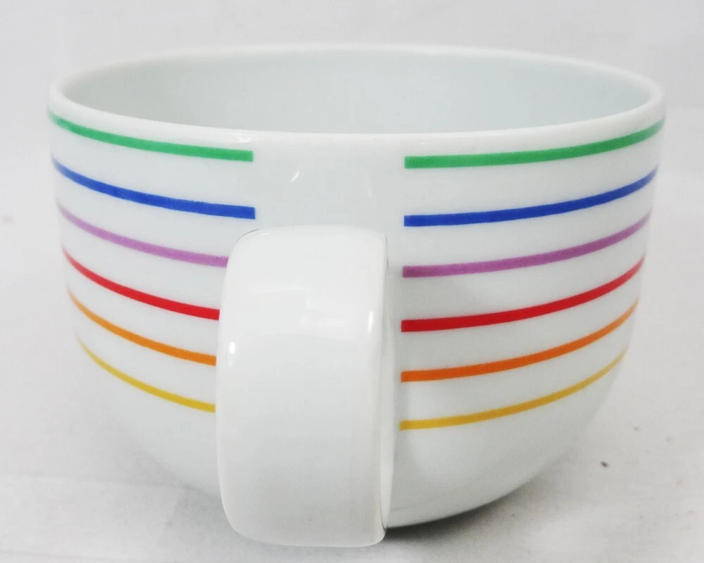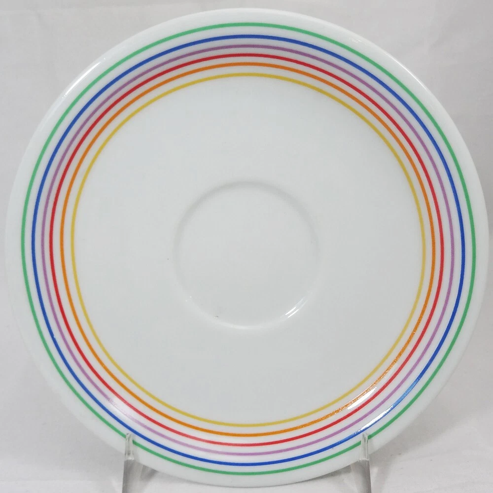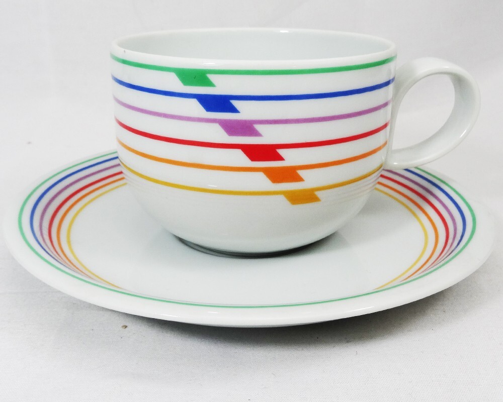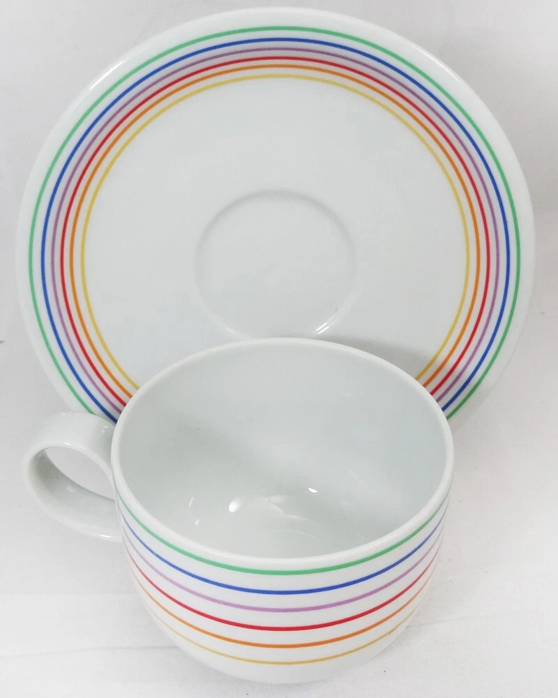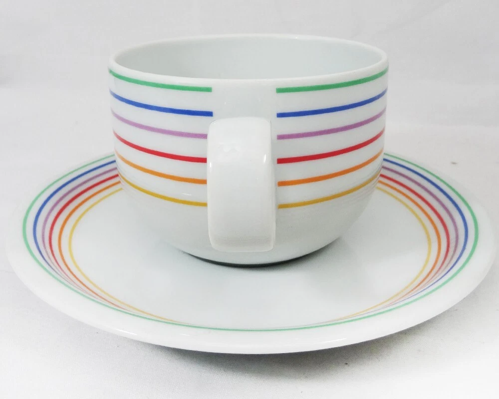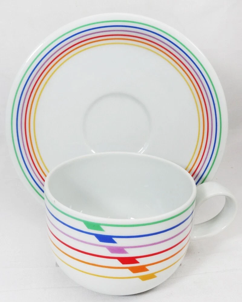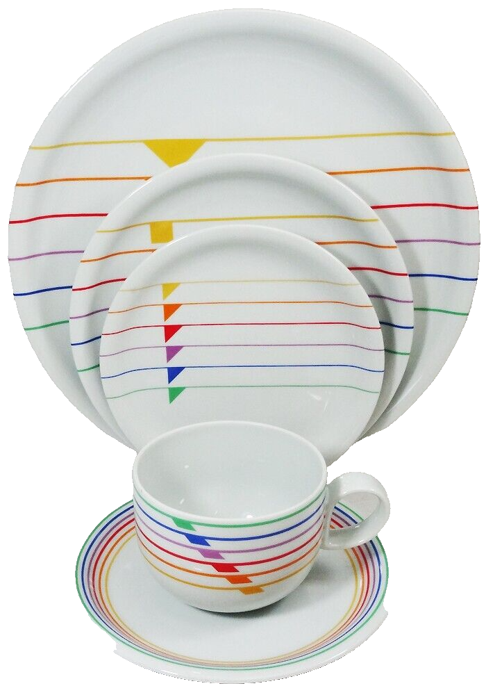 SEXTET by Block Vista Alegre Porcelain Dinnerware made in Portugal White Base & Primary Colours in form of Musical Notation Harmony Collection Pattern Designed by Jack Prince Shape Designed by Gerald Gulotta NEW NEVER USED OR SOLD 5 Piece Place Setting Dinner Plate 10.5" diameter Salad Plate 7.75" diameter Bread & Butter Plate 6.25" diameter Cup 2.5" tall 3.5" at the lip Saucer 6" diameter Shanfields-Meyers Canada Block-Vista Alegre importers for 87+ years WE SHIP TO THE WORLD