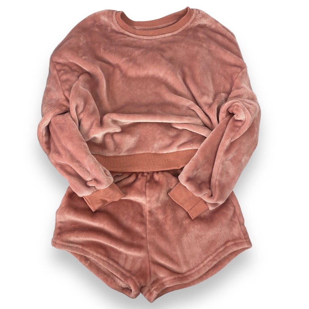 Elevate your loungewear game with this cozy and stylish Shein pink fluffy shorts lounge set. The set includes a comfortable top and bottom that features a solid pattern, long sleeves, and a size type of regular. It's perfect for women who want to stay comfortable and fashionable while relaxing at home.