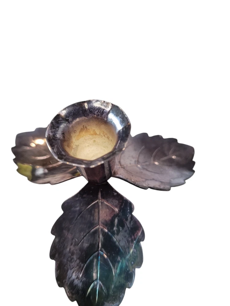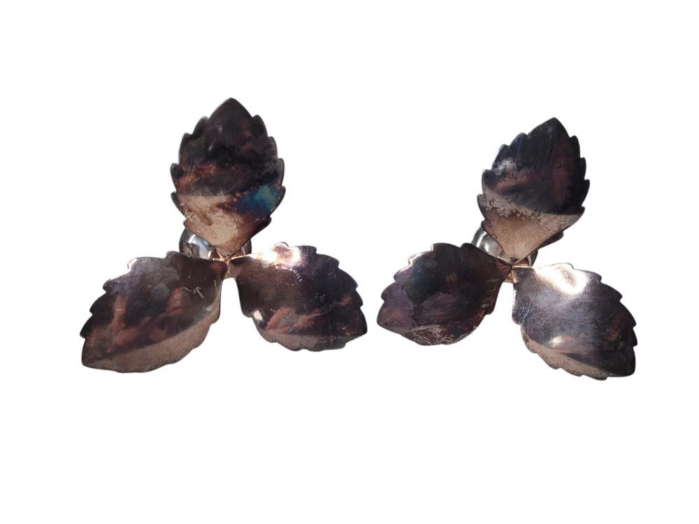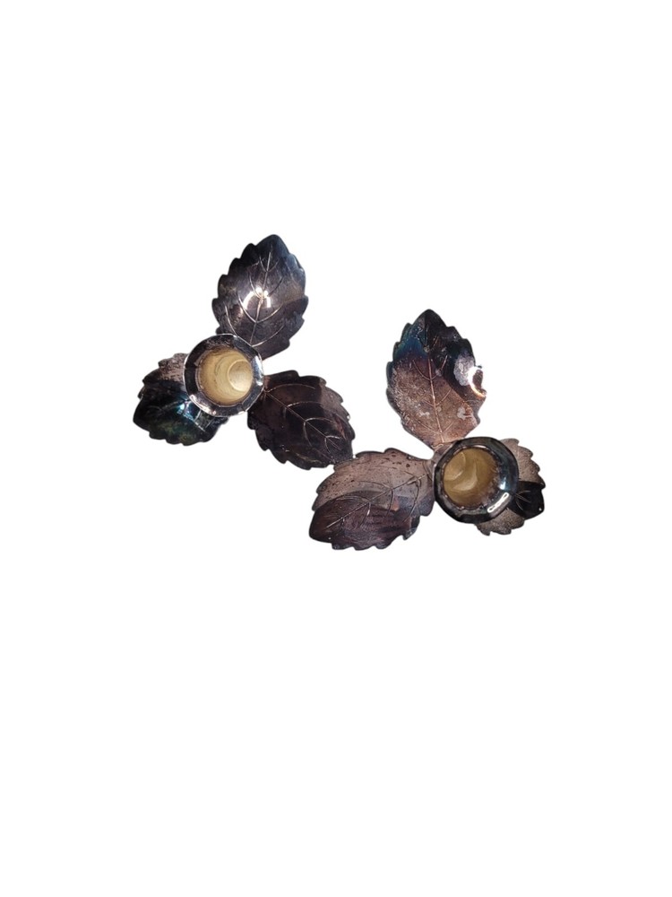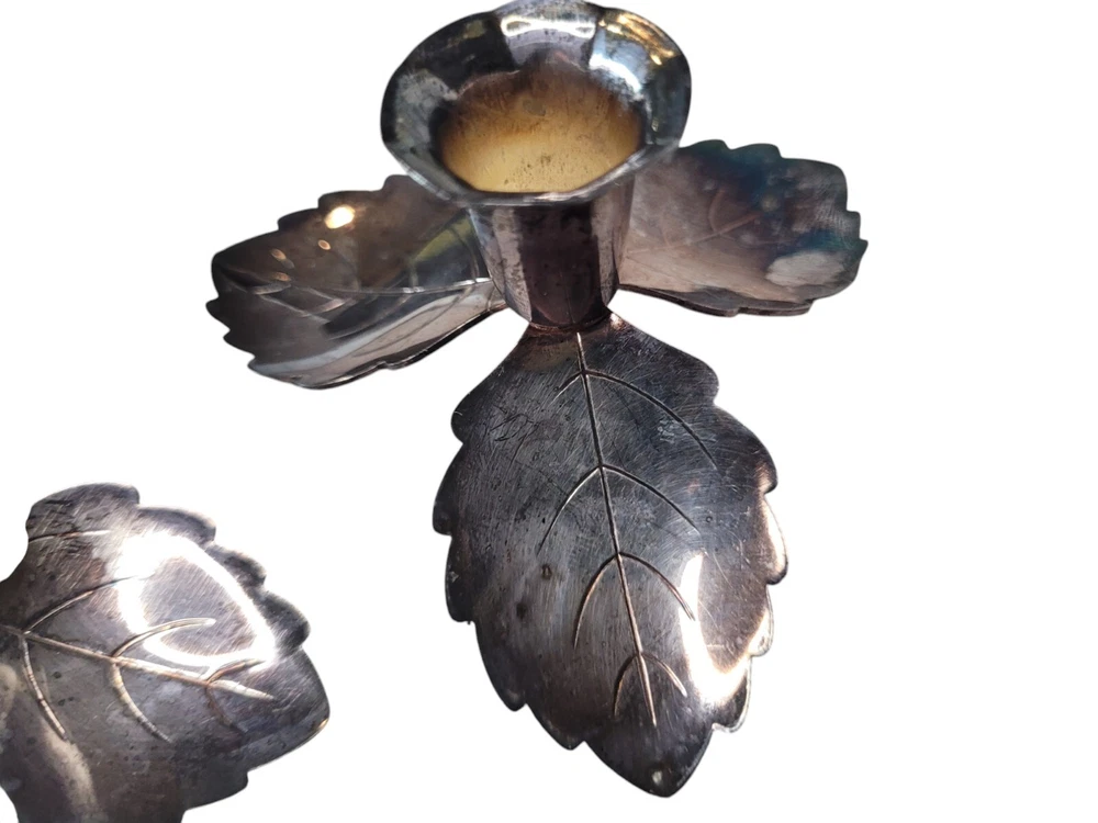 Vintage silver plated three leaf shaped candle holders. Made in Denmark. ALP Imports. From the 60s. Both are tarnished. Fints smaller tapered candles. The openings are about 0.75" About 3" wide.