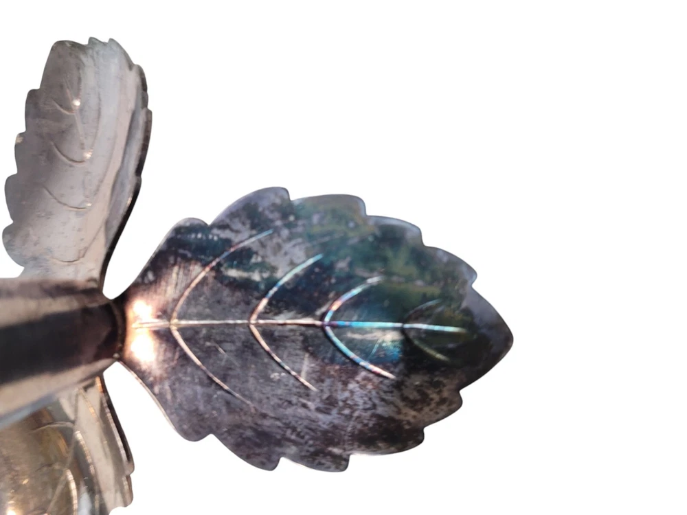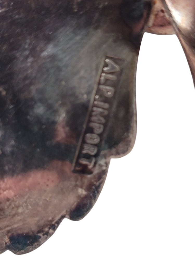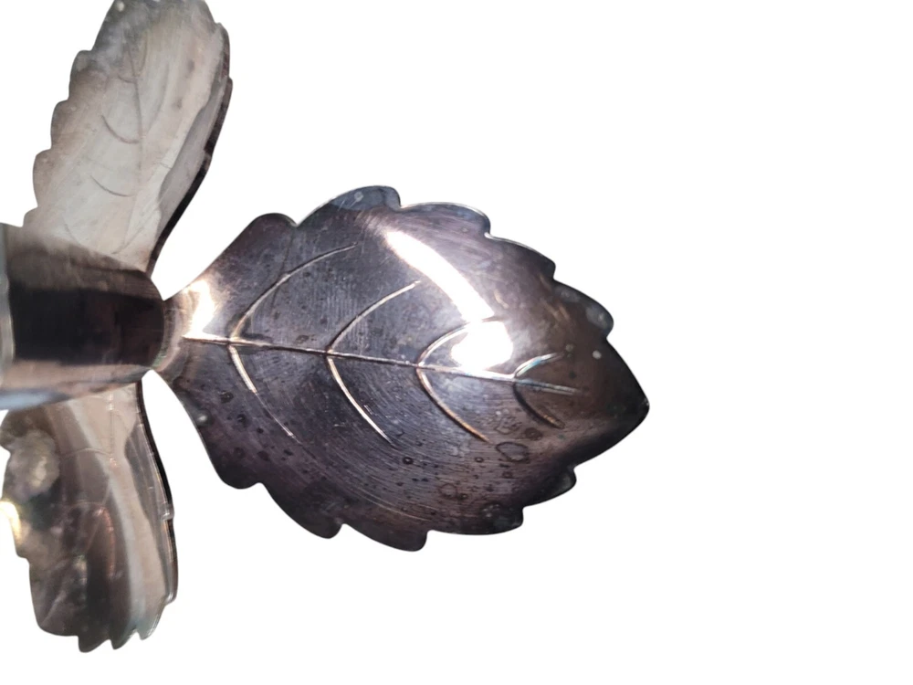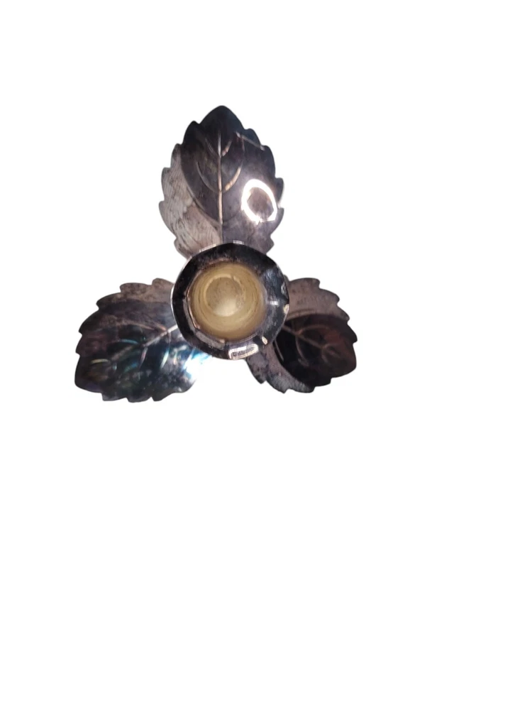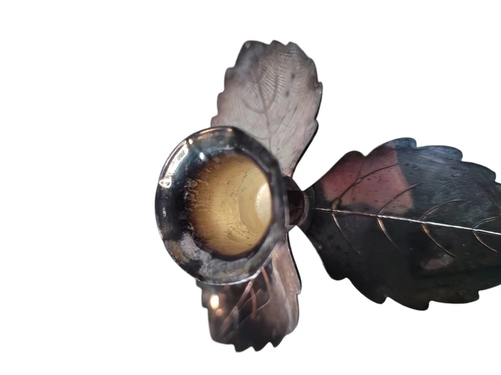Vintage silver plated three leaf shaped candle holders. Made in Denmark. ALP Imports. From the 60s. Both are tarnished. Fints smaller tapered candles. The openings are about 0.75" About 3" wide.