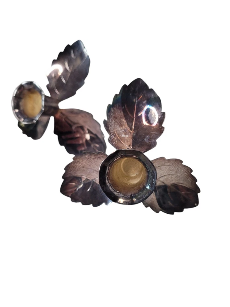 Vintage silver plated three leaf shaped candle holders. Made in Denmark. ALP Imports. From the 60s. Both are tarnished. Fints smaller tapered candles. The openings are about 0.75" About 3" wide....