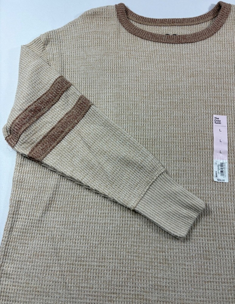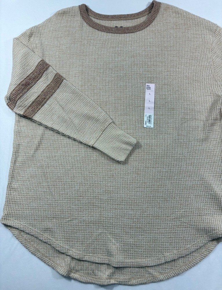 Wrap yourself in the comfort of this SO Cozy Long Sleeve Stripe Waffle Construction Crewneck Tee, a perfect blend of style and snugness for your casual wear. Designed with a cowl neckline and crafted from a soft polyester blend, this beige T-shirt offers a cozy feel with a touch of elegance. Its waffle construction adds a unique texture that makes it stand out in your wardrobe. Available in size Large, this T-shirt is tailored to fit the juniors and teens, adding a relaxed fit to your day. The long sleeves make it a versatile choice for all seasons, ensuring you stay comfortable without compromising on style. Whether you're out for a casual meet-up or just lounging at home, this basic tee will be your go-to for a laid-back yet chic look.