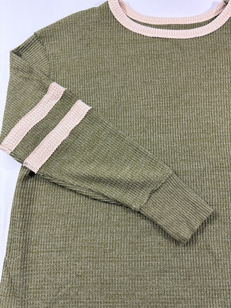 Slip into the ultimate comfort with the SO Cozy Long Sleeve Stripe Super Soft Waffle Construction Crewneck Tee, a perfect blend of style and snugness for the fashion-forward junior. This olive-colored basic tee, sized medium, features a round neckline that complements its long sleeves, offering a classic look that's versatile for any casual occasion. Crafted from a cozy polyester blend, the fabric provides an incredibly soft touch that you'll want to wear day after day. Whether it's for a laid-back day out or a relaxed evening, this striped tee from SO is designed to keep you comfortable without compromising on style.