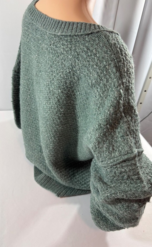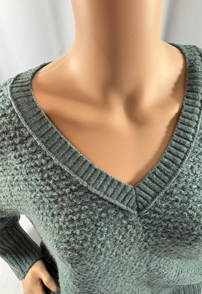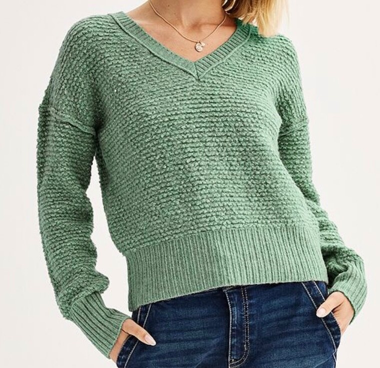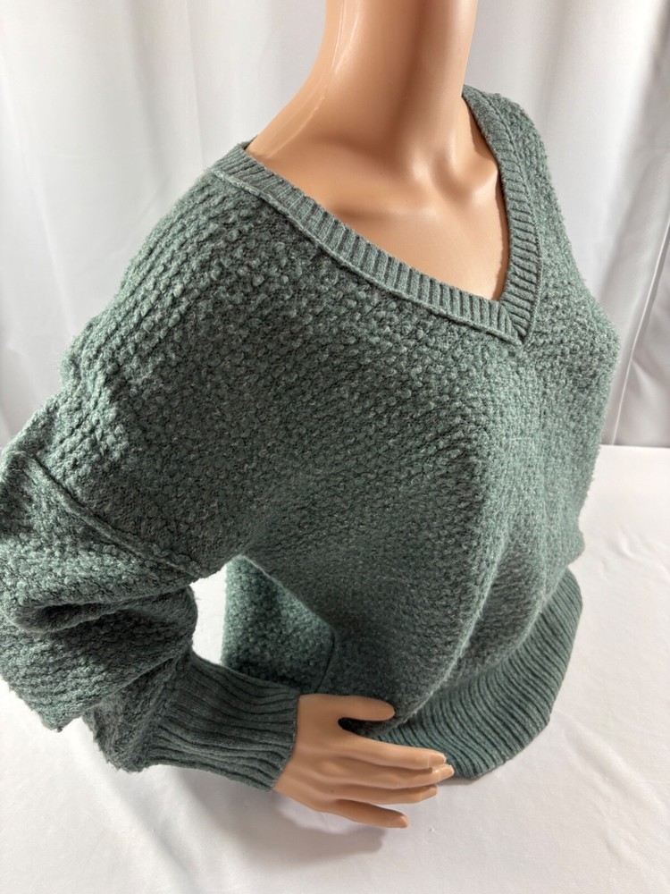The SO Cozy V-Neck Textured Pullover Sweater in size L is a stylish and comfortable sweater designed for women. Made from a polyester blend material, this sweater features a trendy v-neckline and long sleeves, making it perfect for the colder seasons. The green color adds a pop of color to your outfit, while the pullover style makes it easy to wear and layer over your favorite tops. Perfect for those looking for a cozy yet fashionable addition to their wardrobe.