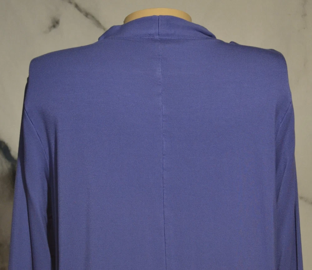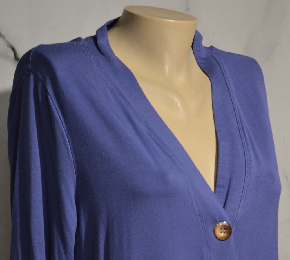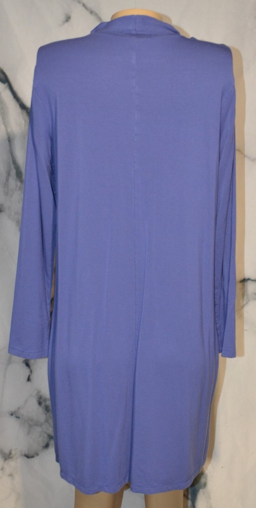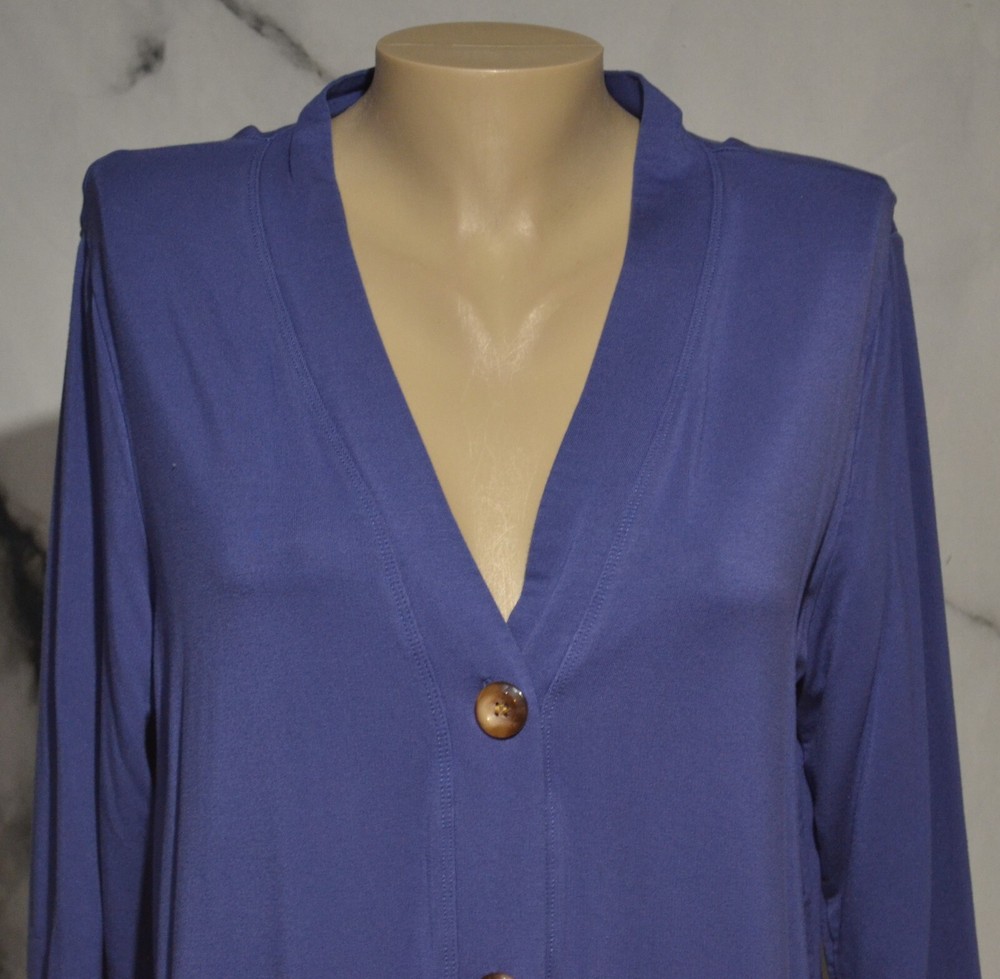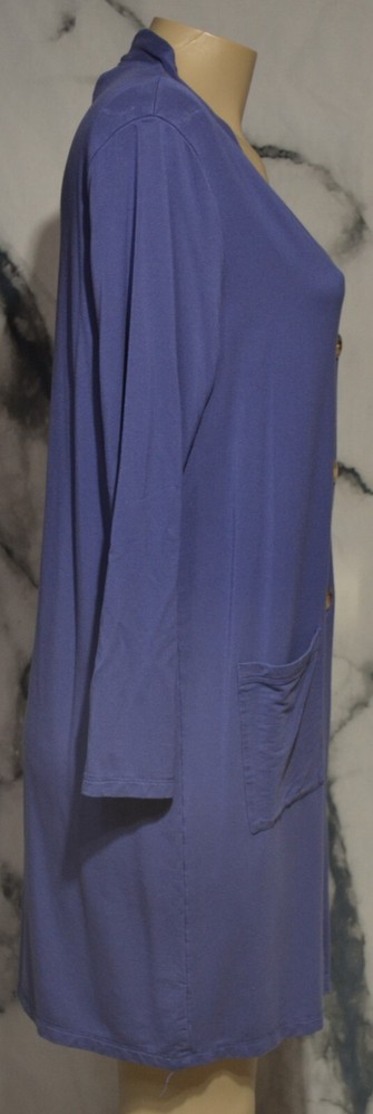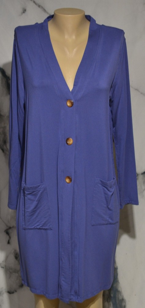 Materials - 91% Rayon, 9% Spandex Condition: Very good Blue duster with front pockets Long sleeves Machine wash cold gentle, tumble dry low Buttons in front No slits Unlined Measurements Bust 41" Waist 42" Sleeves 23" Length 35" Condition Glossary: New - New with tags attached, unworn Excellent - Shows no signs of wear, flawless Very Good - Minimal signs of wear, no flaws unless otherwise noted Good - An item that is special and unique but has heavier wear and/or flaws as noted inkfrog terapeak