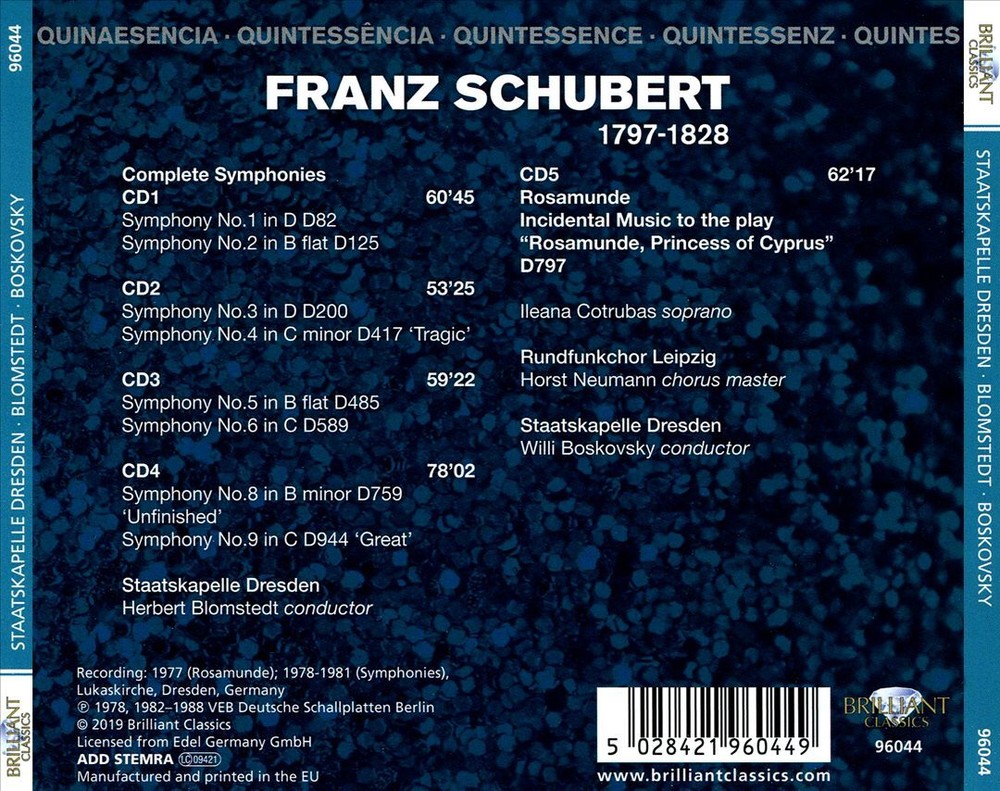 This Schubert collection by Staatskapelle Dresden and Blomstedt is absolutely stunning! The symphonies sound rich and vibrant, and Cotrubas' performance is breathtaking. The recording quality is top-notch, making it a must-have for classical music lovers. Arrived brand new, sealed, and in perfect condition—great value for such a masterpiece! Highly recommend for any serious collector.
