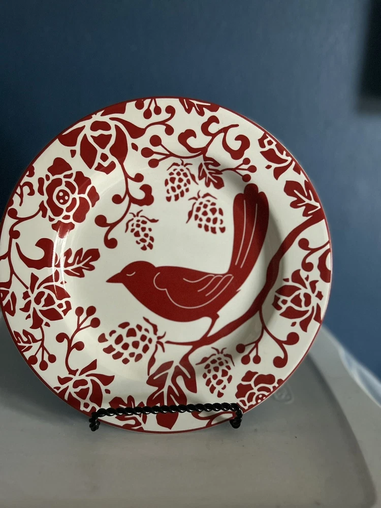 PIER 1 INDONESIA STONEWARE RED BIRD PATTERN SALAD 8 1/4" WIDE PLATE IN GOOD USED CLEAN CONDITION, DISHWASHER AND MICRO WAVE OVEN SAFE, MIGHT GET TOO HOT IN MICROWAVE,...