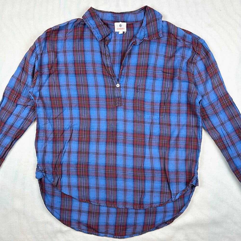 SUNDRY Plaid V Neck Cozy Fit Soft Lightweight Flannel Shirt Womens Size 1...