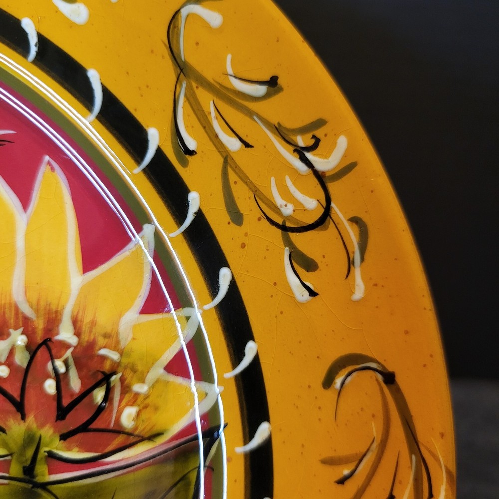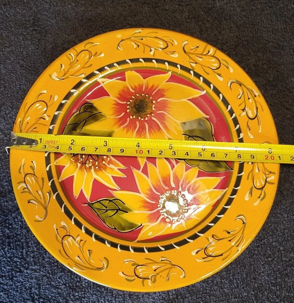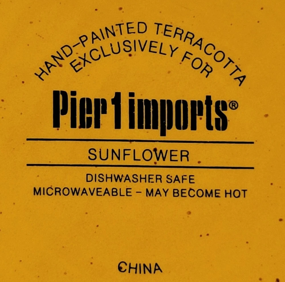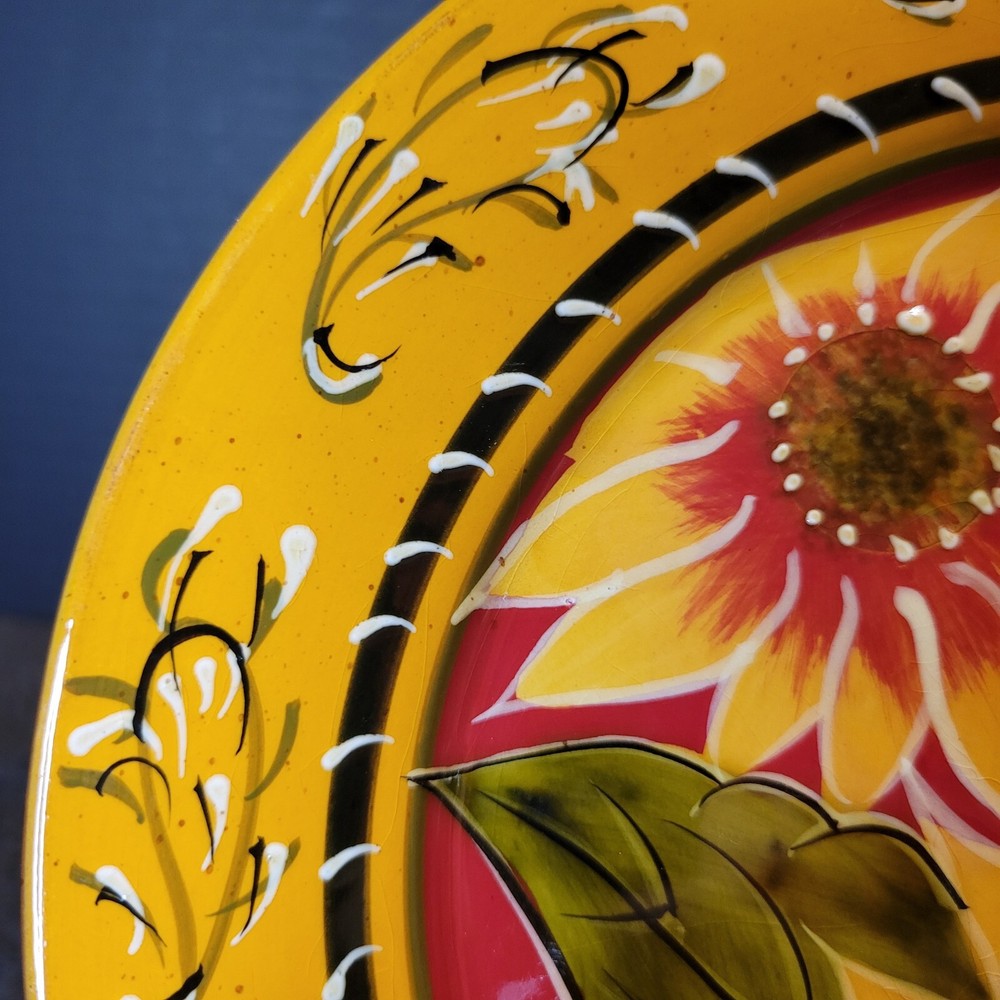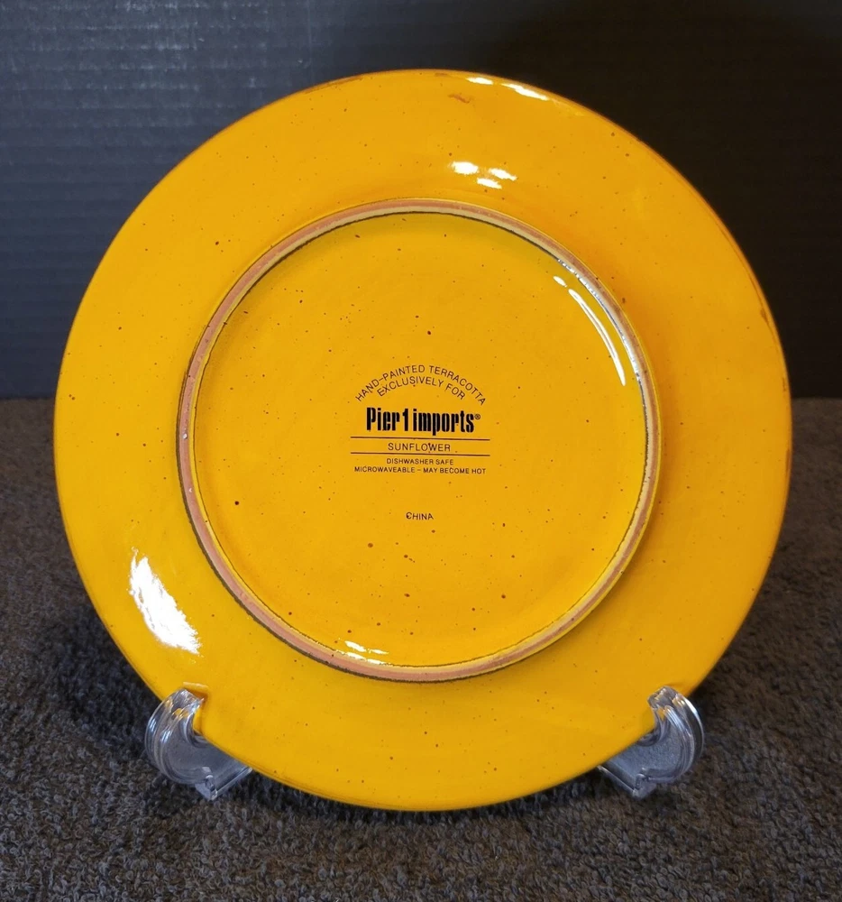 This is a hand-painted terracotta salad plate with a sunflower pattern. It is part of the Pier 1 imports product line. The plate has a round shape and measures 8-1/4 inches in diameter and 3/4 inches in height. It is suitable for all occasions and is not vintage, but is Discontinued. I have several available in flawless used condition. If looking to add, replace or complete your set, here is your chance. Take 1 or if needing several for a volume discount. Shipped via USPS Ground Advantage Mail Services or FedEx Ground Economy for a fast secure delivery