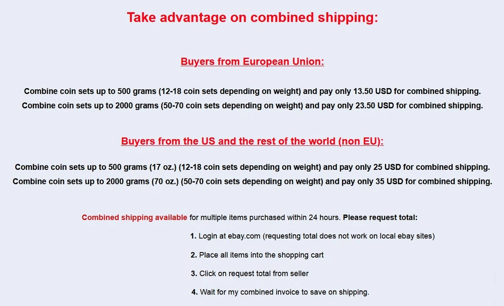 Sweden Complete uncirculated coin set Take advantage on low combined shipping costs described below! Wonderful complete coin set from Sweden in uncirculated condition (UNC) with the following coins: 1, 2, 5 Kronor (KM928, 929, 930) (2016, 2016, 2016) Buyer will receive one set of 3 coins. Please view scans in XXL Scans serve only as an example of the type of coin set on offer. Issue years may differ on the scans. If you are looking for a particular variety, please contact me before bidding. Take advantage on combined shipping: Buyers from European Union: Combine coin sets up to 500 grams (12-18 coin sets depending on weight) and pay only 13.50 USD for combined shipping. Combine coin sets up to 2000 grams (50-70 coin sets depending on weight) and pay only 23.50 USD for combined shipping. Buyers from the US and the rest of the world (non EU): Combine coin sets up to 500 grams (17 oz.) (12-18 coin sets depending on weight) and pay only 25 USD for combined shipping. Combine coin sets up to 2000 grams (70 oz.) (50-70 coin sets depending on weight) and pay only 35 USD for combined shipping. Please READ item's description and shipping policy BEFORE you place a BID to avoid any misunderstanding! If you have any question please do not hesitate to contact me! SHIPPING POLICY Combined shipping available for multiple items purchased within 24 hours. Please request total: 1. Login at ebay.com (requesting total does not work on local ebay sites) 2. Place all items into the shopping cart 3. Click on request total from seller 4. Wait for my combined invoice to save on shipping. If you are unable to request total, please try it on your tablet or computer, not on mobile phone. Coins will be shipped between hard protective cardboards in well sealed first class airmail upon receipt of complete payment. Registered postal service include tracking number and need signature. Shipping in ordinary non-registered letter is at buyer's risk. Buyer pays postage: Within the European Union: For purchases under 10 USD: Ordinary letter (first class airmail): 4.50 USD For purchases exceeding 10 USD: Registered letter (first class airmail) (up to 500 grams = approx. 12-18 sets of coins depending on weight): 13.50 USD Registered letter (first class airmail) (up to 2000 grams = approx. 50-70 sets of coins depending on weight): 23.50 USD To the US and the rest of the world (non EU): For purchases under 10 USD: Ordinary letter (first class airmail): 7.50 USD For purchases exceeding 10 USD: Registered letter (first class airmail) (up to 500 grams = 17 oz = approx. 12-18 sets of coins depending on weight): 25 USD Registered letter (first class airmail) (up to 2000 grams = 70 oz = approx. 50-70 sets of coins depending on weight): 35 USD ATTENTION TO ALL BUYERS PAYING FOR ORDINARY SHIPPING AND WANTING TO PUT THE RISK OF LOST SHIPMENT ON MY SHOULDER : BUYERS WHO CHOOSE ORDINARY SHIPPING (non-registered without tracking) AND OPEN A CASE against me FOR ITEM NOT RECEIVED, RISK TO BE PERMANENTLY included on my black list and BLOCKED FROM FUTURE BUYING PRIVILEGES. To be on the safe side please choose registered shipping with tracking and take advantage of combined shipping. THE PLACING OF A BID WILL INDICATE THE BUYER'S ACCEPTANCE OF ALL THE ABOVE MENTIONED TERMS AND CONDITIONS OF SALE, PAYMENT AND SHIPPING.
