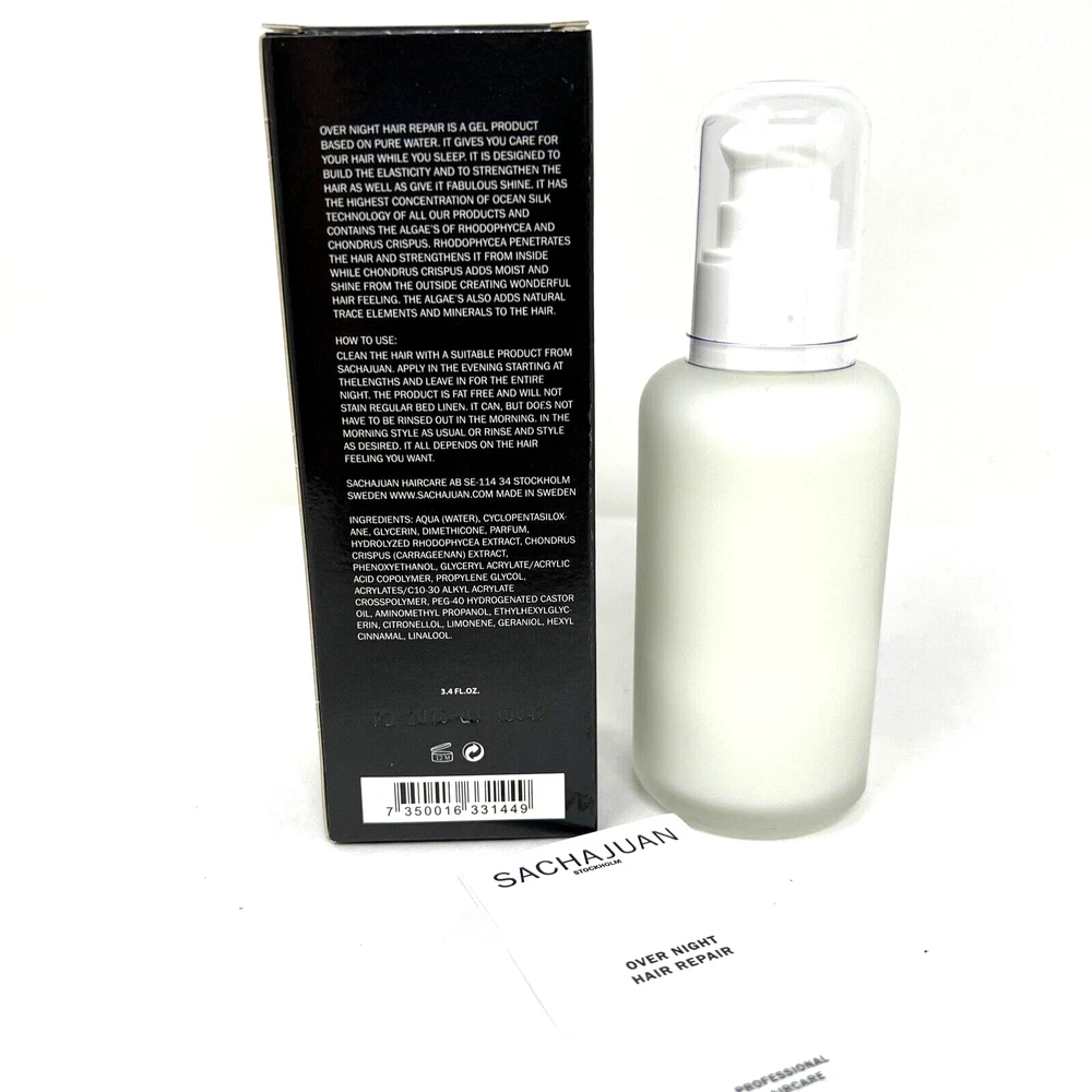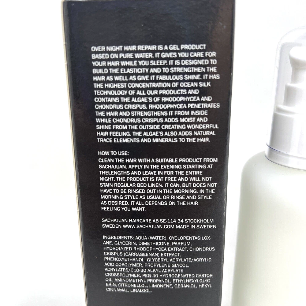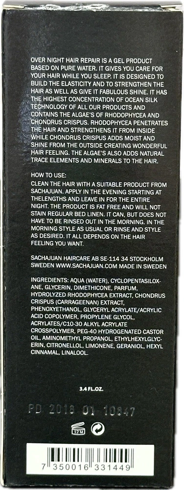 Over Night Hair Repair is a gel product based on pure water. It gives you to care for your hair while you sleep. It is designed to build the elasticity and to strengthen the hair as well as give it fabulous shine. It has the highest concentration of Ocean Silk Technology of all our products and contains the algae’s of Rhodophycea and Chondrus Crispus. Rhodophyceae penetrates the hair and strengthens it from the inside while Chondrus Crispus adds moist and shine from the outside creating a wonderful hair feeling. The algae’s also adds natural trace elements and minerals to the hair. Brand New! You will receive the exact product pictured. How to use APPLY IN THE EVENING STARTING AT THELENGTHS AND LEAVE IN FOR THE ENTIRE NIGHT. THE PRODUCT IS FAT FREE AND WILL NOT STAIN REGULAR BED LINEN. IT CAN, BUT DOES NOT HAVE TO BE RINSED OUT IN THE MORNING. IN THE MORNING STYLE AS USUAL OR RINSE AND STYLE AS DESIRED. IT ALL DEPENDS ON THE HAIR FEELING YOU WANT.