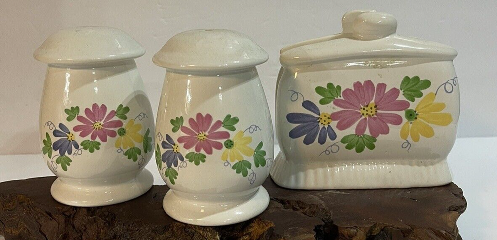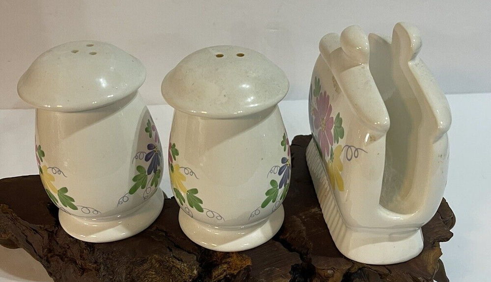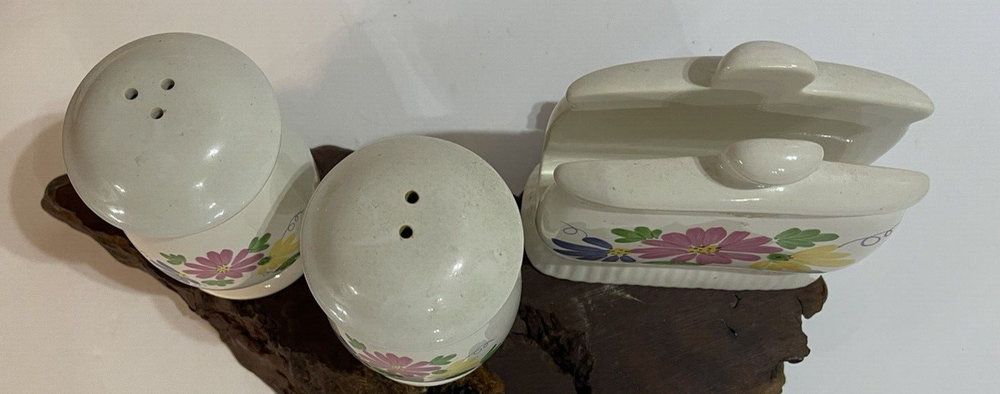 Salt Pepper & NAPKIN HOLDER SET Ceramic Flower Design Pink Yellow Blue...
