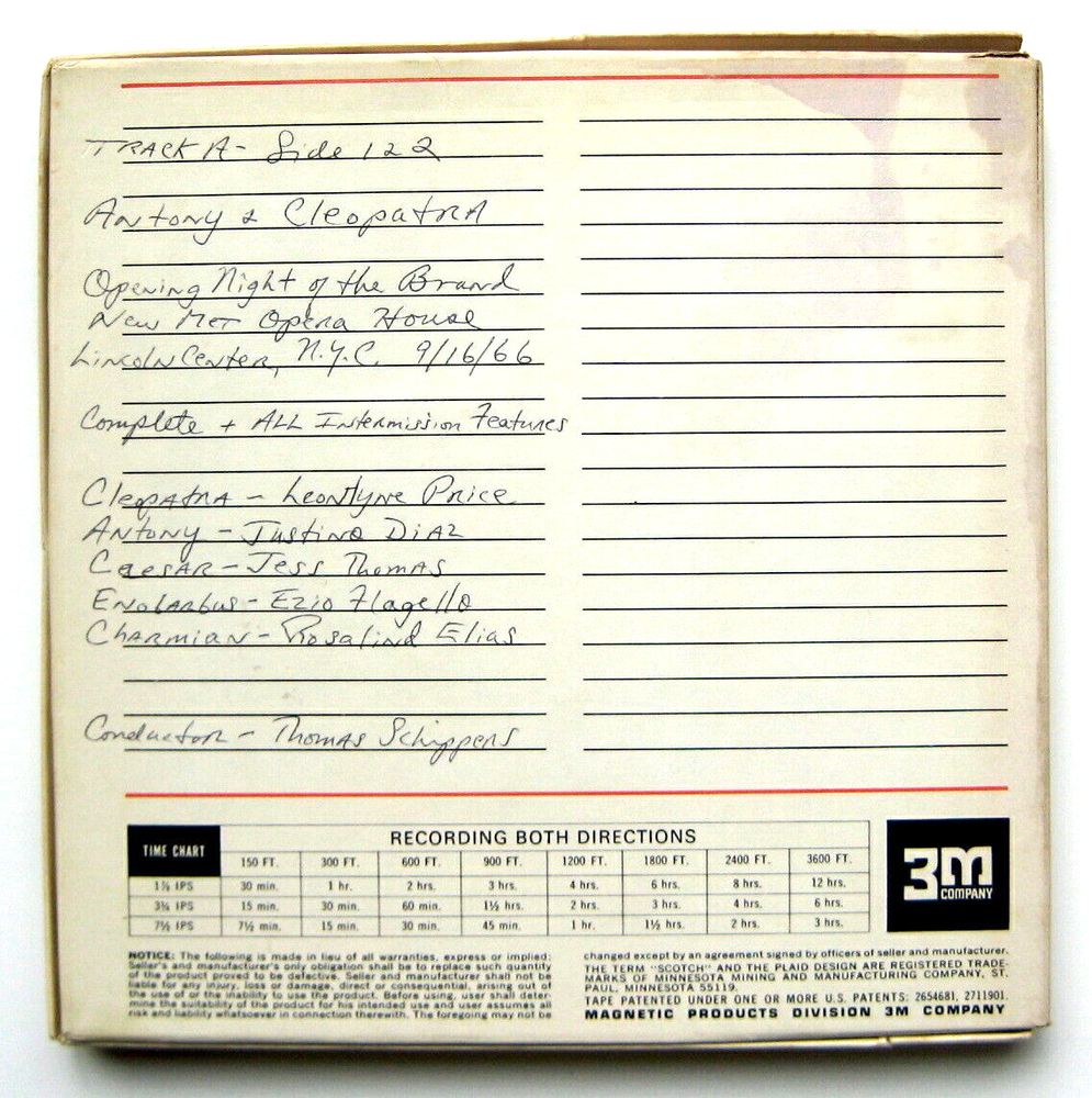 Complete recording of the premiere performance of Samuel Barber's opera Antony and Cleopatra , commissioned for the opening of the new Metropolitan Opera House in New York, September 16, 1966. Professionally transferred to CD at 2X from a mono 3-3/4 ips private tape recording of an AM broadcast on WOR radio, New York. Program commentary by Milton Cross, complete with most intermission features. Playing time approximately 3 hours. Cast includes Leontyne Price, Justino Diaz, Jess Thomas, Ezio Flagello and Rosalind Elias. Conducted by Thomas Schippers. Sound quality is good, within the sonic limits of an AM broadcast. Discs are spot auditioned and guaranteed to play. Includes b/w copy of notes written on tape box (see photo). USPS Ground Advantage shipping/tracking (domestic US only). eBay international shipping.